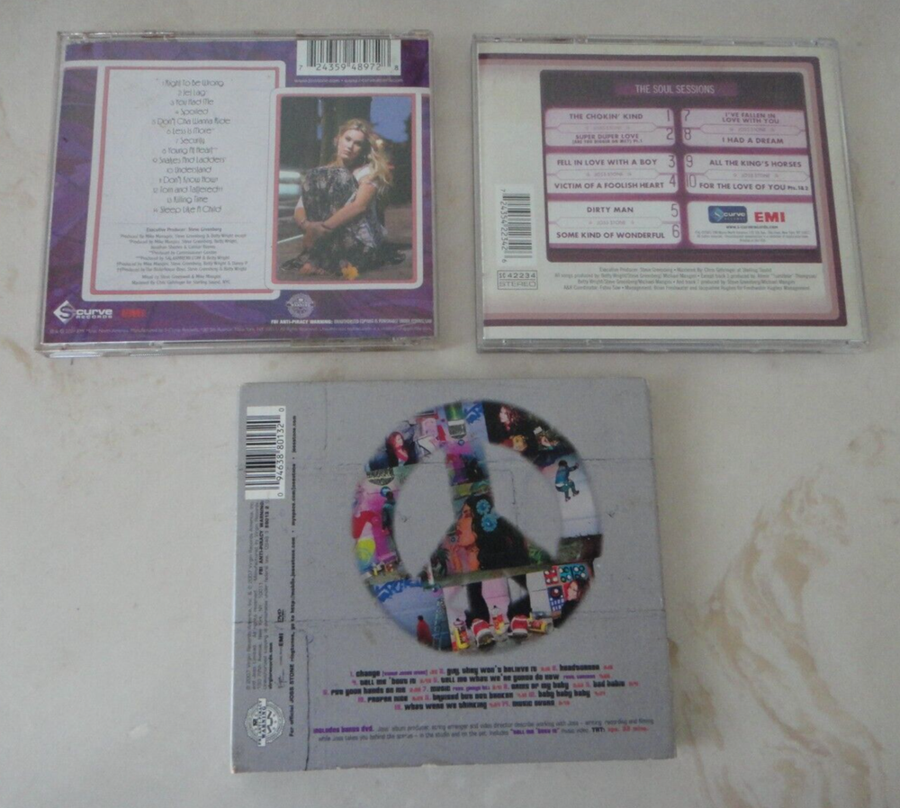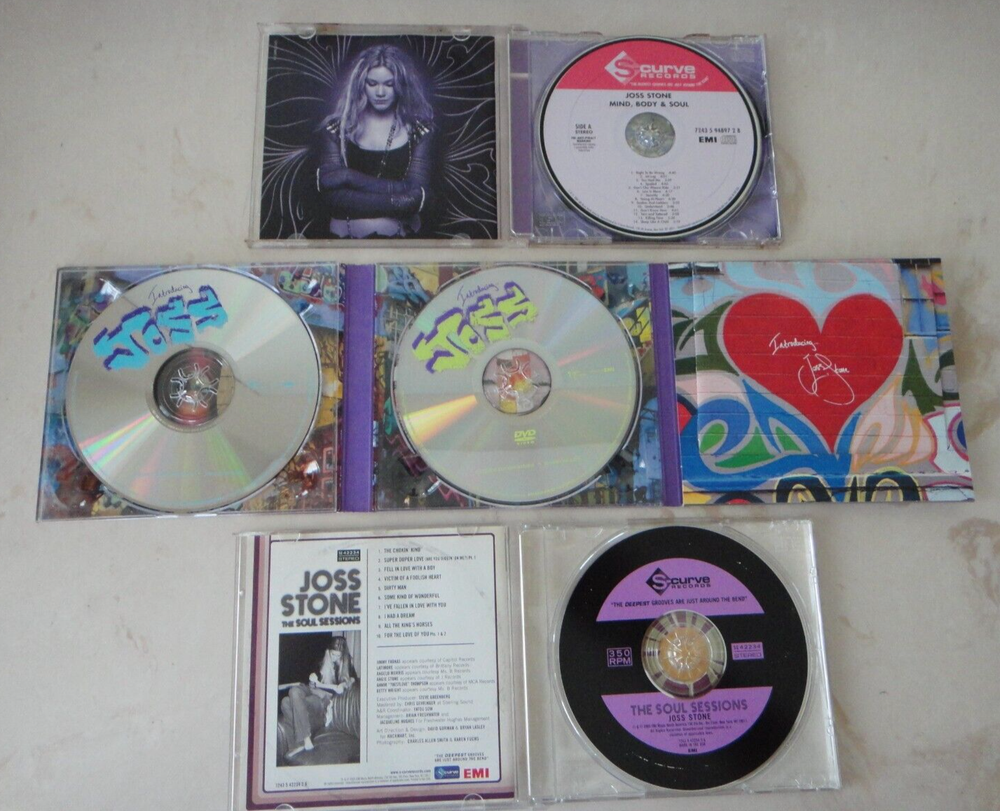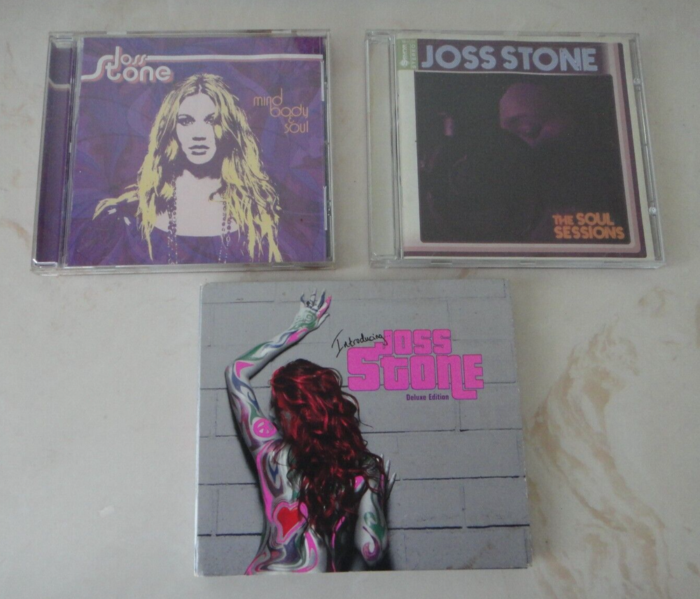 Up for sale is a Lot of the following THREE (3) albums on CD by R&B/Soul/Pop icon JOSS STONE – (1) THE SOUL SESSIONS (10 tracks, 2003); (2) MIND BODY & SOUL (14 tracks, 2004); and (3) INTRODUCING JOSS STONE [DELUXE EDITION: 2-Disc CD/DVD] (14 tracks, 2007). All the discs are scratch-free. U.S. bidders are welcome. Shipping and handling within the U.S. will be FREE. Good luck.