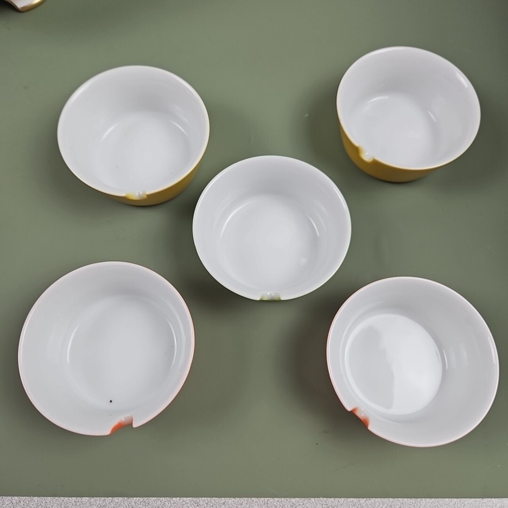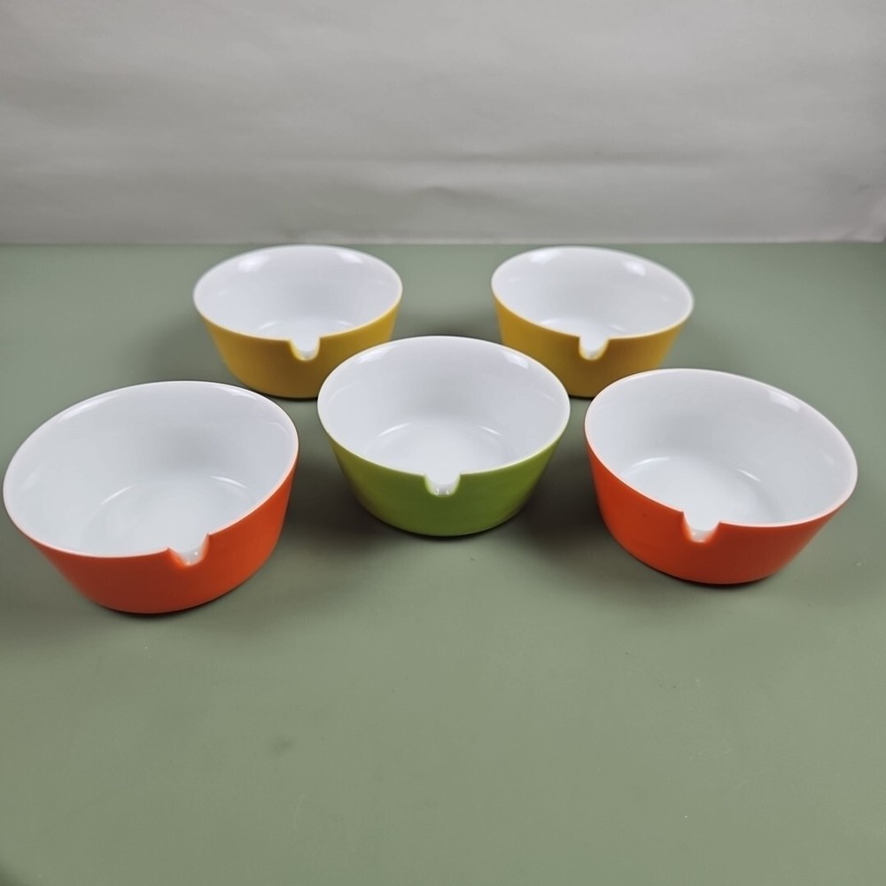 This lot of five ceramic ashtrays is a must-have for any collector of vintage tobacciana. No cracks, chips, or fading. With their vibrant green, orange, and yellow colors, these ashtrays are sure to brighten up any collection. Made in the 1960s, they are a great example of mid-century modern style. Perfect for holding ash or cigarettes, these ashtrays are both functional and decorative. Their unique designs and colors make them a great addition to any collection, and their vintage status adds a touch of nostalgia. Don't miss out on the chance to own these colorful pieces of history.