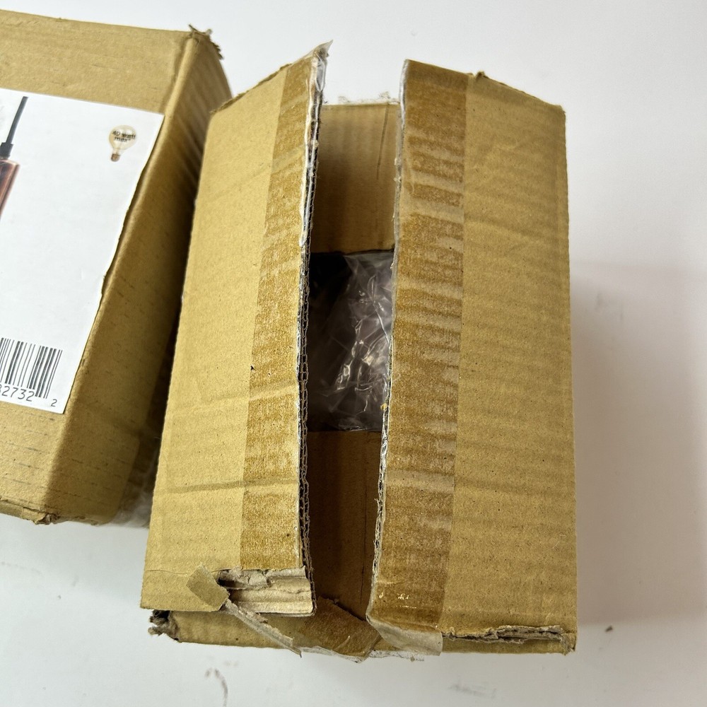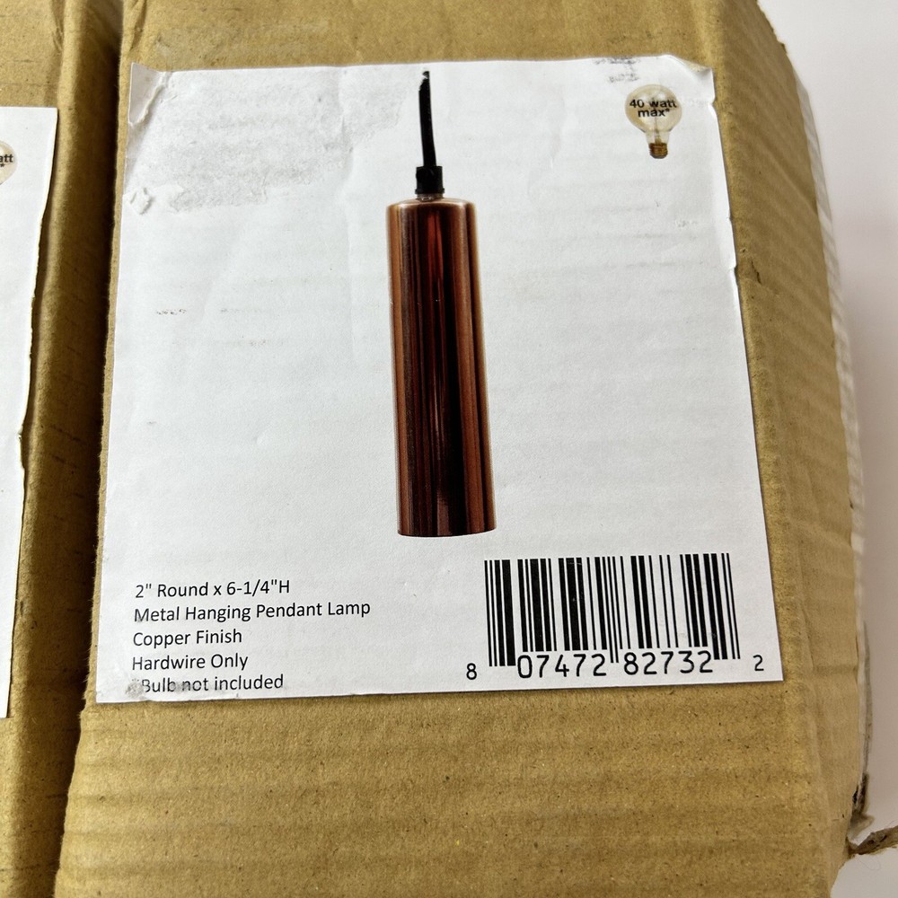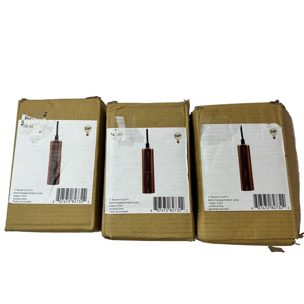 Lot of 3 Creative Co-Op Metal Hanging Pendant Lamp With Copper Finish *These are new in box, however, one of them is an open box. Bulbs not included. Please see all photos. Features: Metal w/ copper finish Electric Hanging 2” round x 6 ¼ inc height Hardwire only