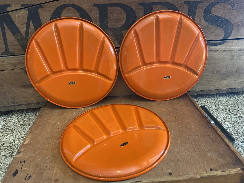 3 vintage enamel fondue plates as shown; each one measures 9" across. Excellent, unused condition with original "Made in JAPAN" labels affixed to the back. b2 My home is smoke free. Please let me know...