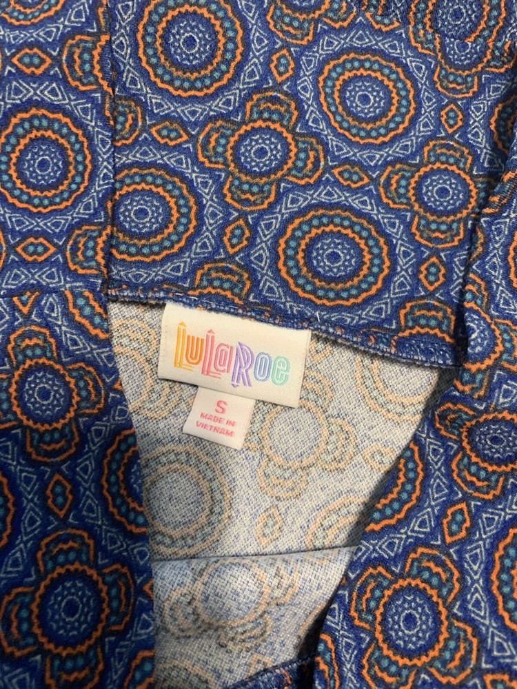 LuLaRoe Cassie skirt. Gorgeous skirt with orange and blue colors. Size small. Approx measurements lying flat: 13” waist, 24” length. 95% polyester, 5% spandex so skirt does have stretch to it. From a smoke free home.