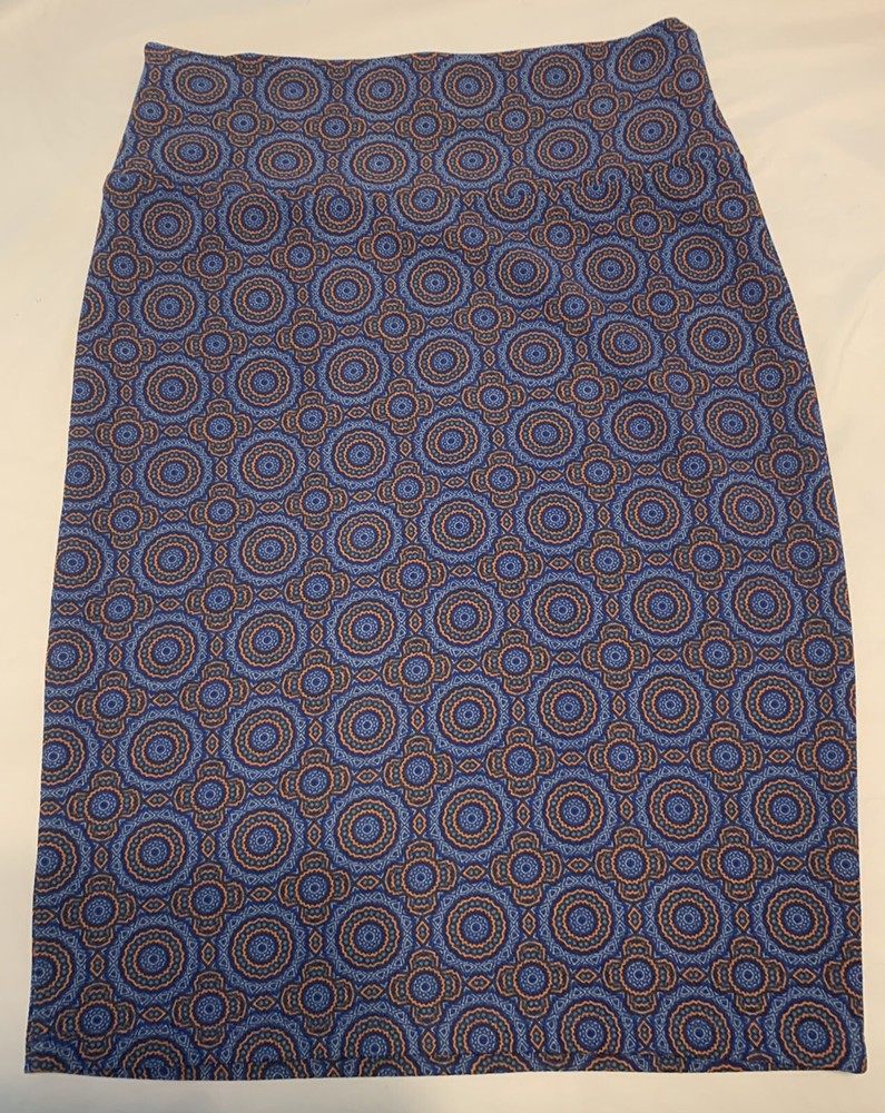 LuLaRoe Cassie skirt. Gorgeous skirt with orange and blue colors. Size small. Approx measurements lying flat: 13” waist, 24” length. 95% polyester, 5% spandex so skirt does have stretch to it. From a ...