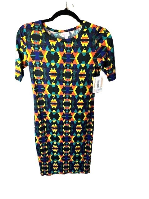 LuLaRoe Julia Sheath Dress Size Medium Form fitting, knee-length, knit dress with mid-length sleeves and a high neckline Colorful Geometric Black Blue Green Orange 96% Polyester, 4% Spandex New With T...