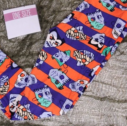Get ready to scare this Halloween with these LuLaRoe leggings! Featuring a playful striped pattern in orange and purple, these full-length leggings are perfect for any fan of the holiday. The material is a comfortable blend of 92% polyester and 8% spandex, making them easy to move in and wearable all day long. The mid-rise waist and petite size type make them flattering for any body type, while the LuLaRoe product line ensures high quality. These leggings are inspired by classic Halloween characters - Frankenstein and The Mummy - making them a fun addition to any festive outfit. Made in China from blended fabric, they are perfect for a Halloween party or just a cozy night in. One Size fits adults size 2-10. Leggings are brand new.