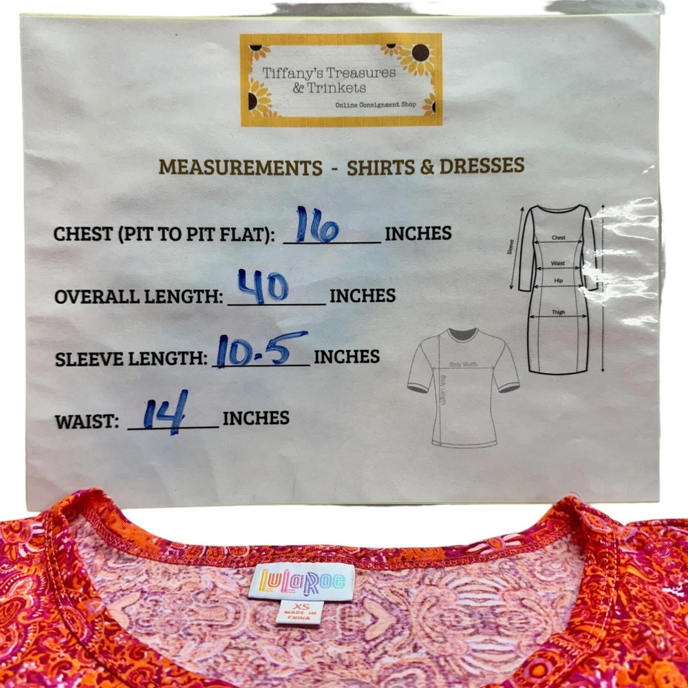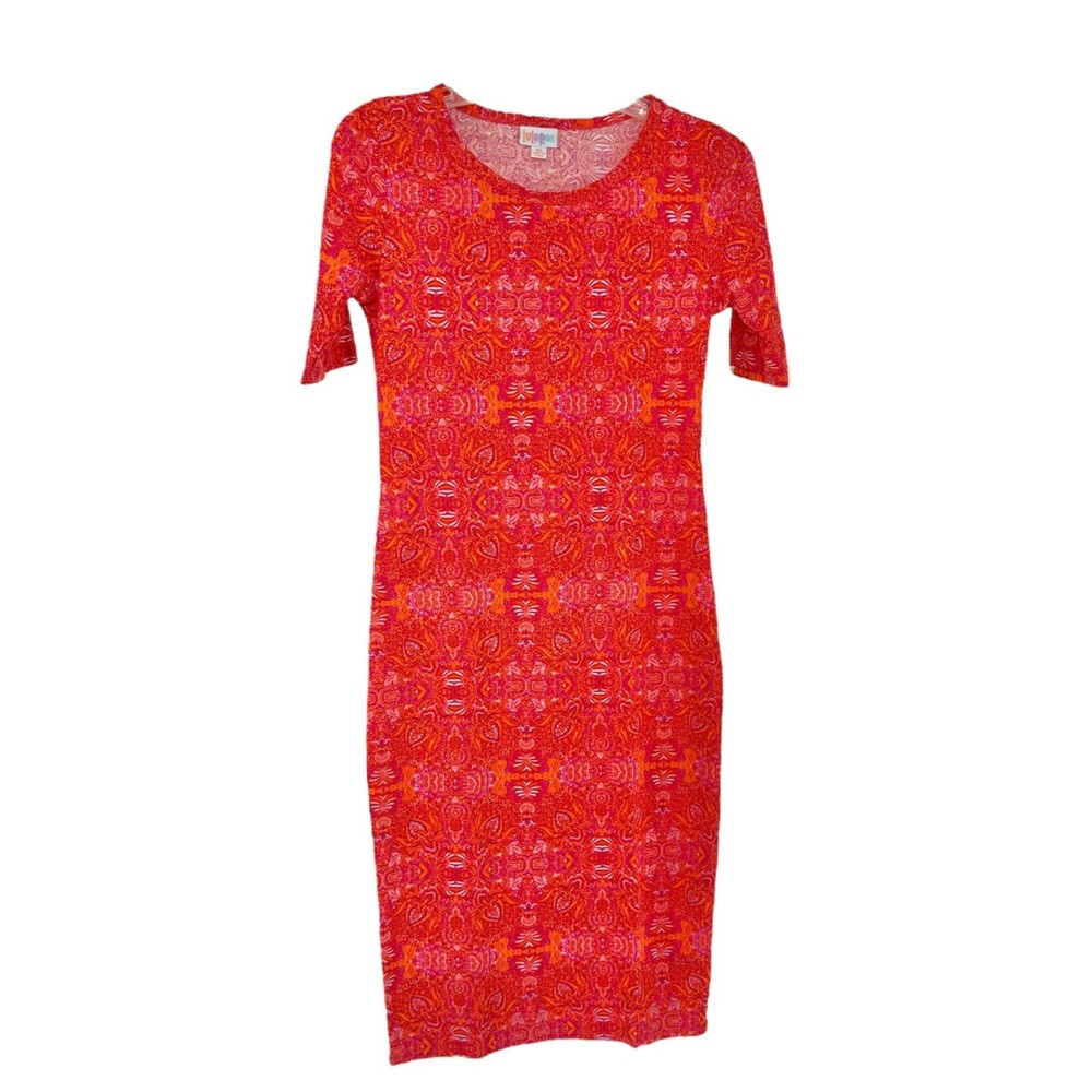 LuLaRoe Retired Julia Dress XS Orange with Fuschia White Graphic Print SS Form Fit NWT The Julia is a form fitting, knee-length, knit dress — with mid-length sleeves and a high neckline. Its simple silhouette makes it the perfect canvas for layering and accessorizing. And of course, boasting versatility and style, it’s a staple for every season’s wardrobe. A feminine and flattering outfit for any occasion, it’s possible you may never want to take it off. Features: • Form fitting knit dress • Mid-Length Sleeves, High Neckline • Comes in Original Packaging • Color/Pattern: Orange with Fuschia White Graphic Print • Material: 96% Polyester/4% Spandex • Mid-length sleeves, High Neckline, Form Fitting • Orange with Fuschia and White Graphic Print • Made in China • Machine Wash Cold, Hang to Dry Size: Womens XS Measurements: Chest (laying flat): 16 in / 41 cm Waist (laying flat): 14 in / 36 cm Total Length (back): 40 in / 102 cm Sleeve Length: 10.5 in / 27 cm Condition: New With Tags Tiffany's Treasures and Trinkets is an online consignment shop that packages each order like a gift to a friend! We hope you enjoy our fun, functional and fascinating finds!