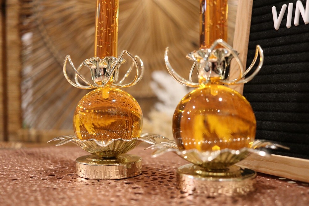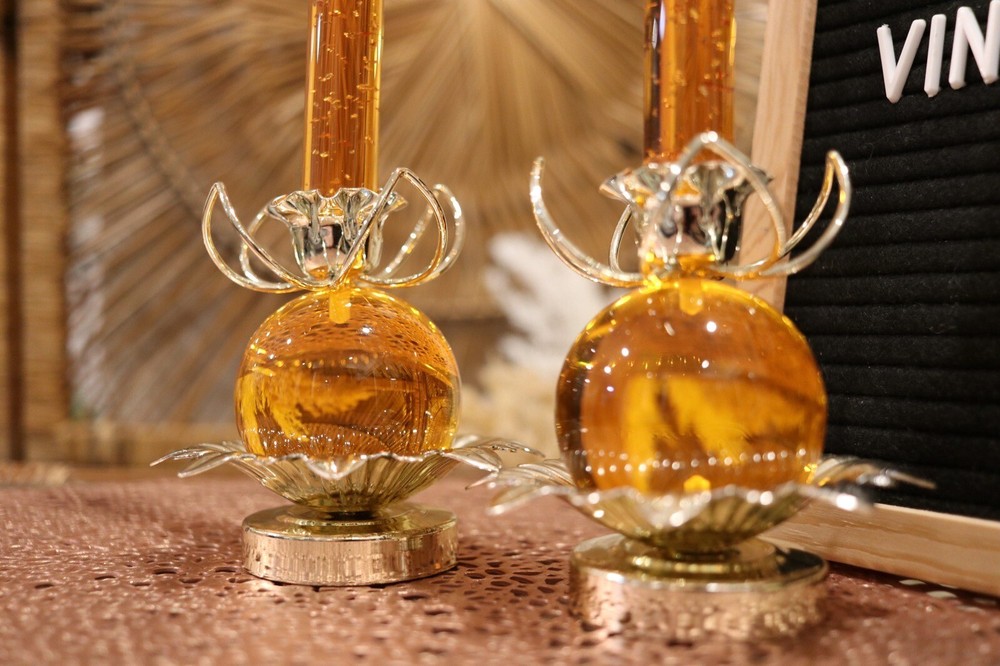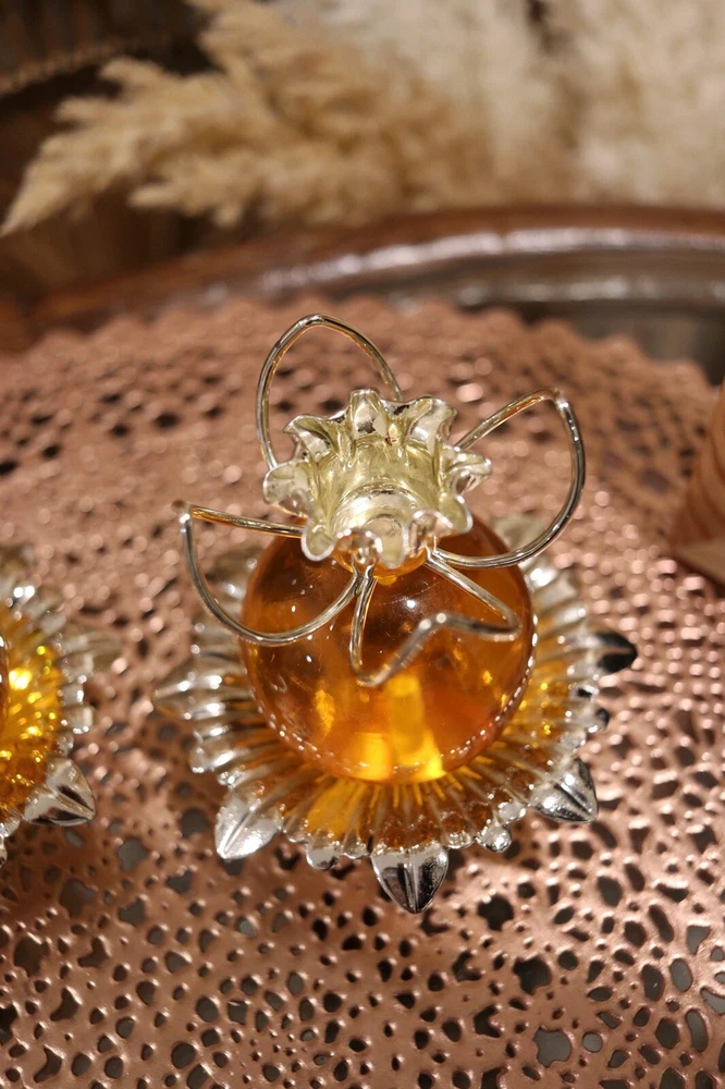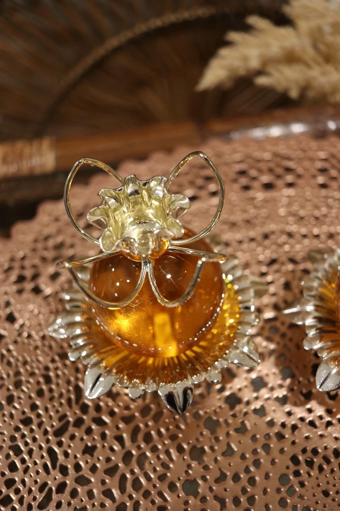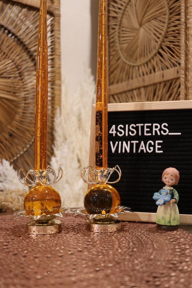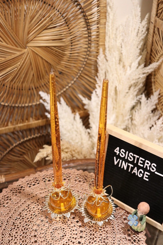 Add a pop of colour to your mid-century modern decor with these vintage lucite candle holders. The set includes two holders in a vibrant orange hue with a metallic finish, perfect for adding a touch of glamour to your space. The holders feature a sleek design with a combination of lucite and metal materials, making them both stylish and durable. These candle holders are a great addition to any decorative collection and are sure to impress your guests. The 1960s style adds a retro vibe to your home, while the International brand ensures quality craftsmanship. Whether you use them for candles or simply as decorative pieces, these vibrant orange lucite candle holders are a must-have for any mid-century modern enthusiast. Note: candles not included.