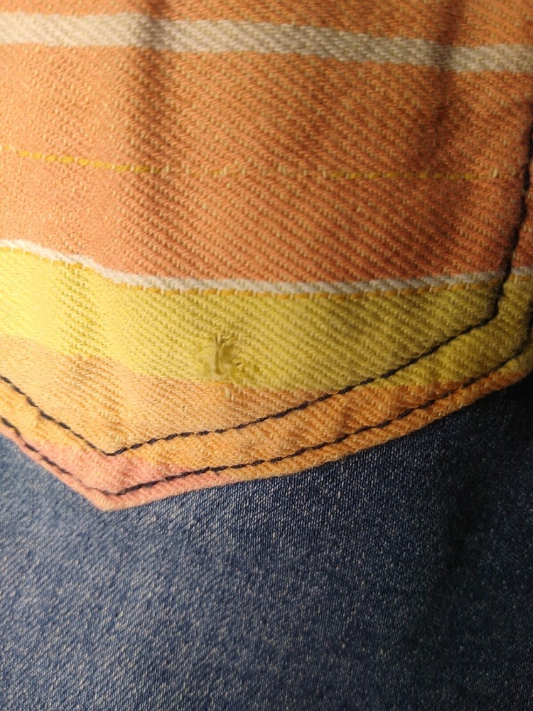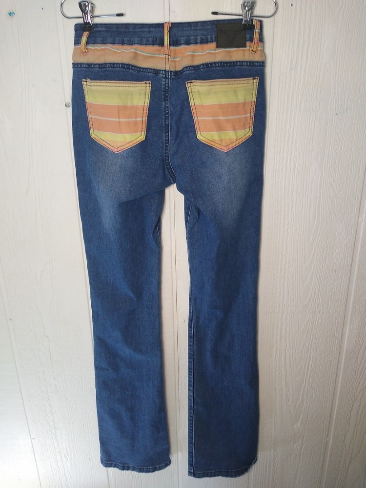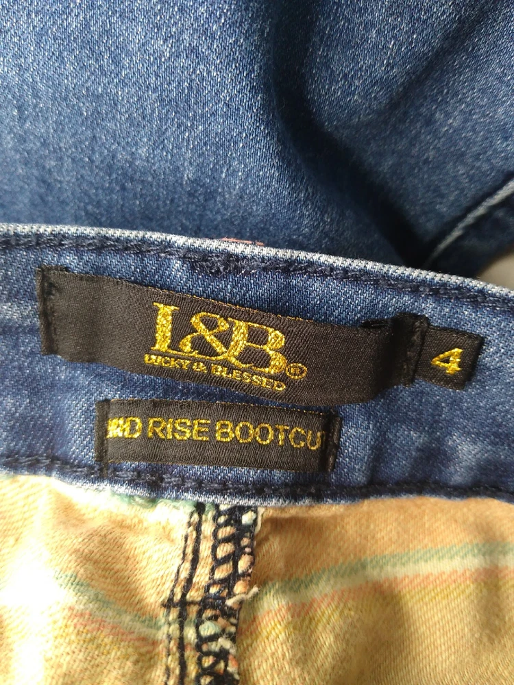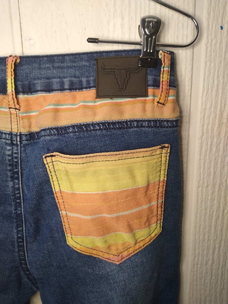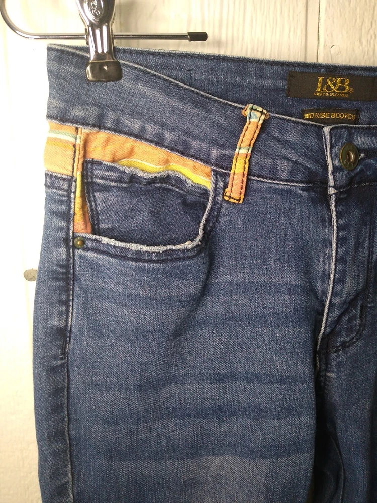 L&B Lucky & Blessed Jeans Women's Size 4 Mid Rise Bootcut Multicolor Orange Stripe Pockets and Trim Cotton Polyester Spandex Viscose Stretch Measure: Waist 28" Rise 9" Inseam 33.5" Leg Opening 16" Pre-owned. So cute! They do have a small hole on the left back pocket as shown in picture. Ships with tracking and care sent out by next business day!