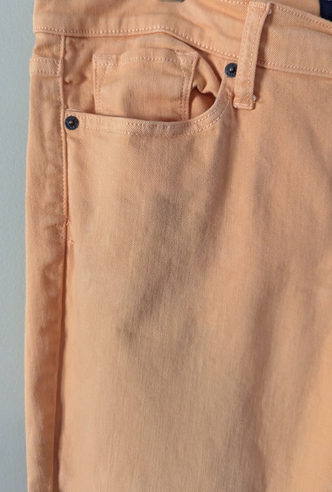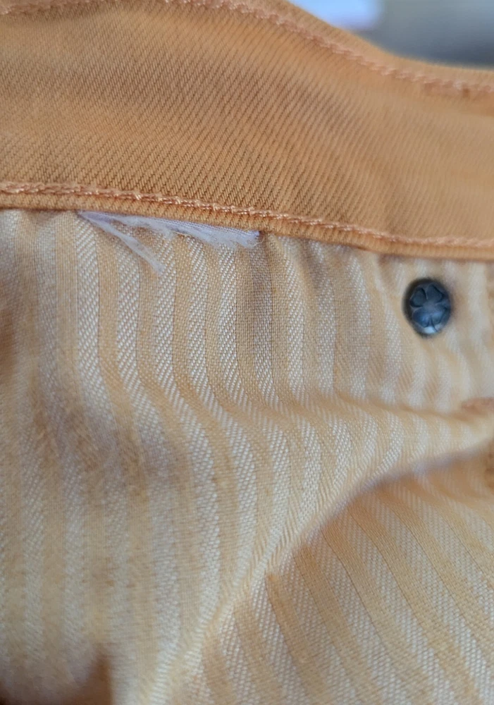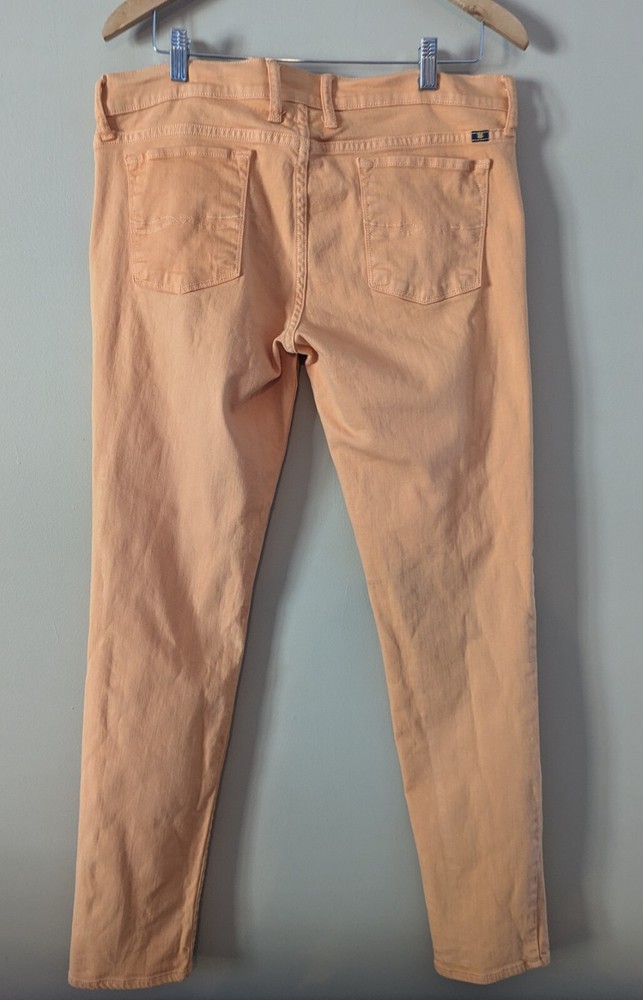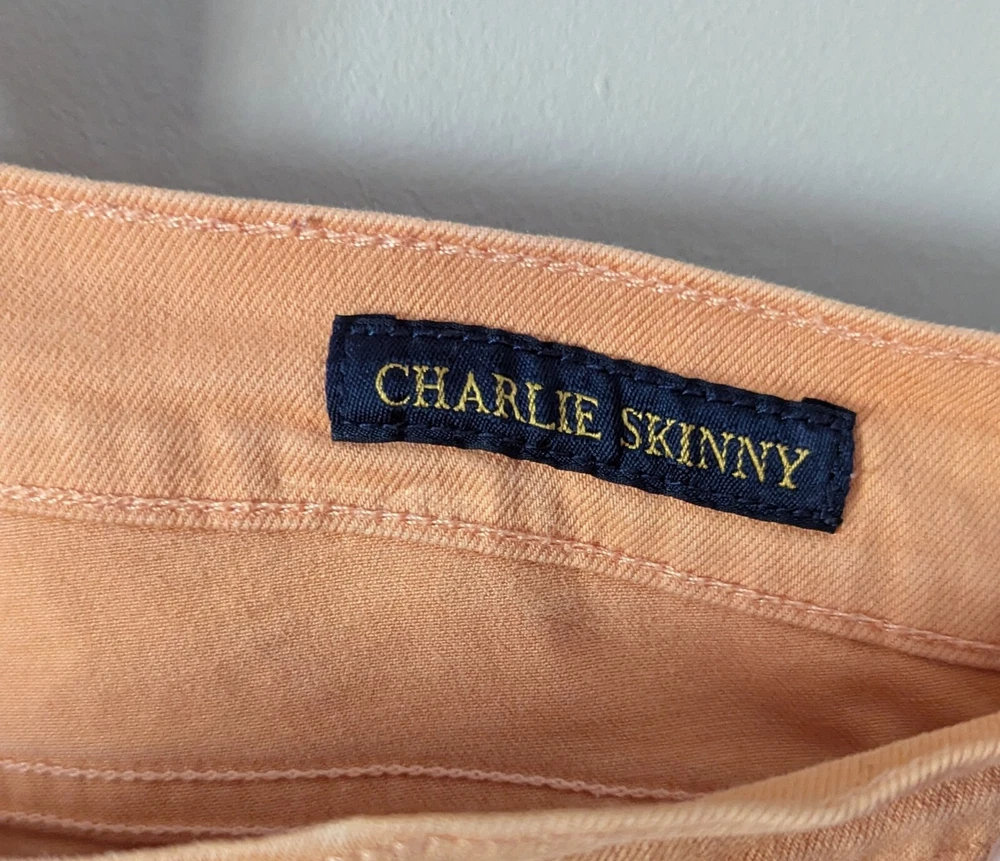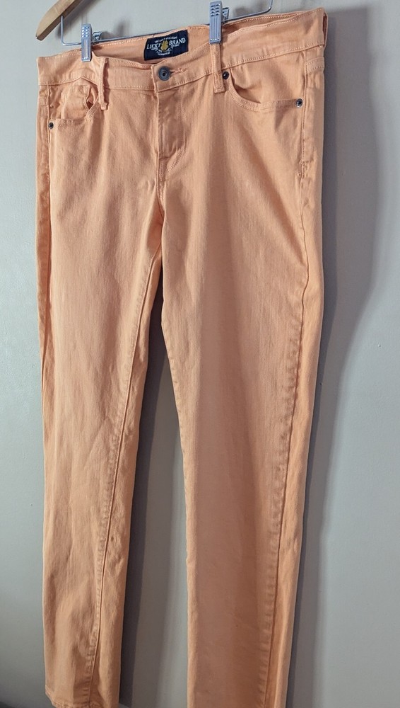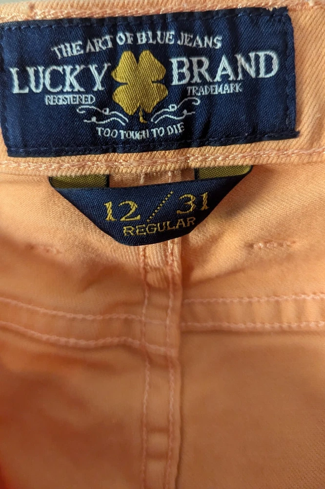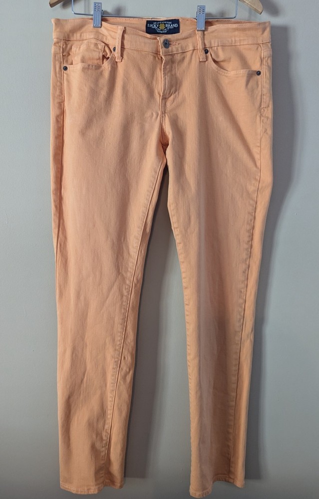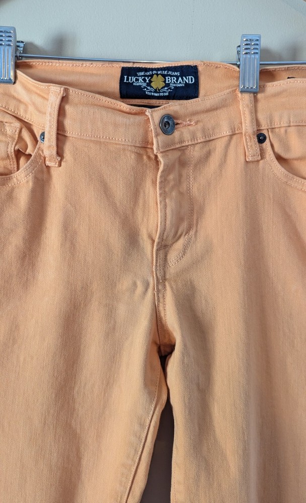 Lucky Brand Charlie Skinny orange jeans size 12/31 regular. This item is pre-owned in good condition and washed. The information tag is missing on this item. Approximate measurements are 9" rise, waist 37", and 31" inseam. Thank you for taking a look!