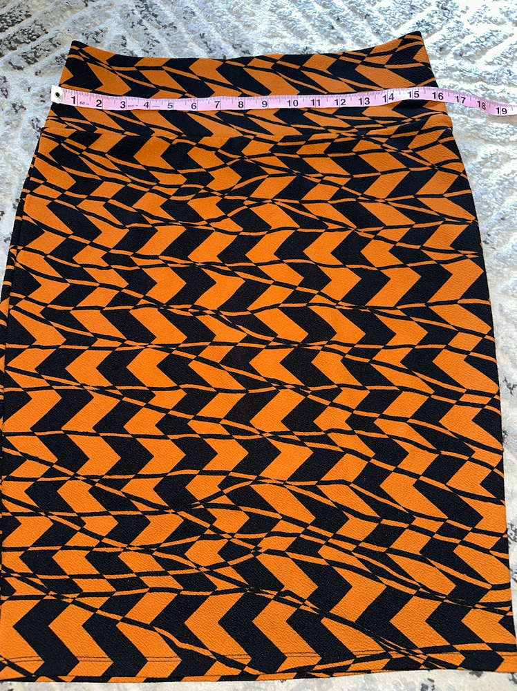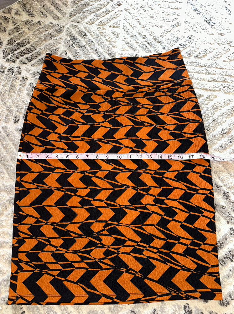 Elevate your wardrobe with this stunning LuLaRoe pencil skirt in black and orange chevron geometric pattern. Perfect for any occasion, this knee-length skirt boasts a straight and pencil style that flatters the figure. Made for women in size L, this skirt is an excellent addition to any wardrobe. The black color complements the orange chevron, making it a versatile piece for any outfit. This skirt is perfect for pairing with your favorite blouse or top for a chic and sophisticated look. Condition: nwot / new without tags / no flaws