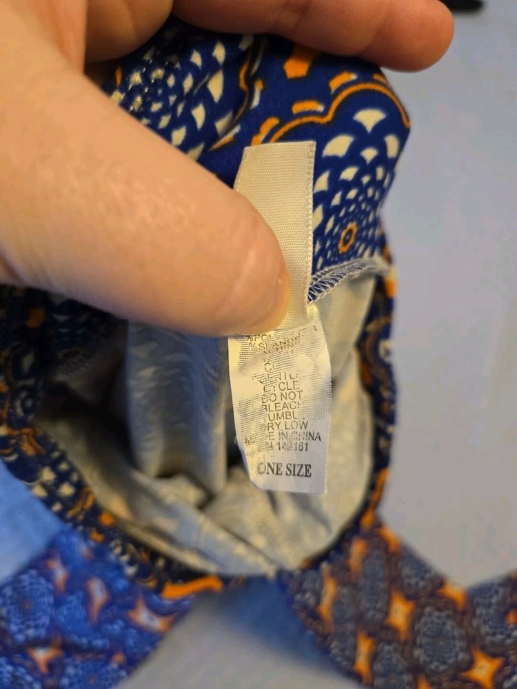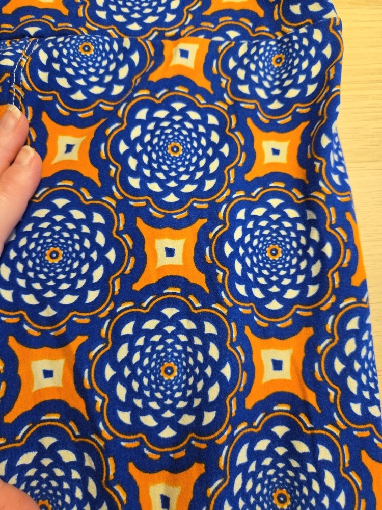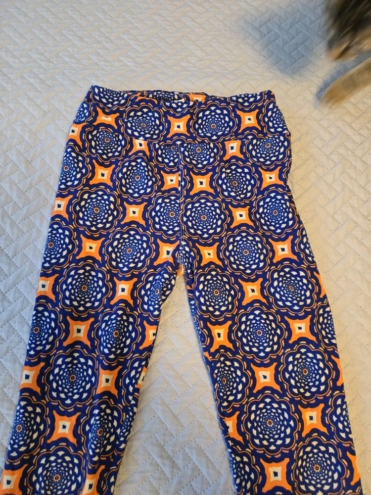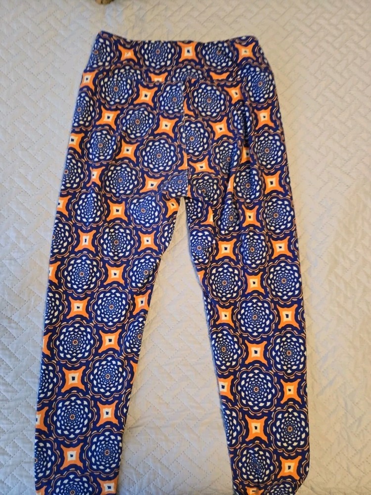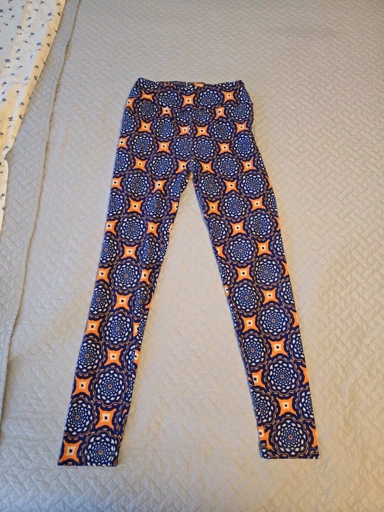 This is a pair of LuLaRoe women's leggings in a blue and orange Aztec geometric pattern. The leggings are one size with a 24-inch waist size and a mid-rise fit. They are made of a polyester blend knit fabric with an elastic waist for comfort. The ankle-length leggings have a 26-inch inseam and are suitable for casual or travel occasions. 3-40
