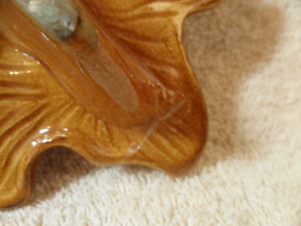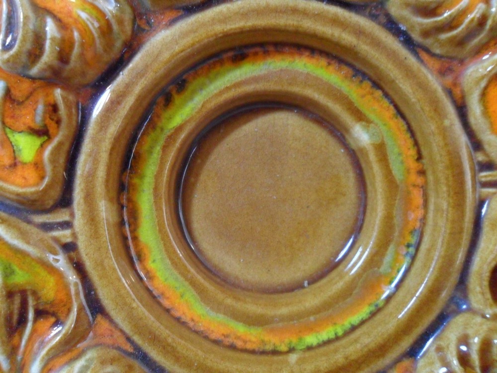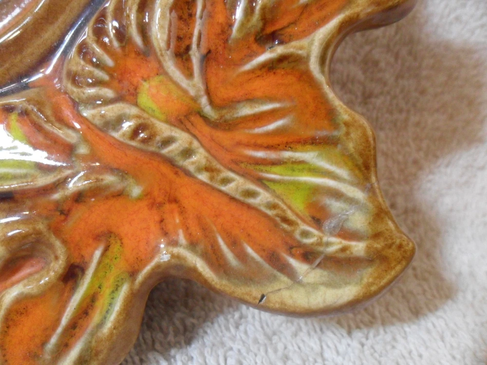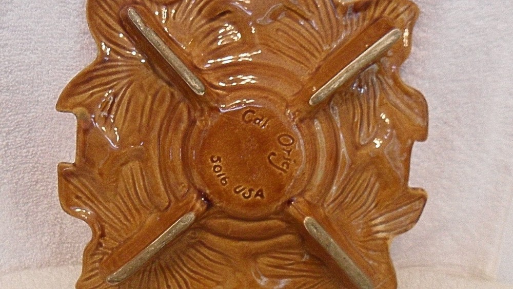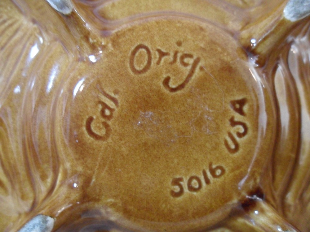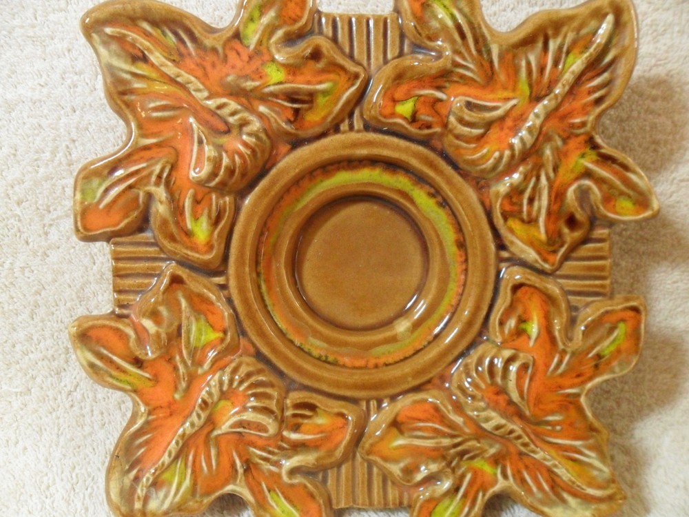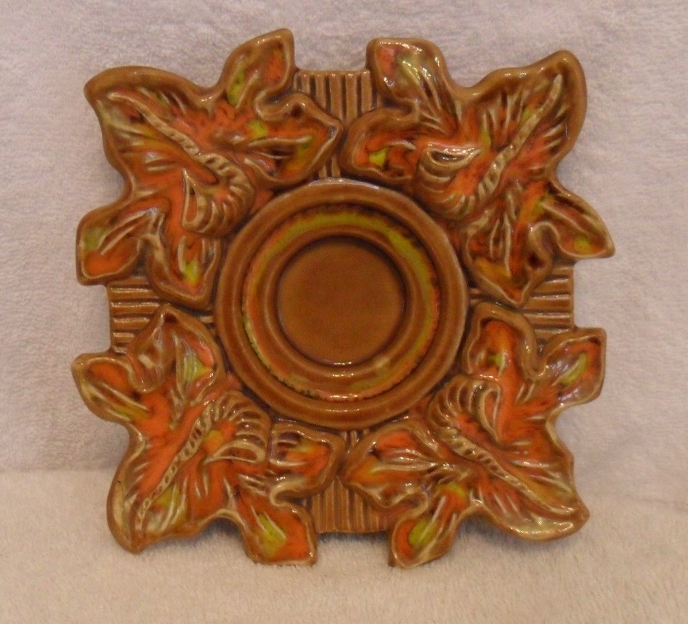 Mid Century Modern Style California Original USA Pottery Measures 8" x 8" x 1 1/2" This Vintage 1960's California Originals can be used as an ashtray, candy dish, candle holder or plant base. Decorated with autumn maple leaves in each of the corners with colors of brown, orange and green. Two inner circles make up the center of this ceramic piece. (inner circle 2 1/4" diameter - outer circle 3 1/4" diameter) Marked "Cal. Orig. 5016 USA" Good vintage condition. No chips or stains. Slight crack and repair on one of the maple leaf tips (see photos). Colors are bright and clear. Very minor surface wear on bottom leg edge. Thank you for your consideration! Have a great day! View more great items