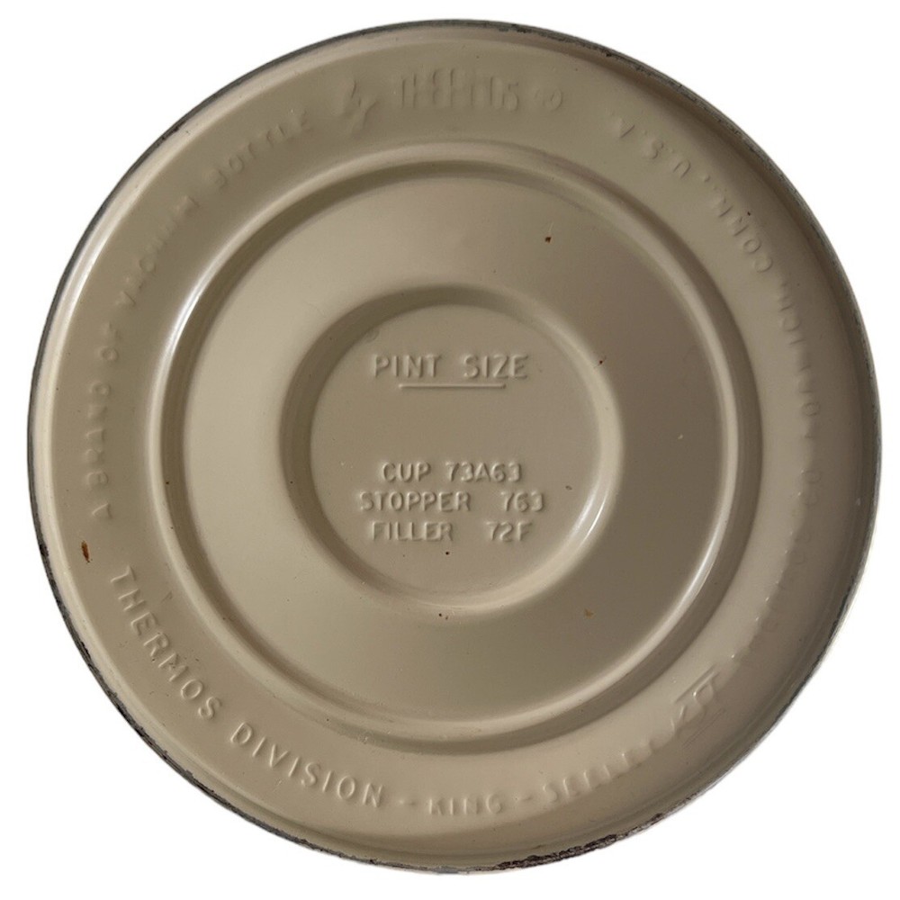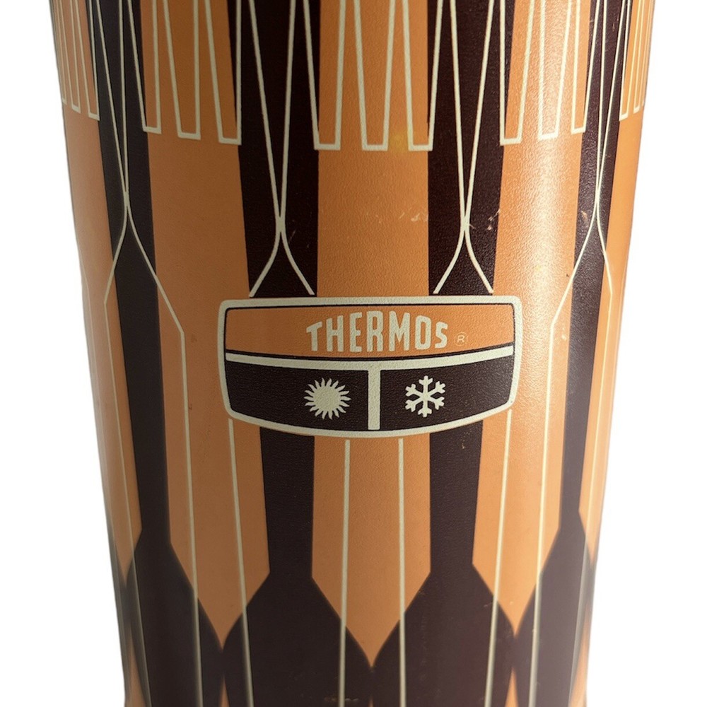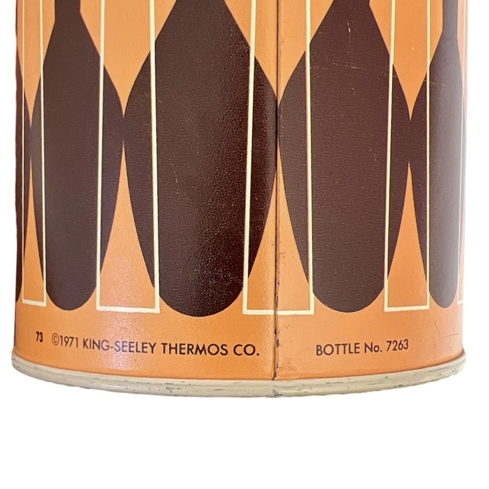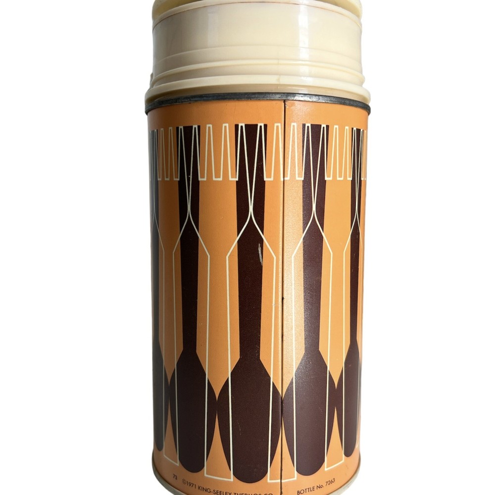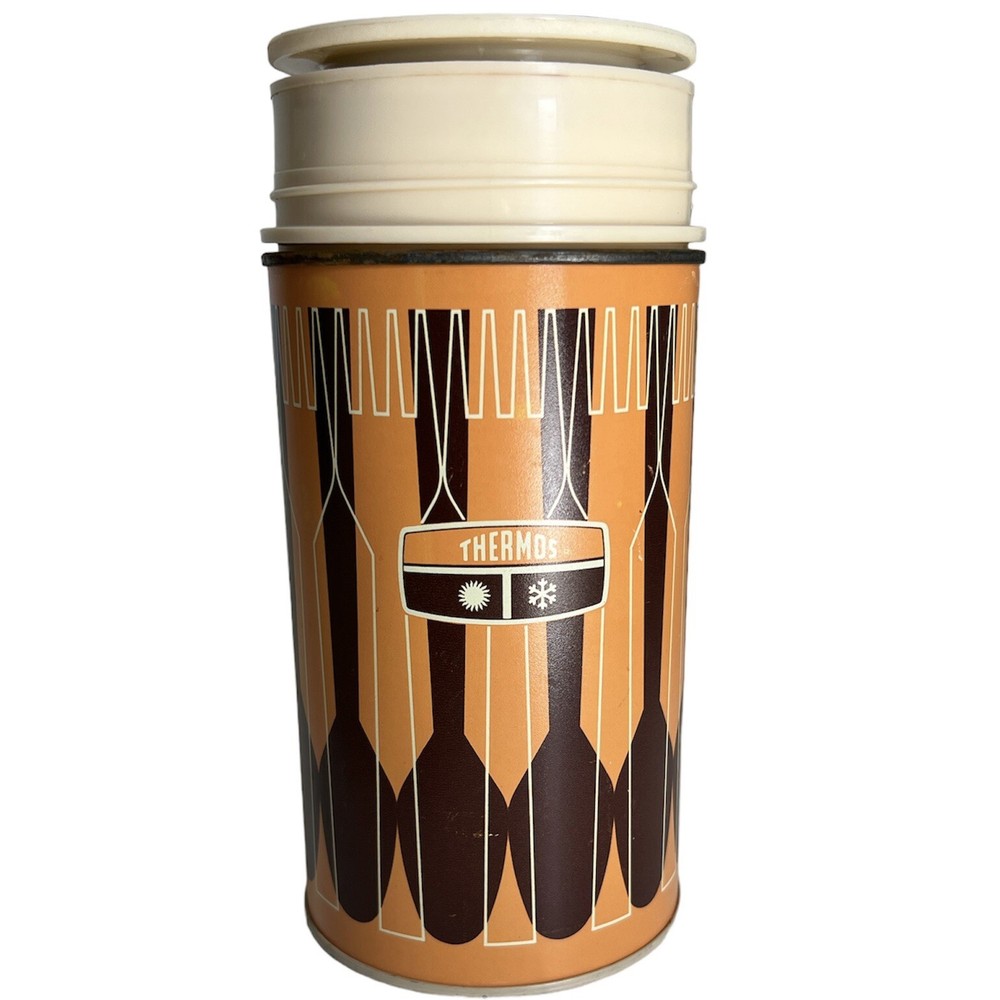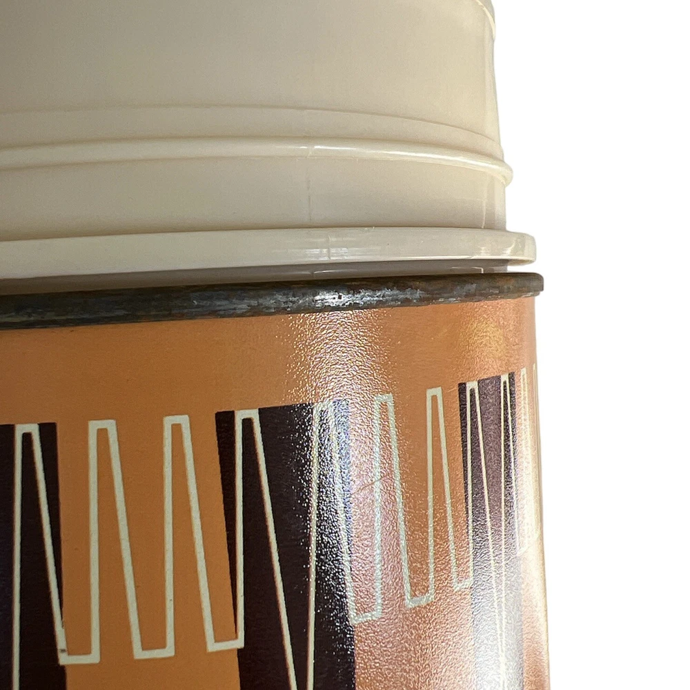 Does not include cap, small amount of rusting on lip of Thermos, pictured. This vintage metal Thermos from 1971 is perfect for collectors and fans of Mid-Century Modern design. The pint size Thermos features a vibrant orange and brown color scheme and is designed for use without a cap. Made by the brand Thermos, this piece is sure to be a standout addition to any collection. The metal construction ensures durability and the Thermos is ideal for keeping your beverages hot or cold on the go.