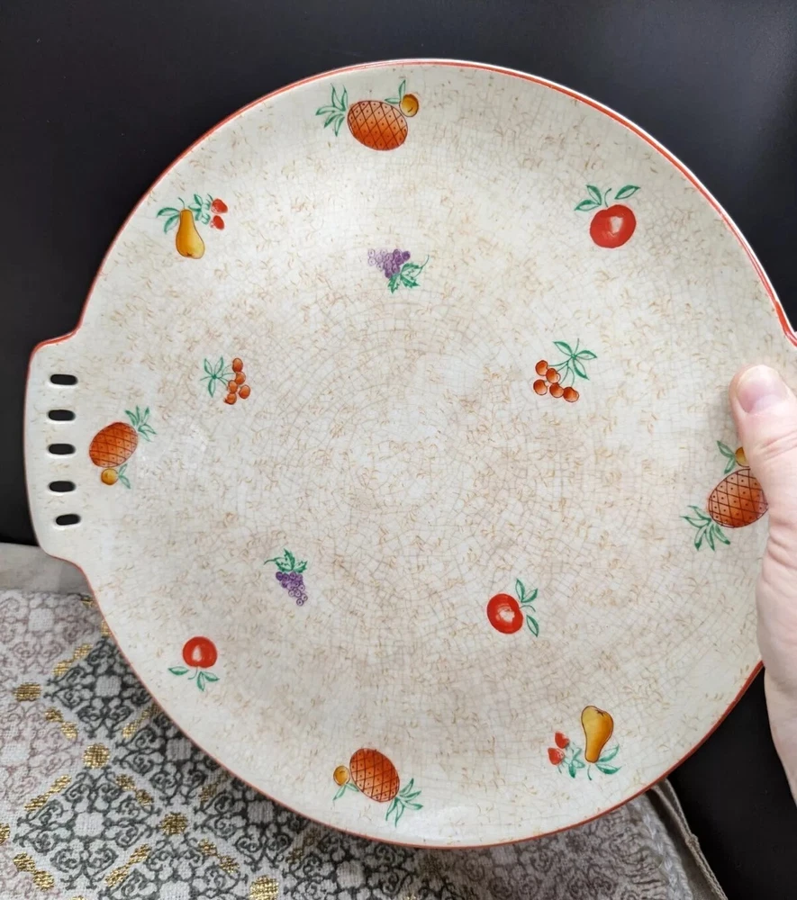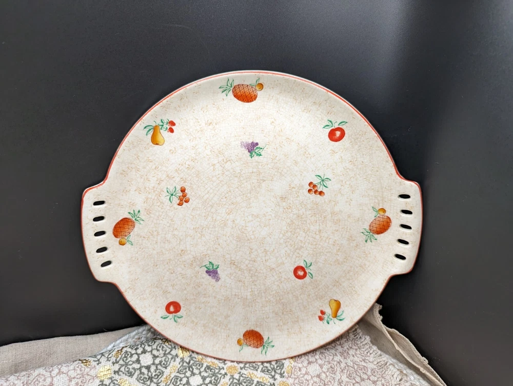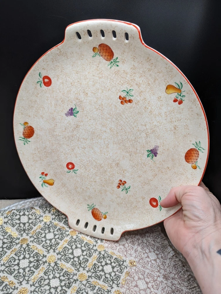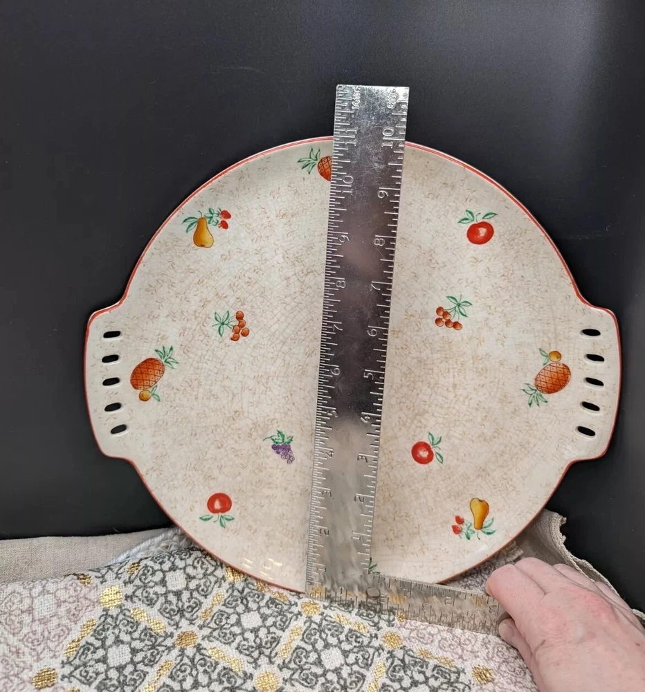 Lovely, festive, mid century modern ceramic platter with reticulated side handles, hand painted fruit varieties, highlighted with a thin red line glaze on the outer rim edge. The fruits are brightly painted in red, green, purple, orange, and the line detail on the pineapple really makes this piece pop. The plate has glaze crazing throughout on both sides and what appears to be a pottery pontil mark on the reverse. Stamped in red 2Japan. Hand wash with mild soap with a soft sponge, otherwise the painted fruit will fade. This is such a fun cute platter either for use or Vintage display accent piece. Please refer to all pictures for sizing and condition. All items are pre-owned and sold as in condition. Feel free to message me with any inquiries. **NO RETURNS** Thanks for stopping by! ✨FUNKY VINGETIQUES ✨