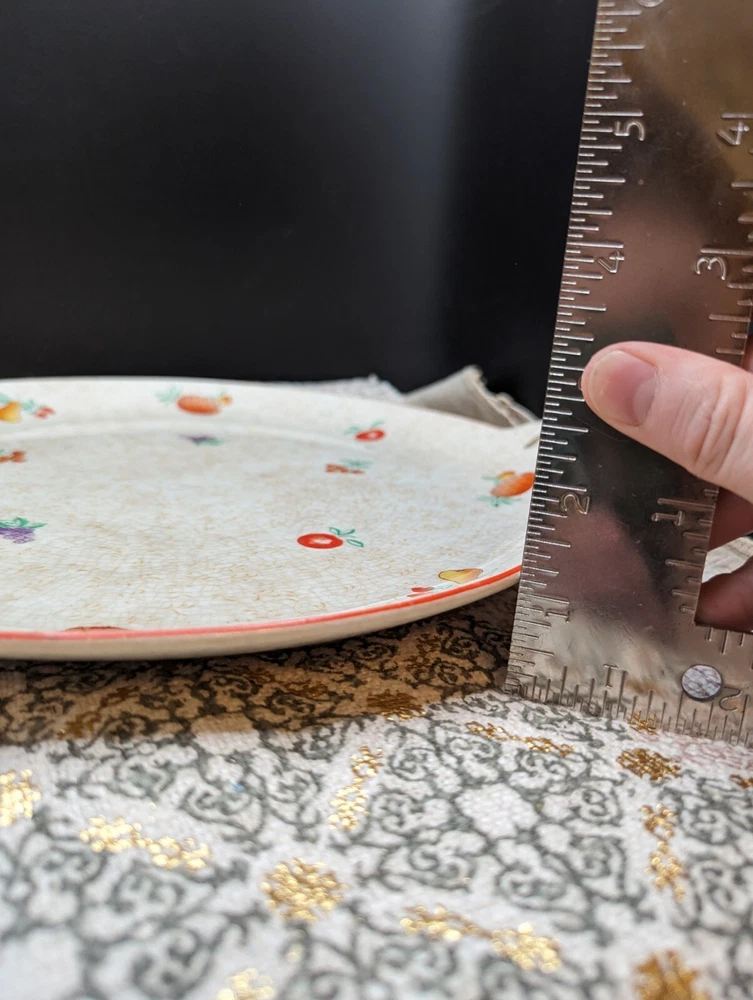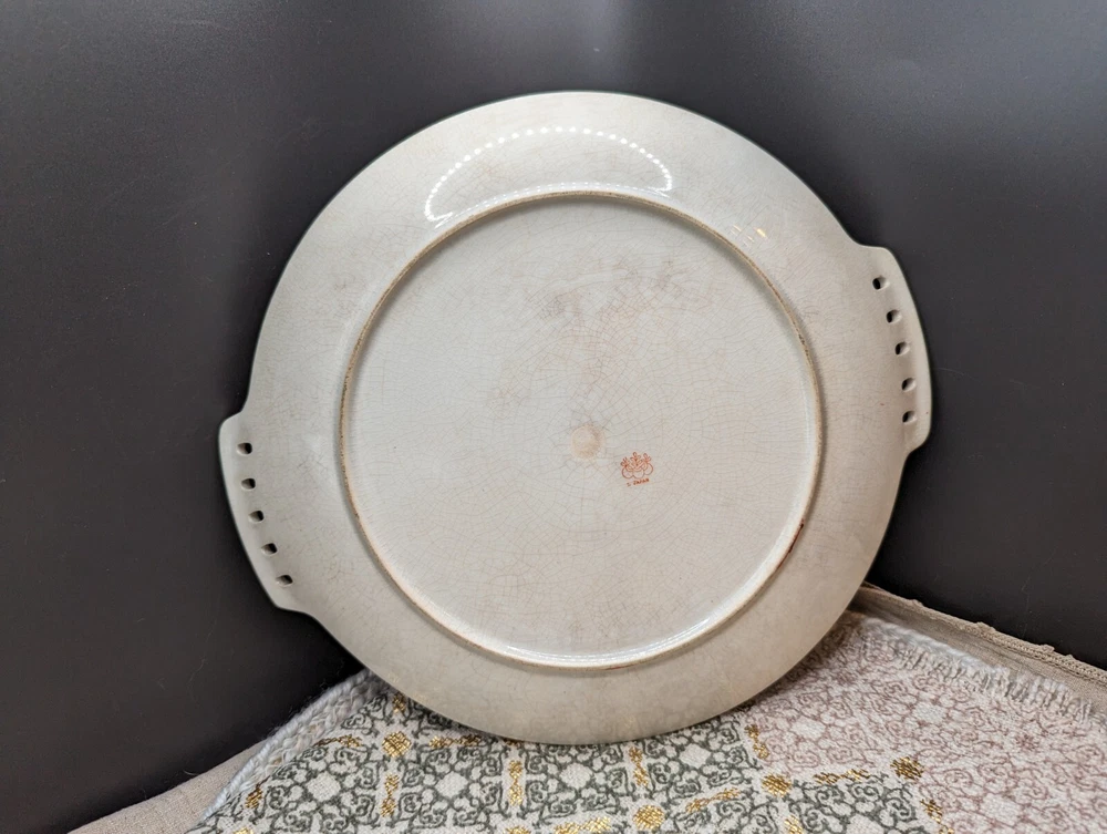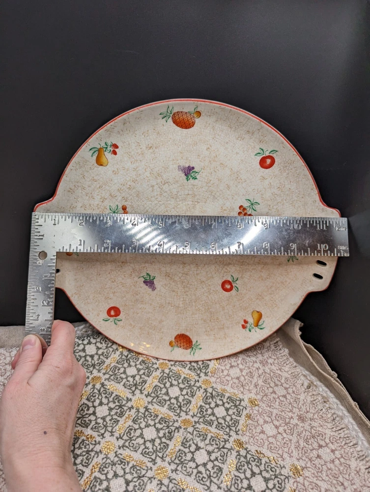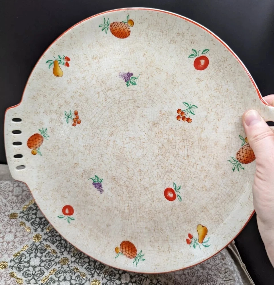 Lovely, festive, mid century modern ceramic platter with reticulated side handles, hand painted fruit varieties, highlighted with a thin red line glaze on the outer rim edge. The fruits are brightly painted in red, green, purple, orange, and the line detail on the pineapple really makes this piece pop. The plate has glaze crazing throughout on both sides and what appears to be a pottery pontil mark on the reverse. Stamped in red 2Japan. Hand wash with mild soap with a soft sponge, otherwise the painted fruit will fade. This is such a fun cute platter either for use or Vintage display accent piece. Please refer to all pictures for sizing and condition. All items are pre-owned and sold as in condition. Feel free to message me with any inquiries. **NO RETURNS** Thanks for stopping by! ✨FUNKY VINGETIQUES ✨