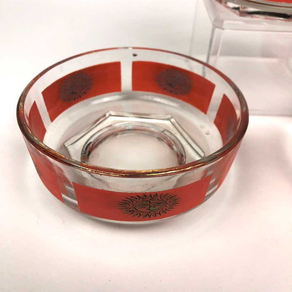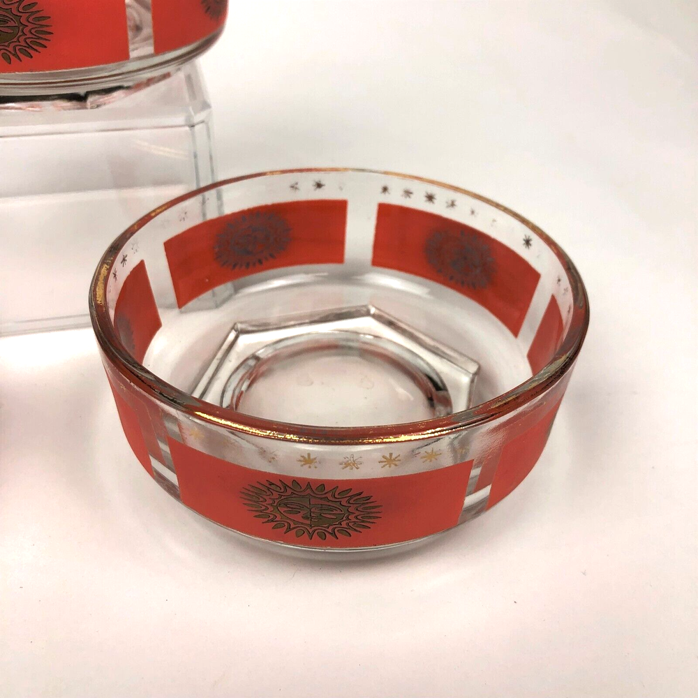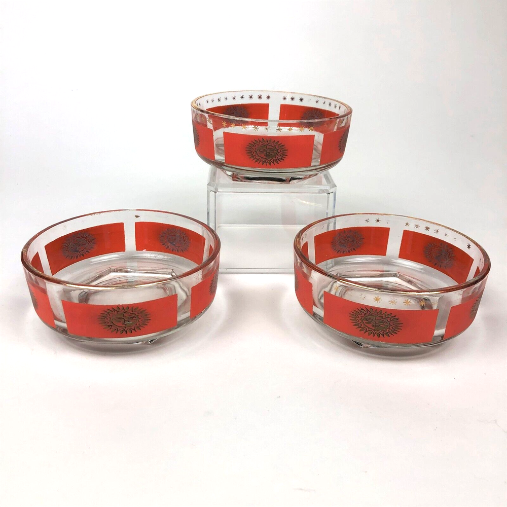 MCM Set of 3 Glass Snack Bowls Orange Gold Sun & Stars Pattern Gold Rim VTG 60's/70's SO RETRO!! Approximately 4.5" x 4.5" x 2" Preowned - Good Condition Looking good for their age! Gold rim & stars have rubbed off in a couple areas GREAT orange color! Please see pictures to best determine condition Any returns should be returned in the same condition as originally photographed and shipped. Returns will be accepted within 30 days of receipt. Please ask any questions, and we will respond as soon as possible. Check out my other listings. All items are from a Smoke-Free Home Thanks for looking!