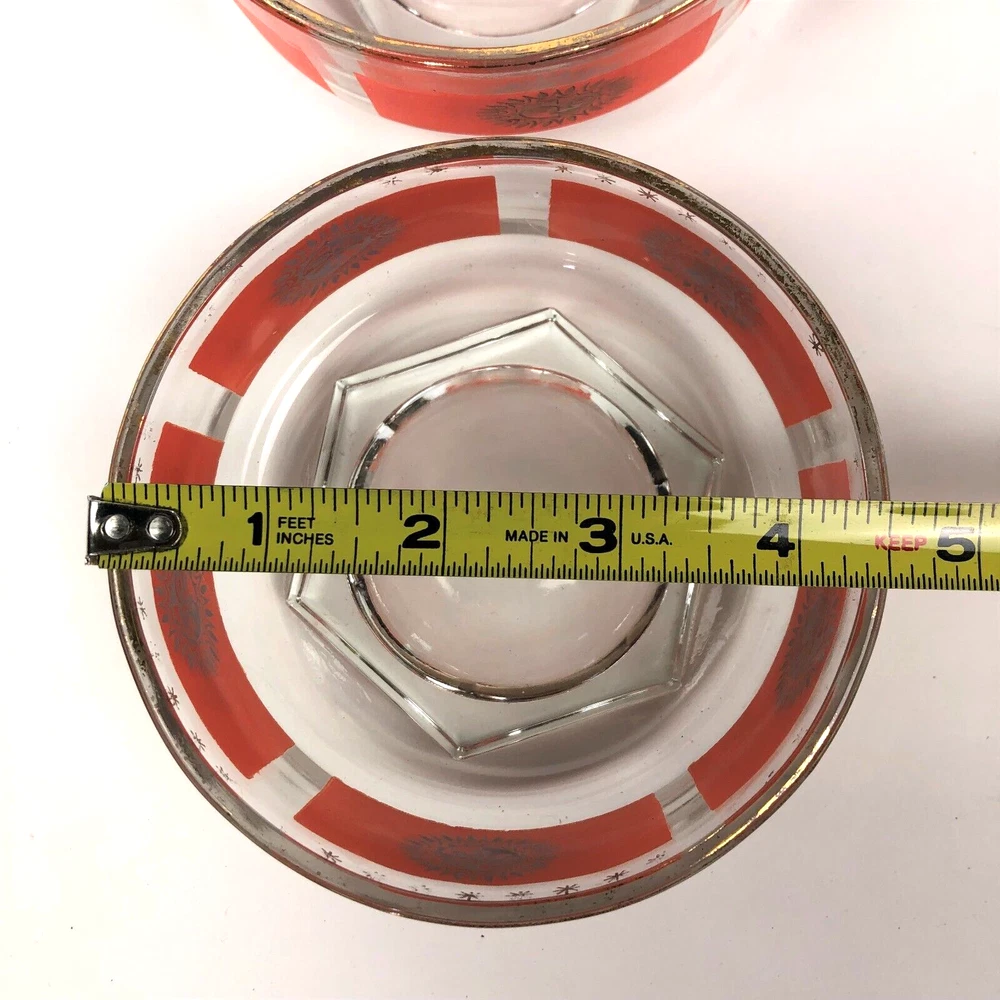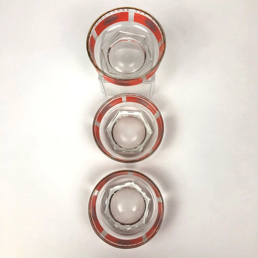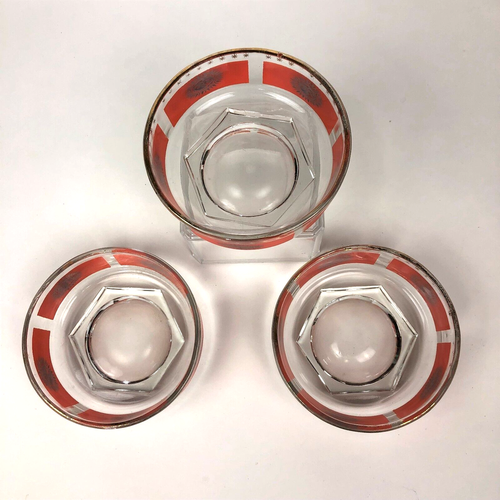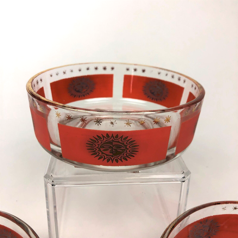 MCM Set of 3 Glass Snack Bowls Orange Gold Sun & Stars Pattern Gold Rim VTG 60's/70's SO RETRO!! Approximately 4.5" x 4.5" x 2" Preowned - Good Condition Looking good for their age! Gold rim & stars have rubbed off in a couple areas GREAT orange color! Please see pictures to best determine condition Any returns should be returned in the same condition as originally photographed and shipped. Returns will be accepted within 30 days of receipt. Please ask any questions, and we will respond as soon as possible. Check out my other listings. All items are from a Smoke-Free Home Thanks for looking!