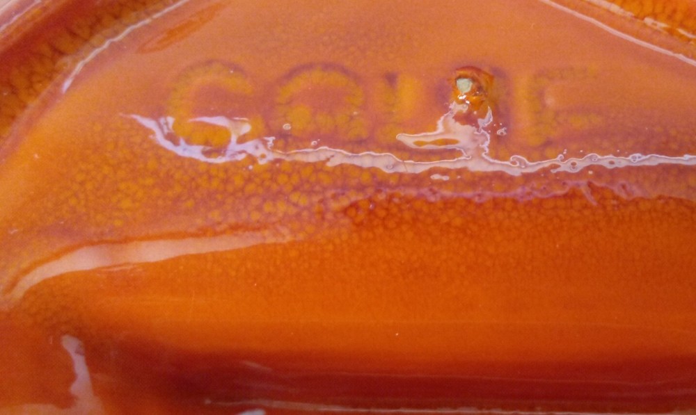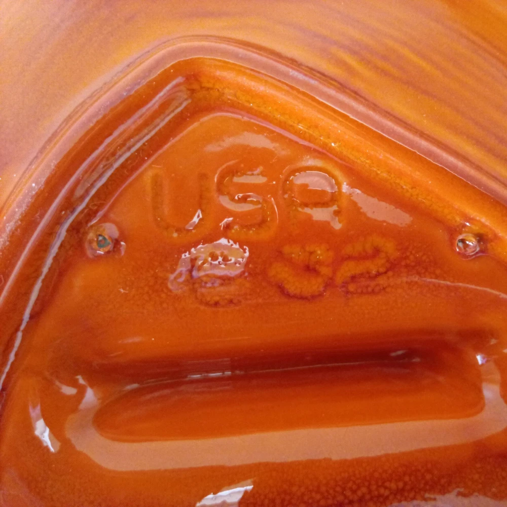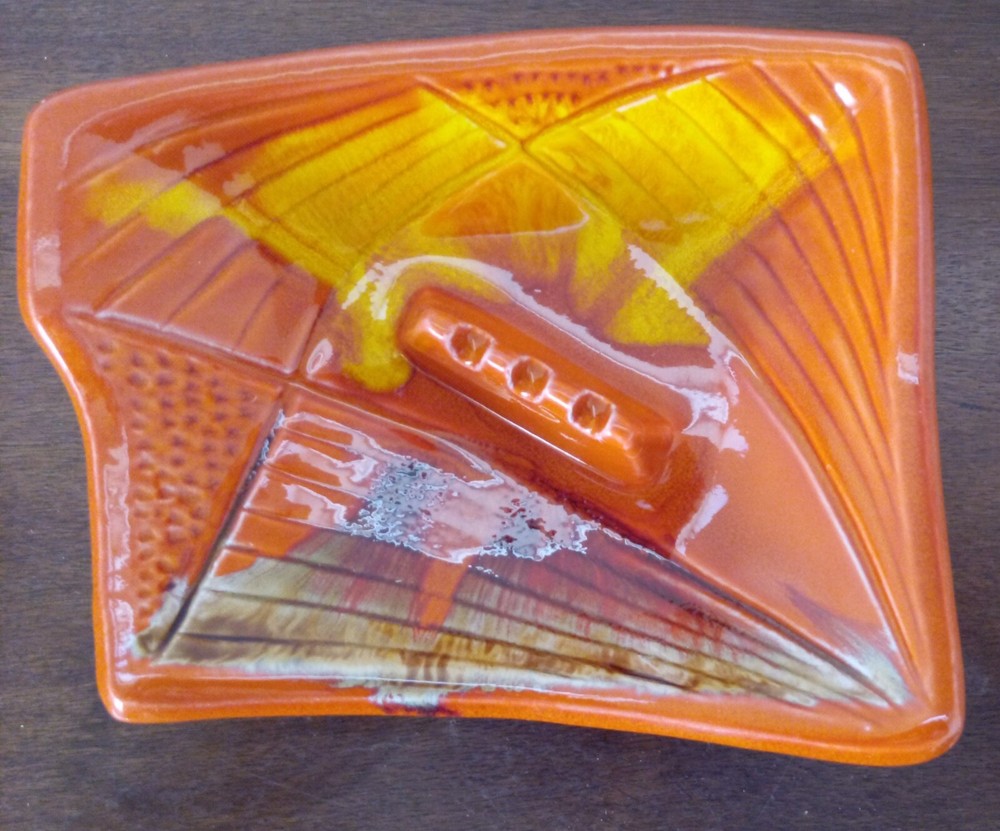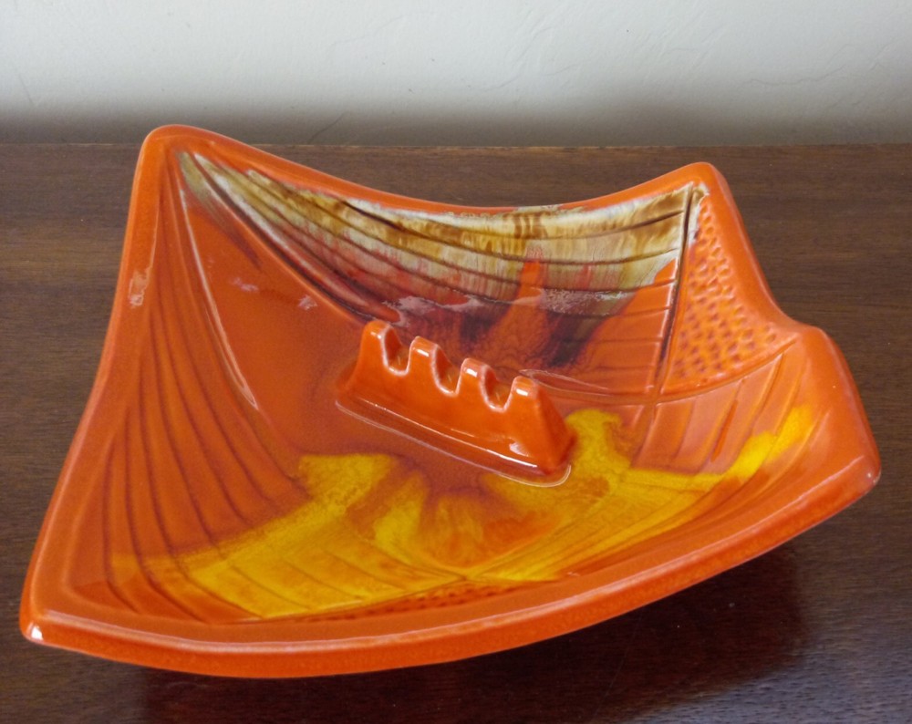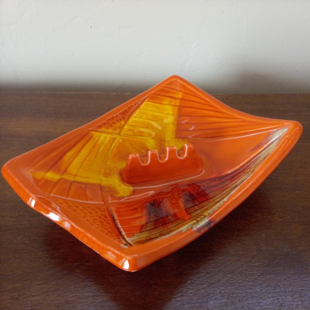MCM Ashtray Glazed Ceramic Orange Yellow Brown 9" x 9" Calif. USA Mark. Really stunning high gloss ceramic ashtray in the 60's bright orange and yellow. Marked USA and "Calif." on the other side. Excellent condition, no chips or cracks, color is bright and undamaged. 3 cigarette slot. Measures 9" at longest points.