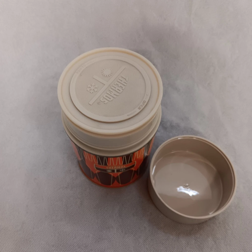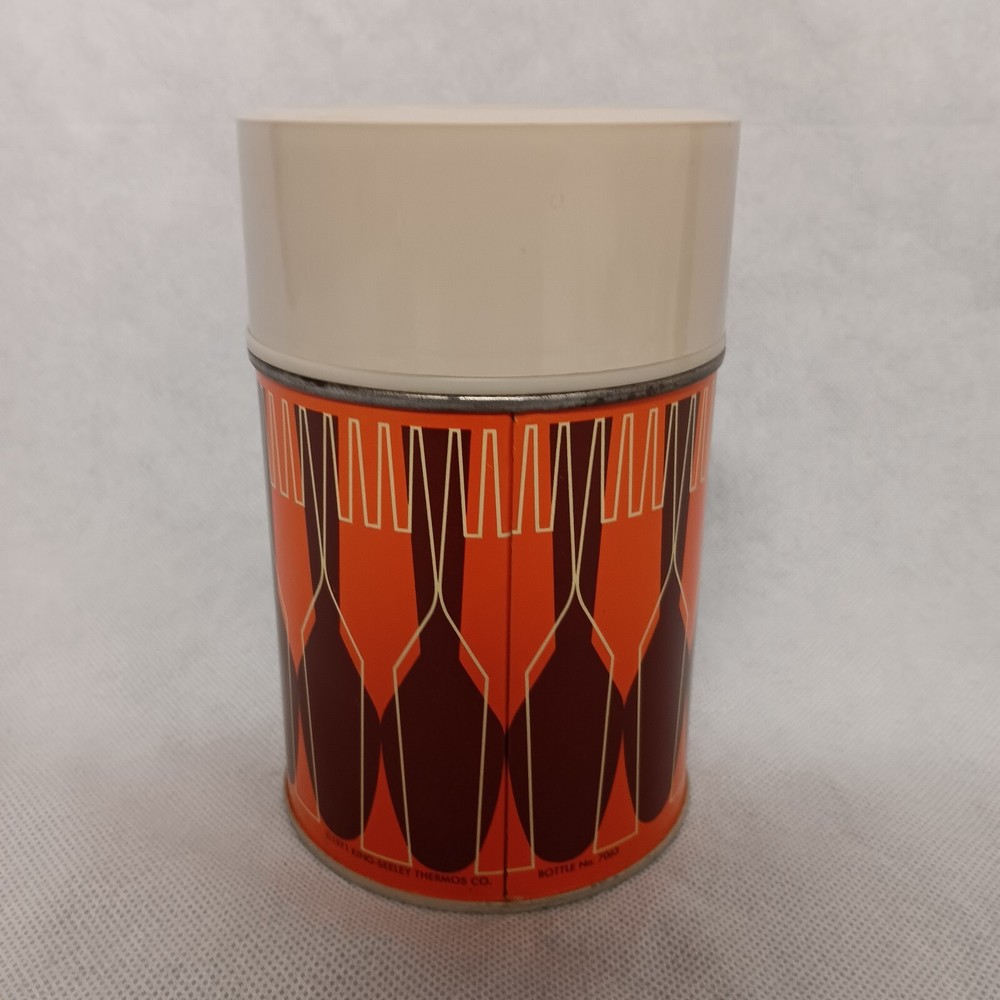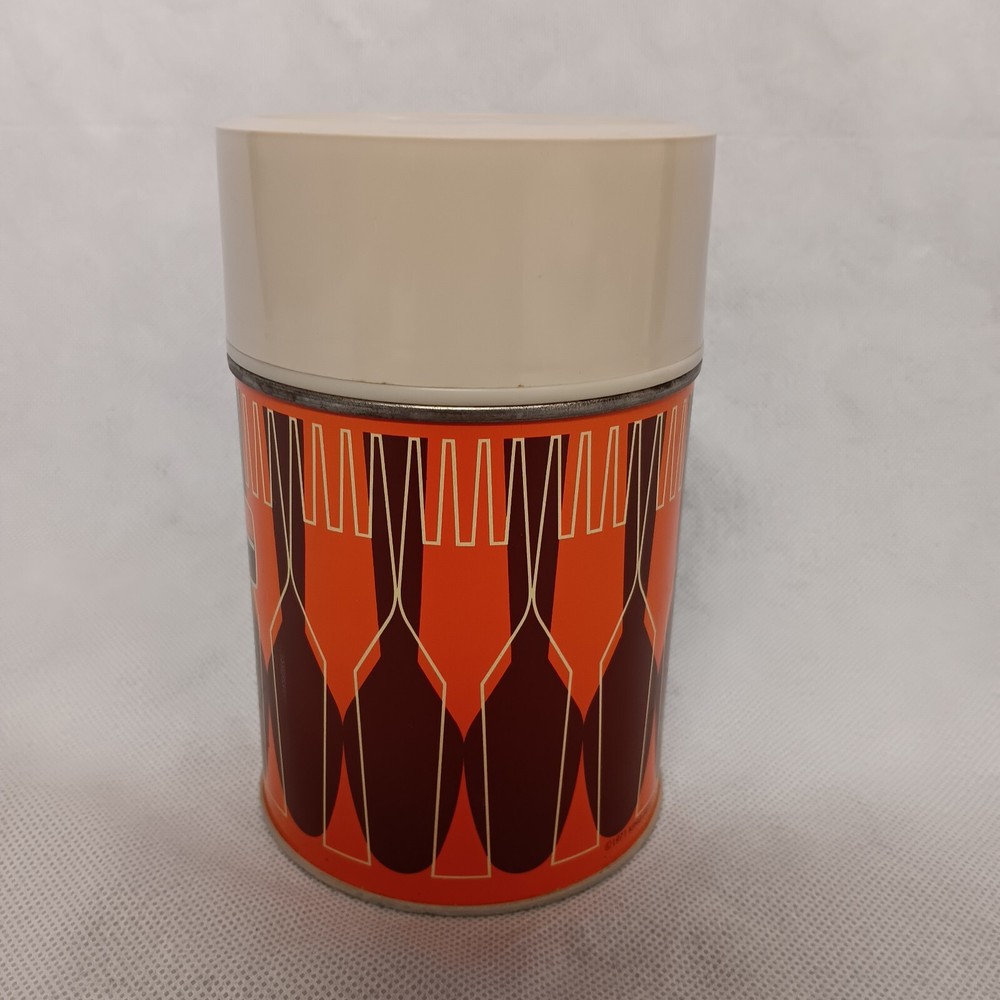 Unique MCM Thermos Atomic Look / Print Model 1063 Metal Body Plastic Lid and Cup Nice Clean Condition Holds 10 Ounces Measures 6.25" Tall x 4" Thank You For Looking