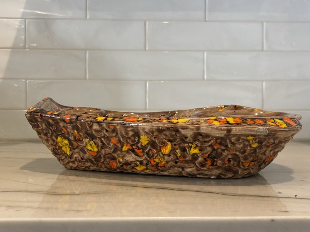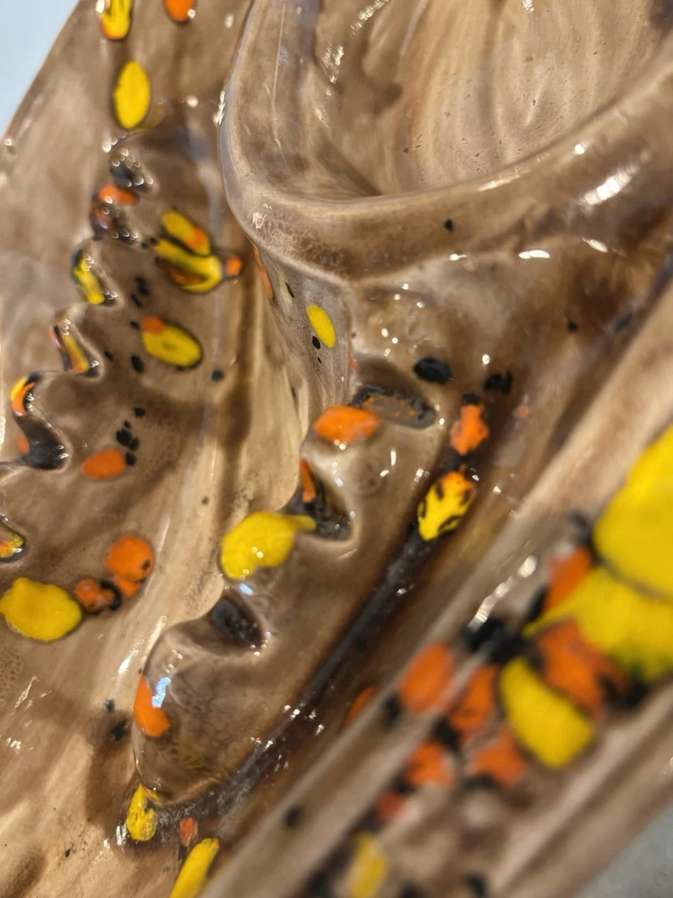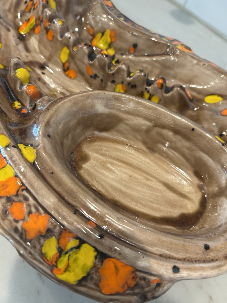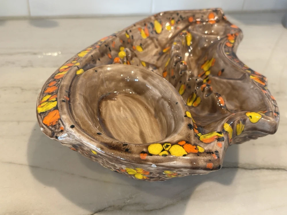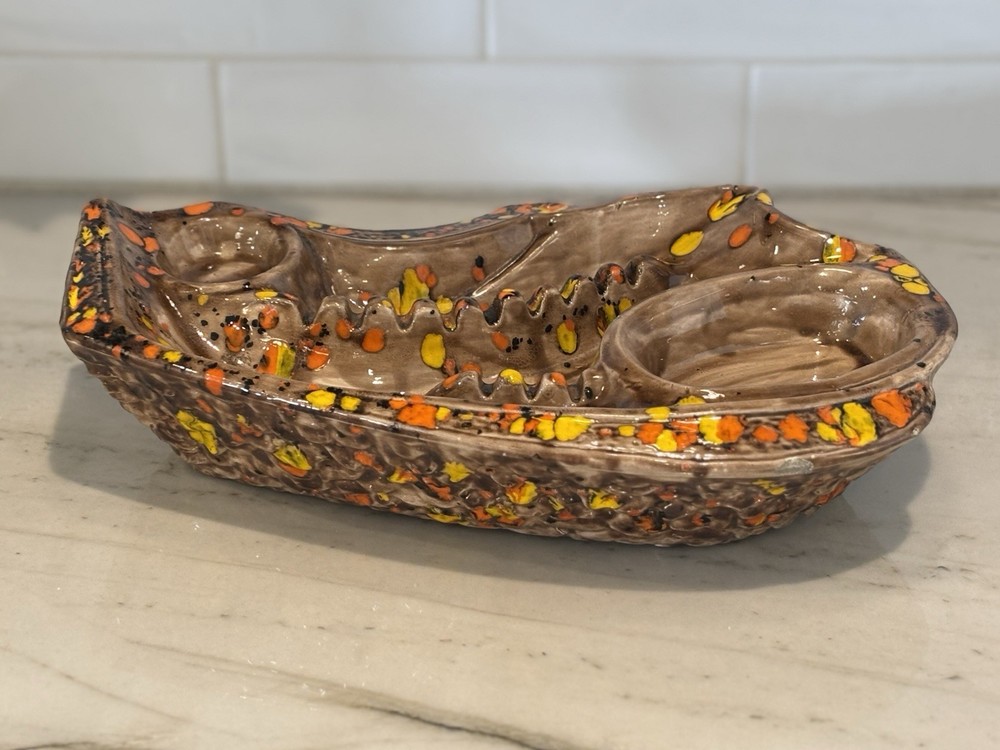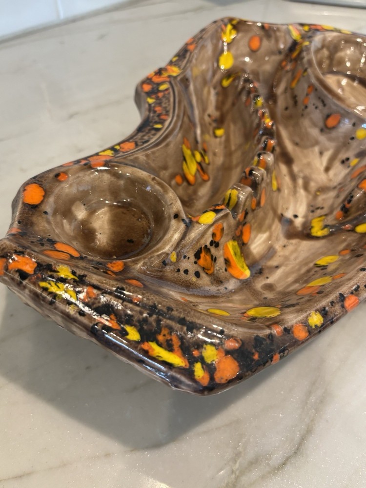 Up for sale: MCM Ceramic Drip Glaze Mid Century Modern Ashtray Brown Gold Orange Bohemian 70s Please see pictures. Vintage MCM collectible ash tray that has been signed with some initials on the bottom. Vibrant oranges & golden yellow against shades of brown. No breaks or chips that I could find. Measures 15.5 inches long by 10 inches across (large size!). Any questions? Please ask before buying! All auctions will be shipped within 2-4 business days! Shipping is $15 within the US. For international buyers, I will have the international shipping program selected for this listing. I am MORE than happy to combine shipping for multiple wins!