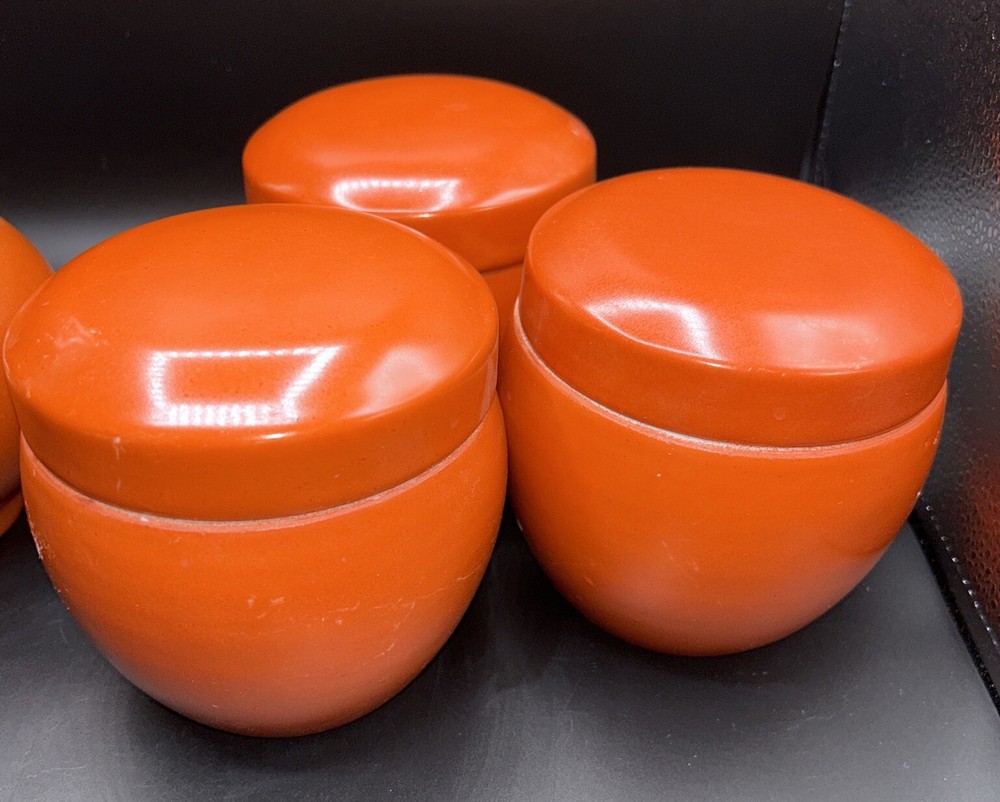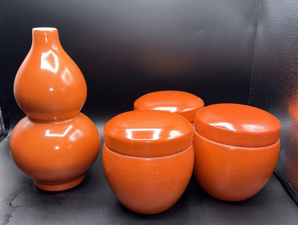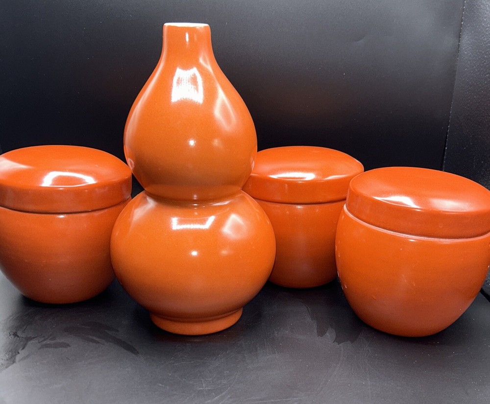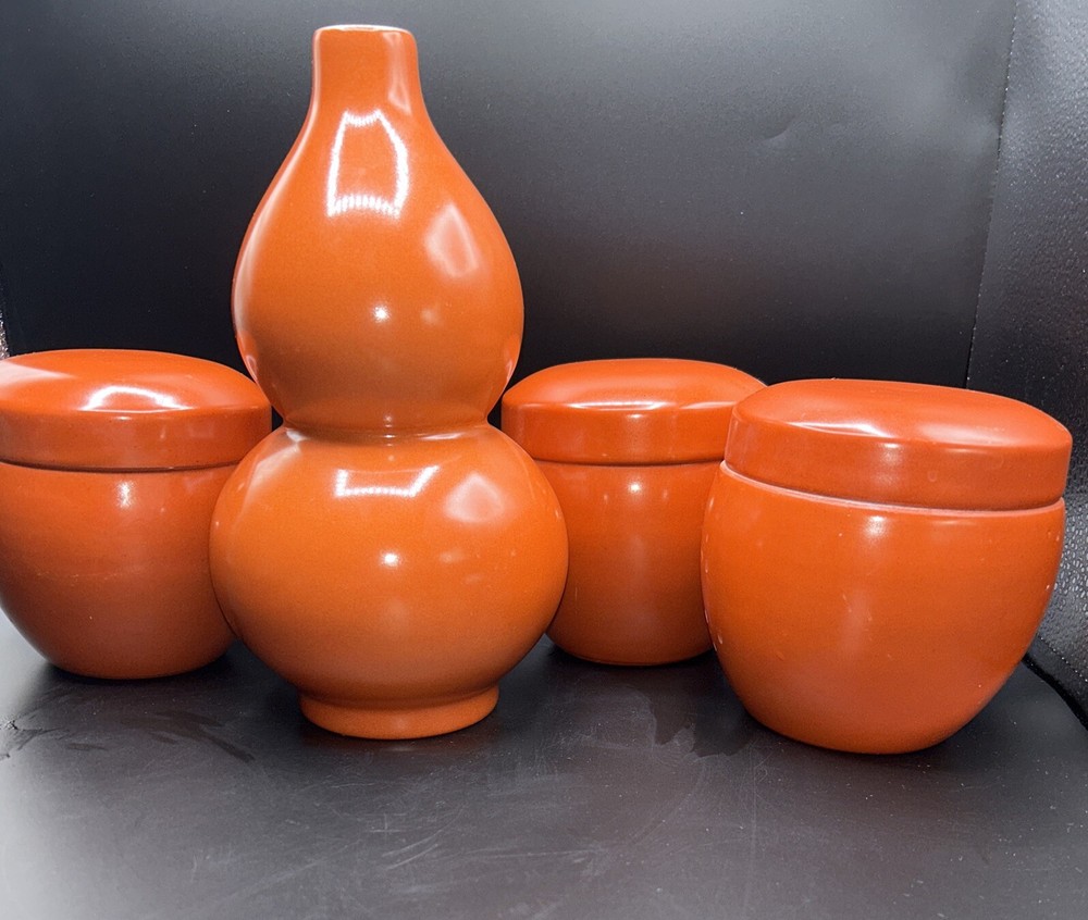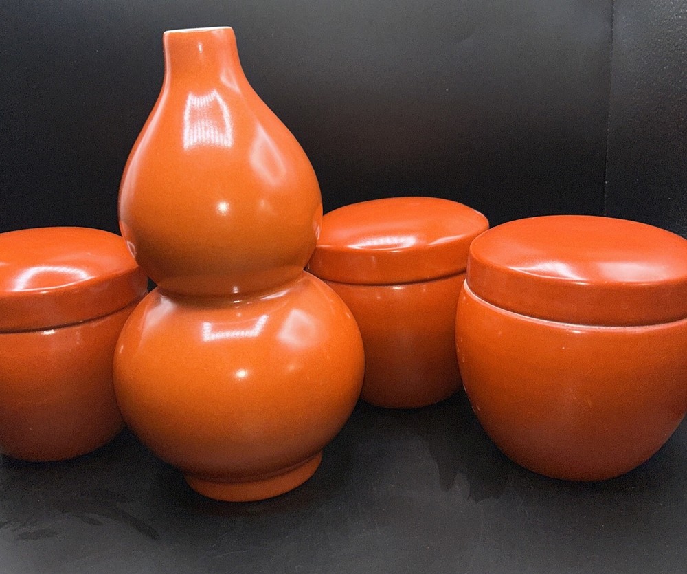 Add a touch of Mid-Century Modern to your decor with this beautiful set of burnt orange ceramic vase and canister set of 3. The vase stands at 9.5 inches tall and the canister measures 4.5 inches in diameter. The glossy finish and vintage style give this set a unique charm that will complement any interior. The brand is unmarked and the origin is Chinese, making it a rare and exotic addition to your collection. This set is perfect for displaying your favorite flowers or as a decorative piece on its own.