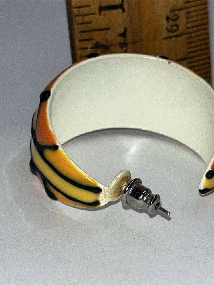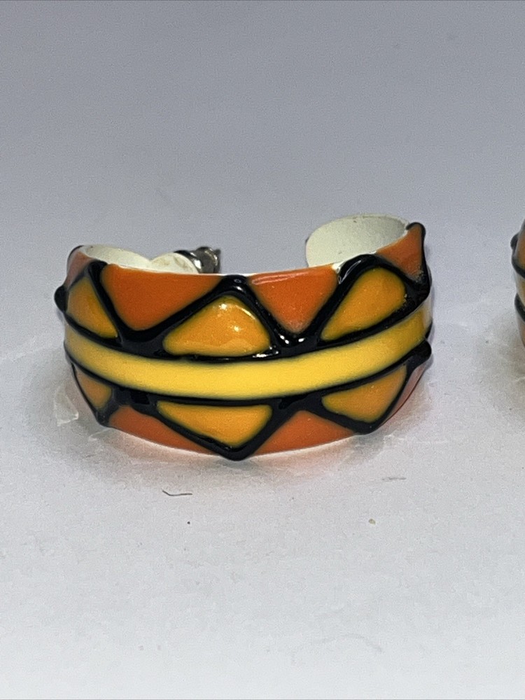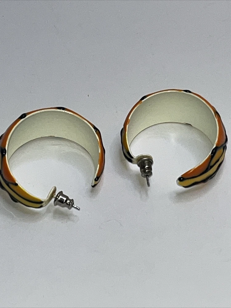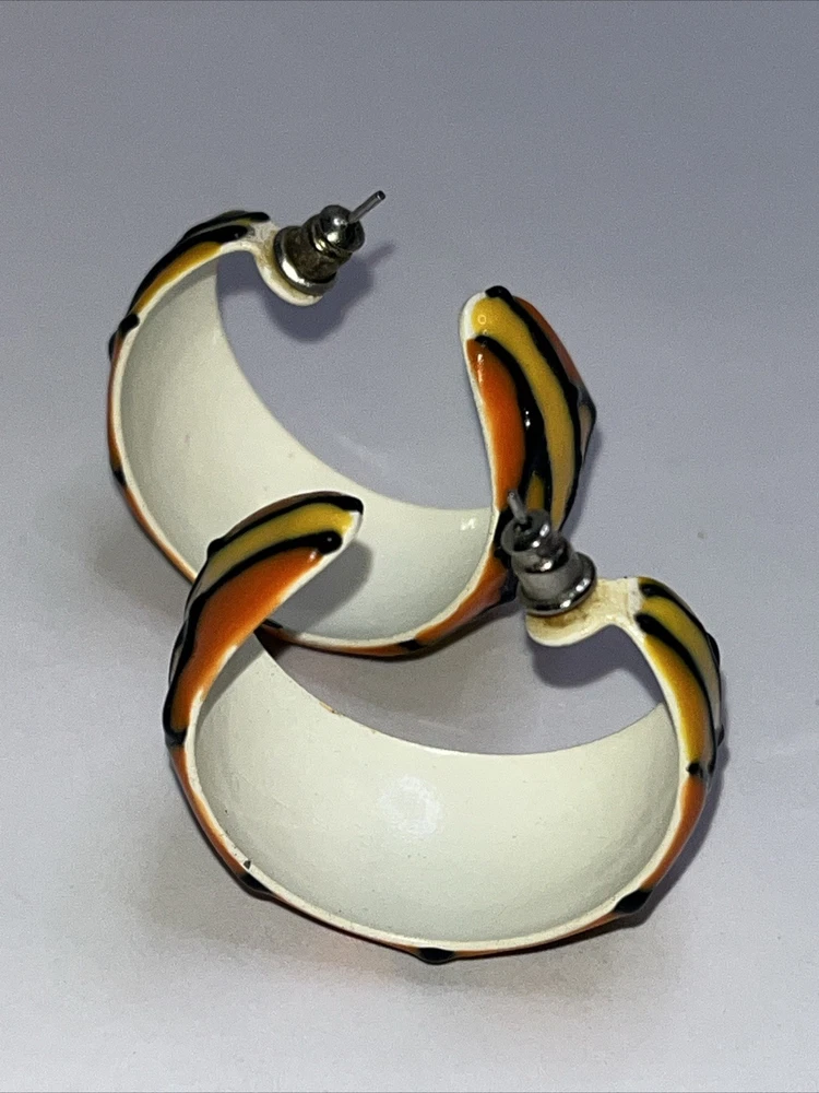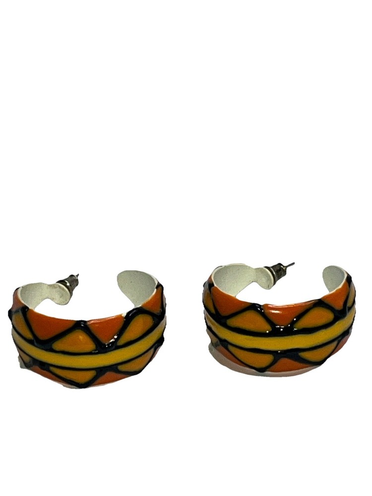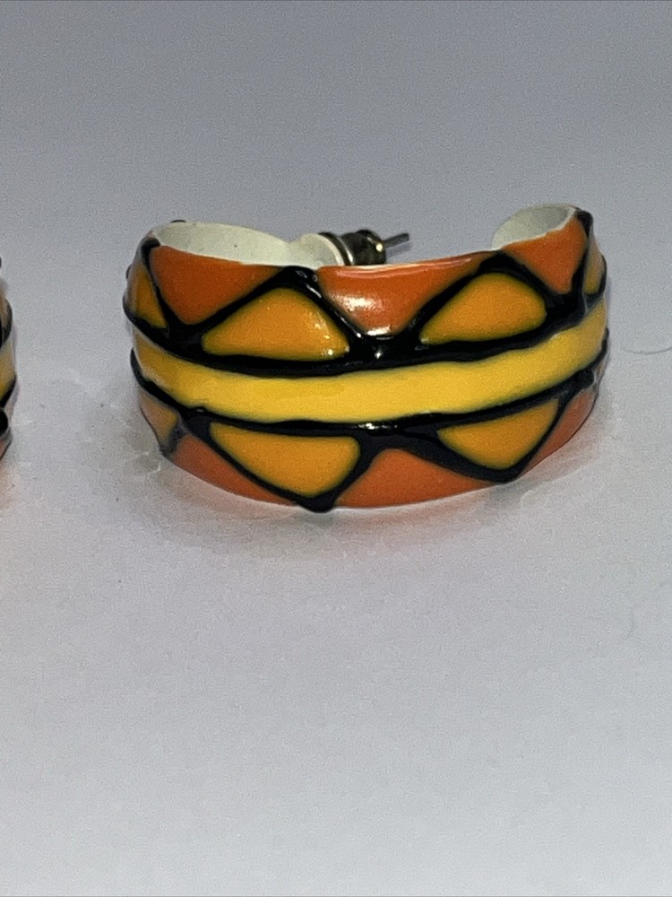 These earrings are absolutely stunning! The vibrant orange, yellow, and black enamel design pops with a bold, artistic flair. The craftsmanship is top-notch—lightweight yet durable, and the post backs stay secure all day. Perfect for adding a fun, retro touch to any outfit. Love the unique enamelware look—definitely a standout piece!