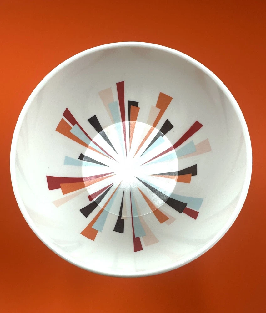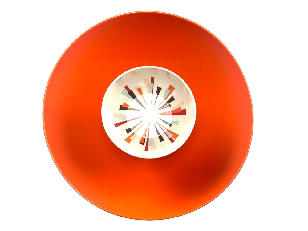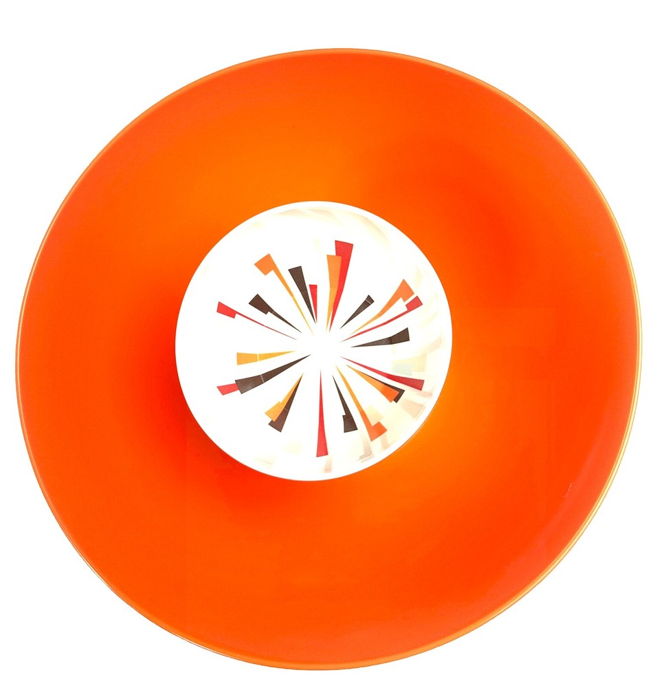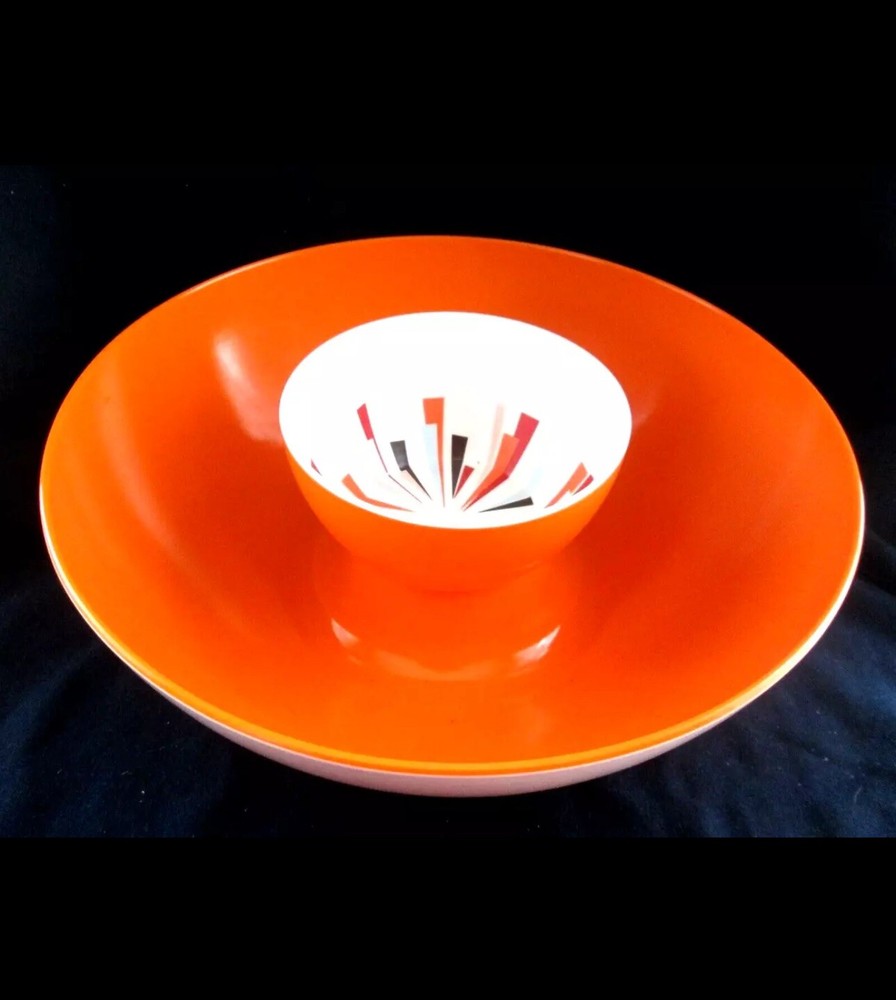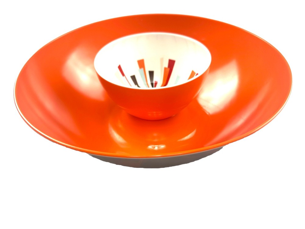MCM Vintage Large 12” Hi-Rise Chip & Dip Bowl . Item is 4.5” tall . Made by Newplace Newsplace . Bright orange in color with the cool atomic starburst center for the dip . No damage to the item. Item Weighs approximately 2 pounds . Returns are accepted if you are not 100% satisfied .
