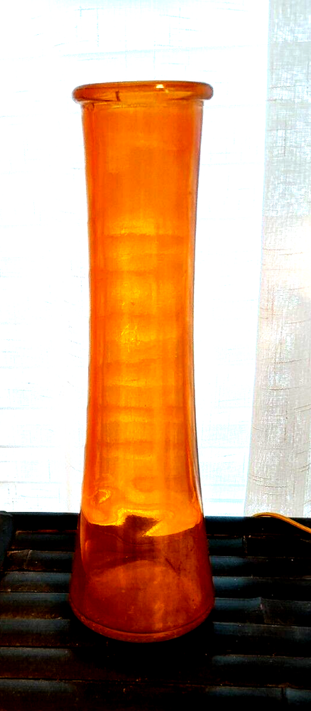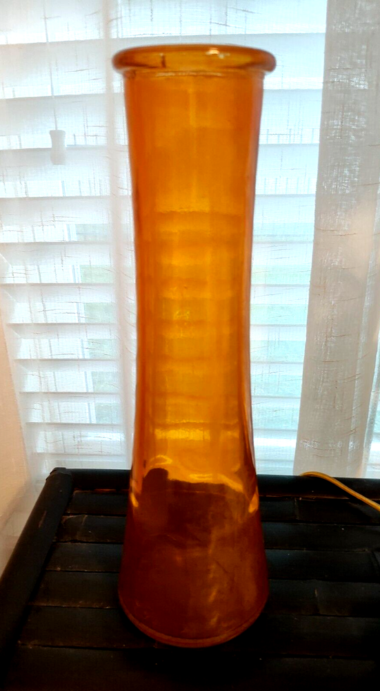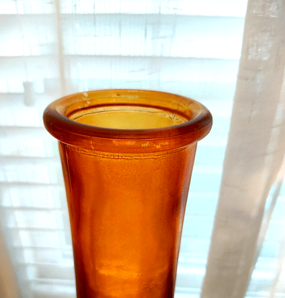 Enhance your home decor with this stunning vintage MCM mid-century modern vase. The elegant clear orange glass construction adds a touch of sophistication to any space. This tall 14 3/4" vase is perfect for displaying fresh flowers or as a standalone decorative piece. The stylish piece features a sleek design and is made of high-quality glass material that ensures its durability. The vase is suitable for any mid-century modern decor and adds a pop of color to your living room, bedroom, or office.