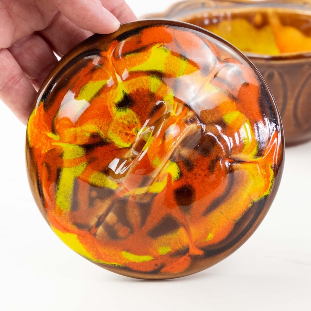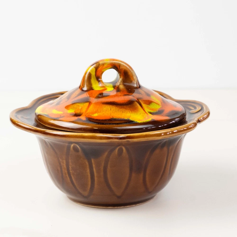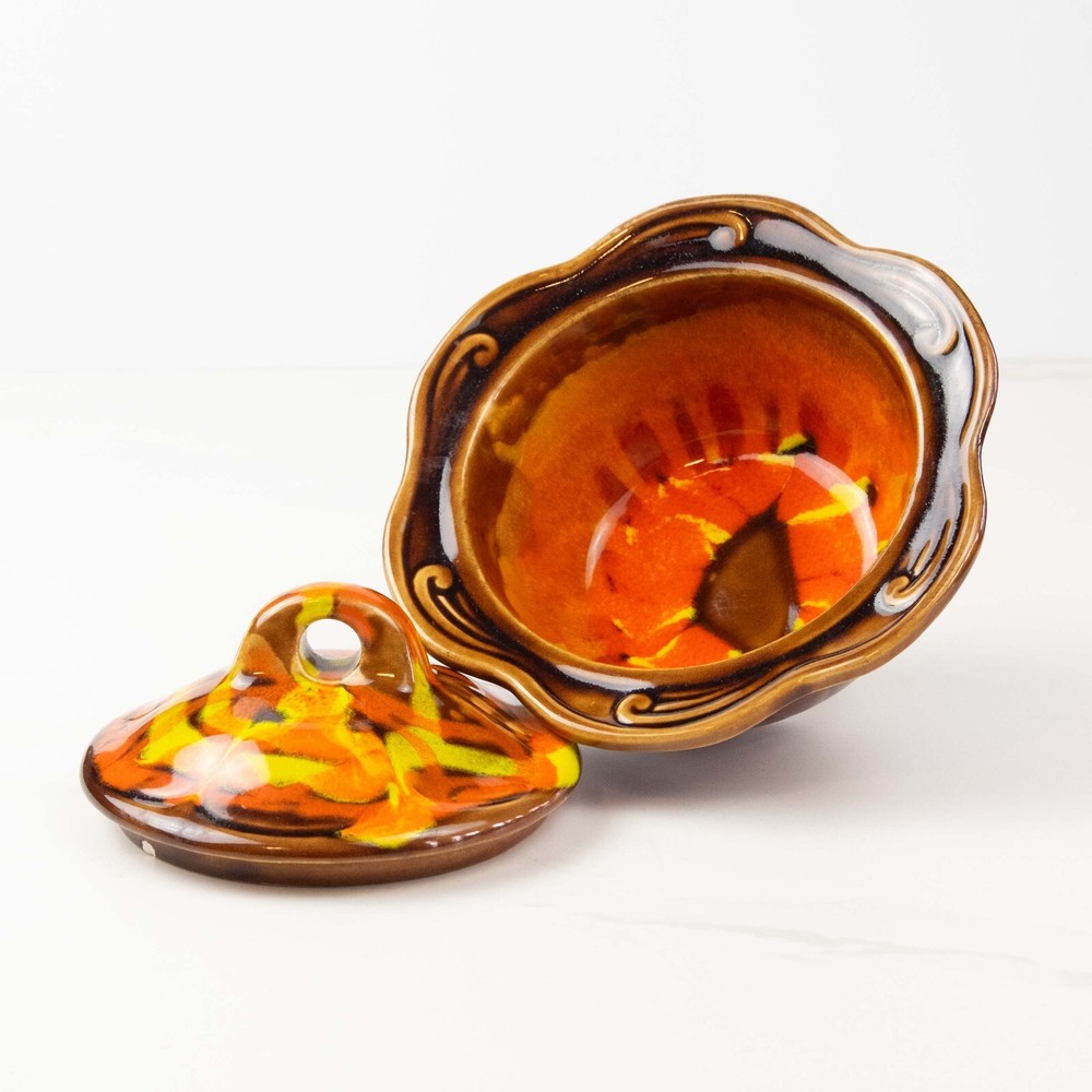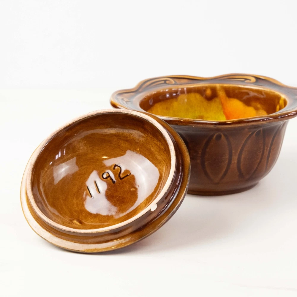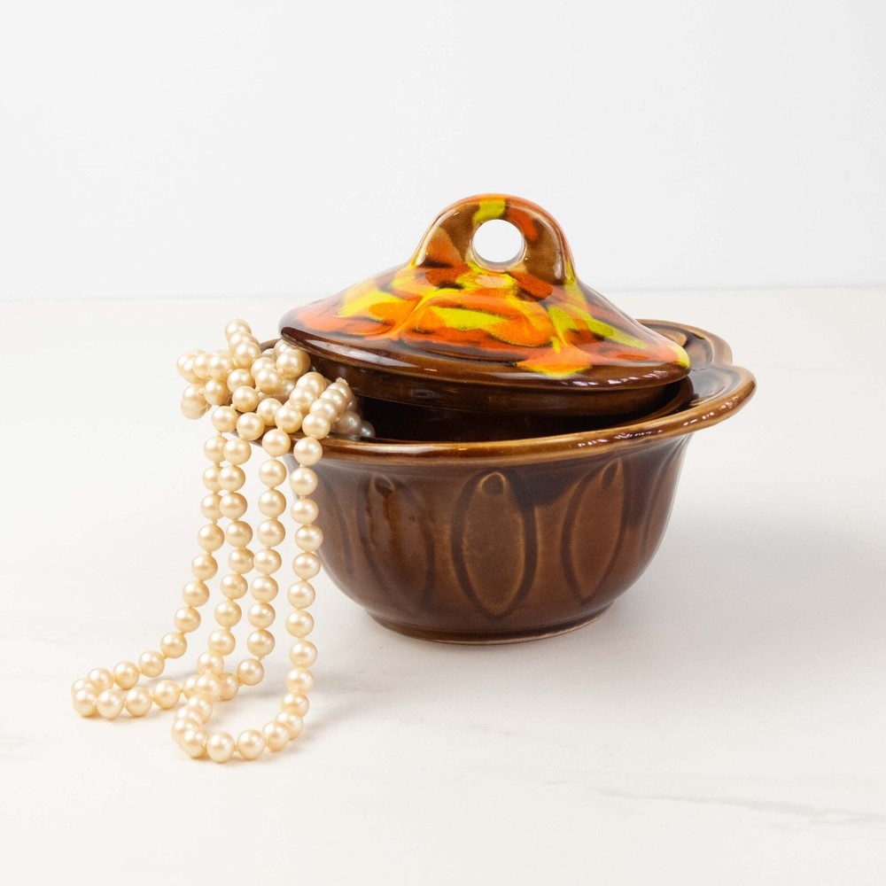This vintage lidded bowl set from California Original USA is a unique addition to any Mid-Century Modern collection. The round bowl is made of clay and features an eye-catching orange/brown swirl glaze color on lid and inside of bowl. The bowl included a lid, which is rare to have survived, perfect for storing small items. It is an original piece from the mid-20th century era. It is recommended to hand wash only and is a vintage original. This California Original USA bowl set is a must-have for any pottery enthusiast or collector. Jewelry not included. Vtg California Original USA Pottery Orange Brown #1192 Lidded Trinket Dish MCM