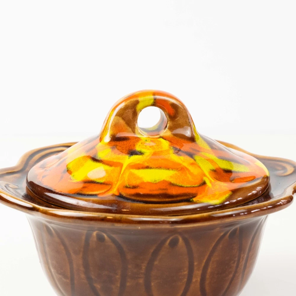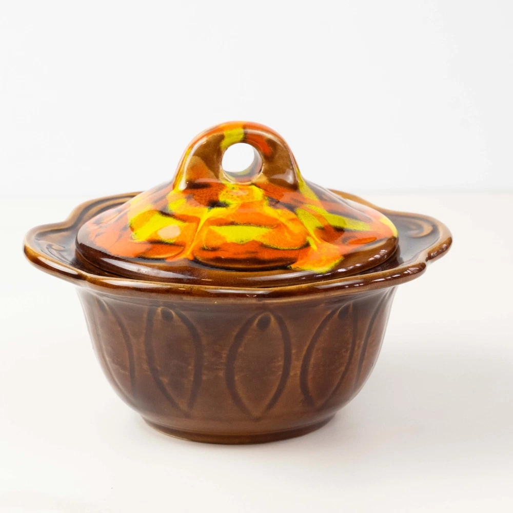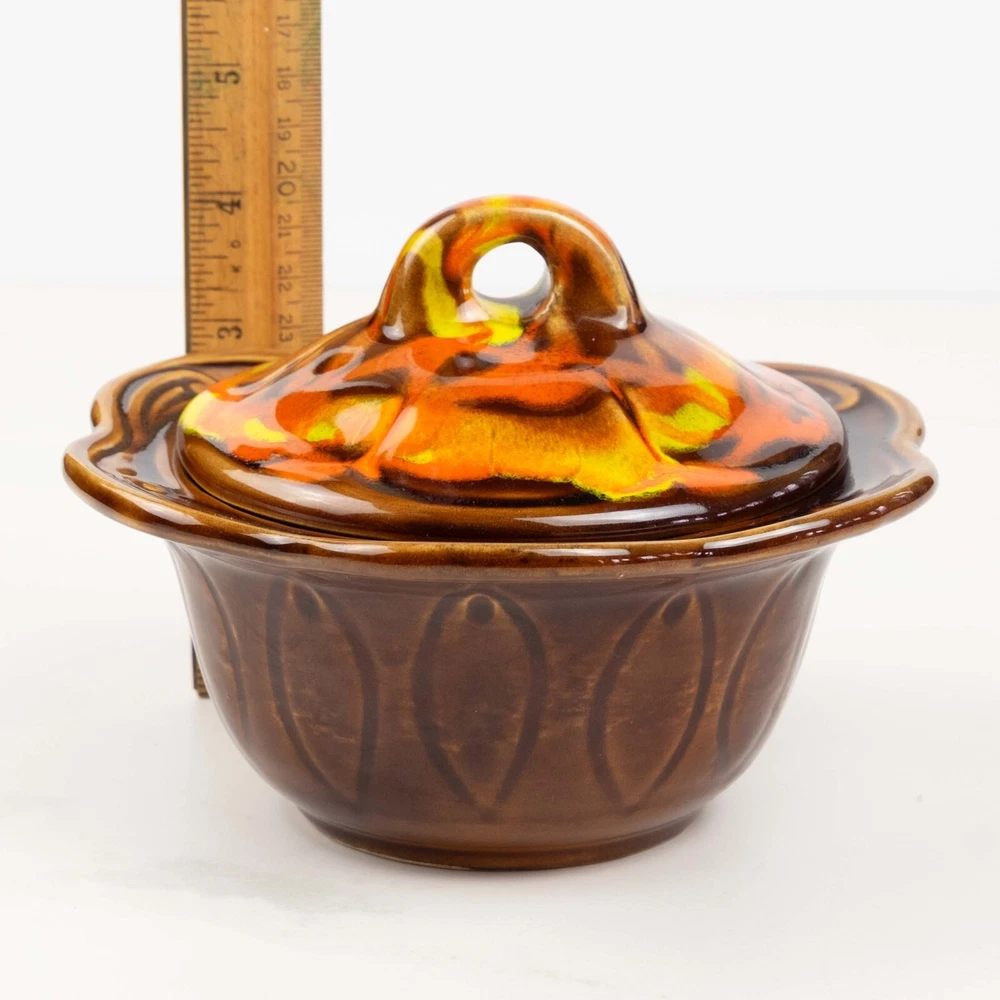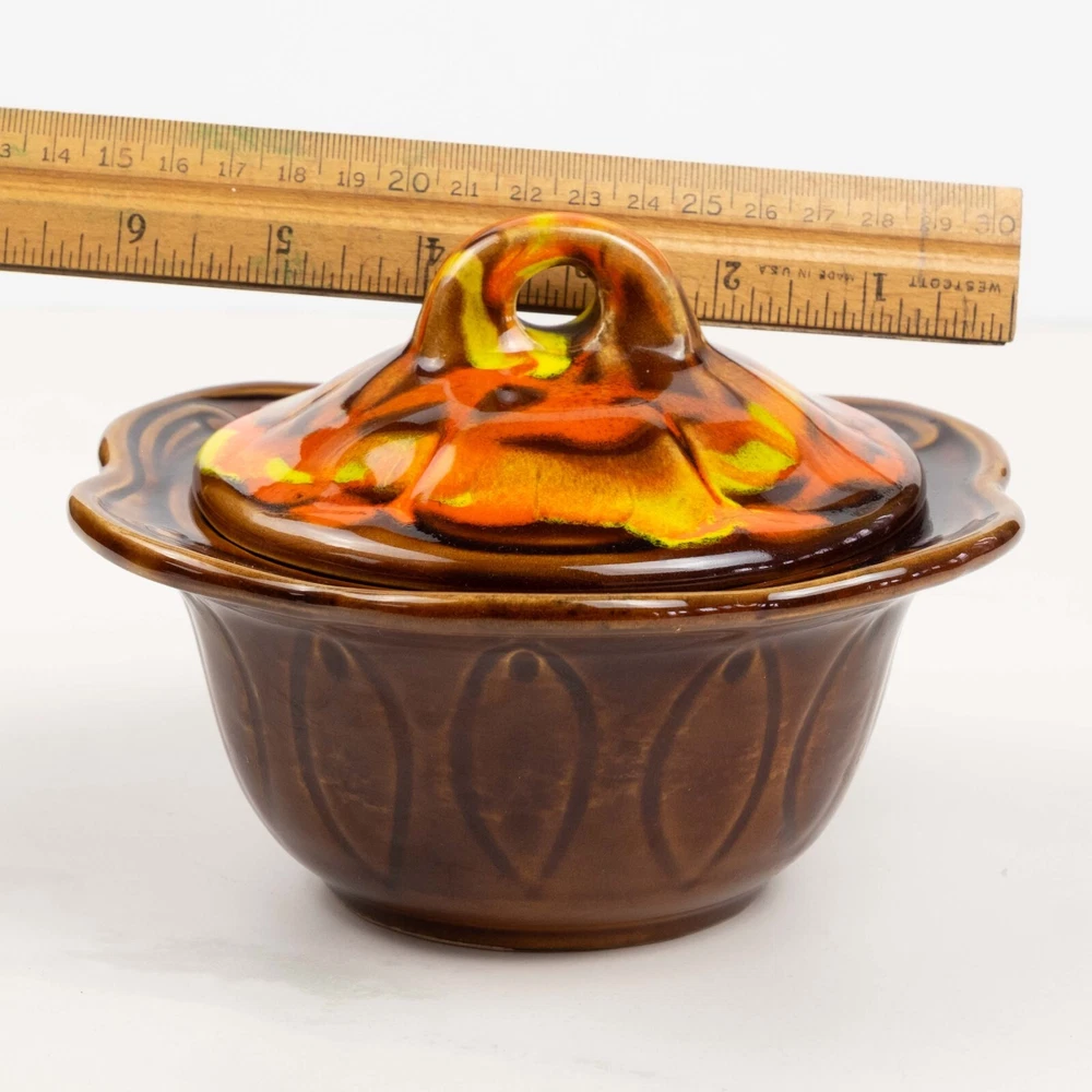This vintage lidded bowl set from California Original USA is a unique addition to any Mid-Century Modern collection. The round bowl is made of clay and features an eye-catching orange/brown swirl glaze color on lid and inside of bowl. The bowl included a lid, which is rare to have survived, perfect for storing small items. It is an original piece from the mid-20th century era. It is recommended to hand wash only and is a vintage original. This California Original USA bowl set is a must-have for any pottery enthusiast or collector. Jewelry not included. Vtg California Original USA Pottery Orange Brown #1192 Lidded Trinket Dish MCM