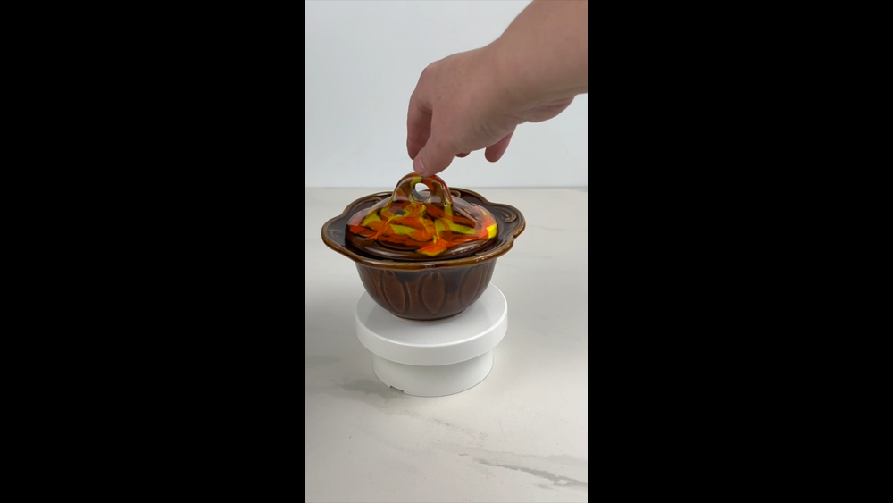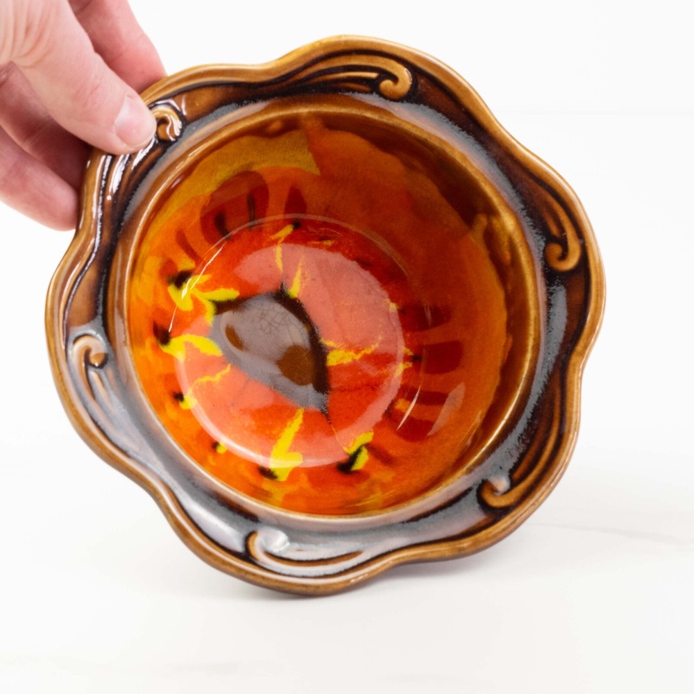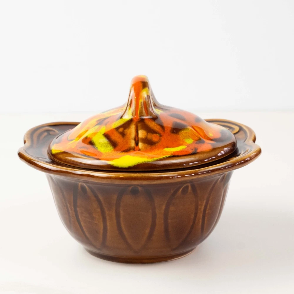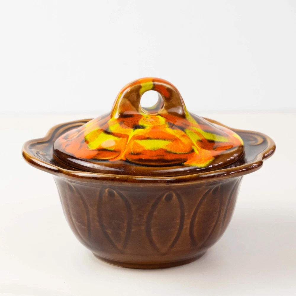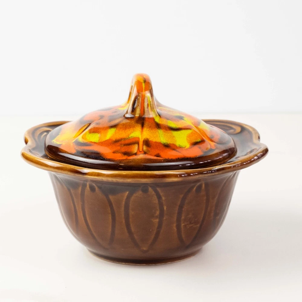 This vintage lidded bowl set from California Original USA is a unique addition to any Mid-Century Modern collection. The round bowl is made of clay and features an eye-catching orange/brown swirl glaze color on lid and inside of bowl. The bowl included a lid, which is rare to have survived, perfect for storing small items. It is an original piece from the mid-20th century era. It is recommended to hand wash only and is a vintage original. This California Original USA bowl set is a must-have for any pottery enthusiast or collector. Jewelry not included. Vtg California Original USA Pottery Orange Brown #1192 Lidded Trinket Dish MCM
