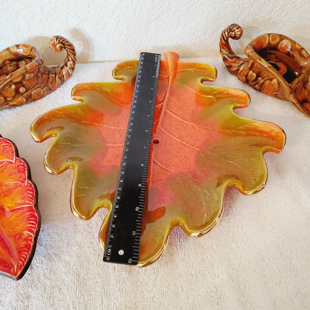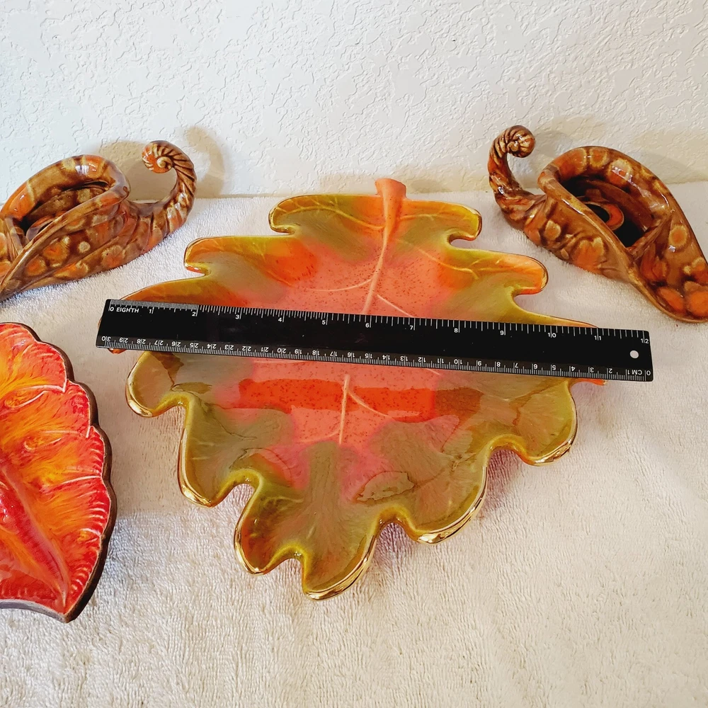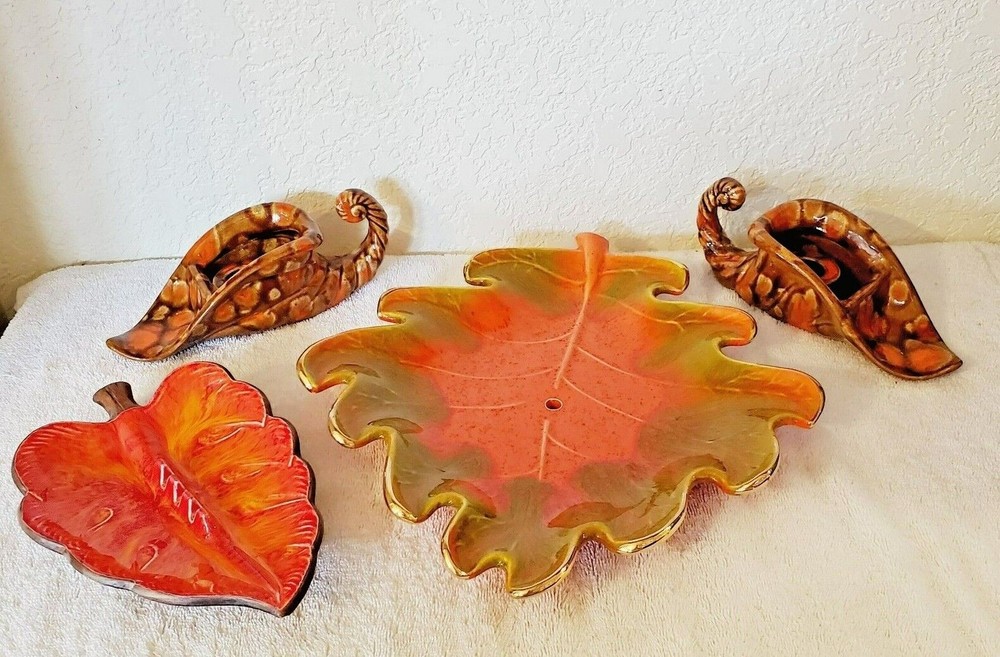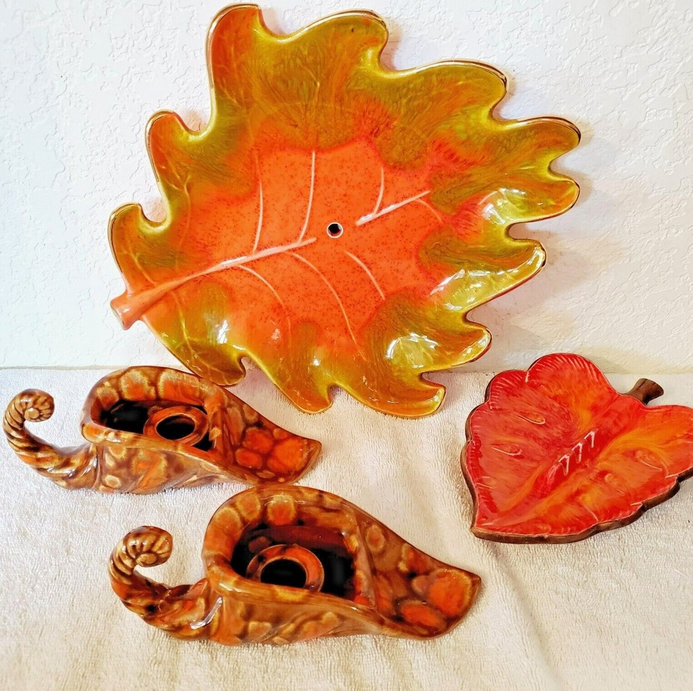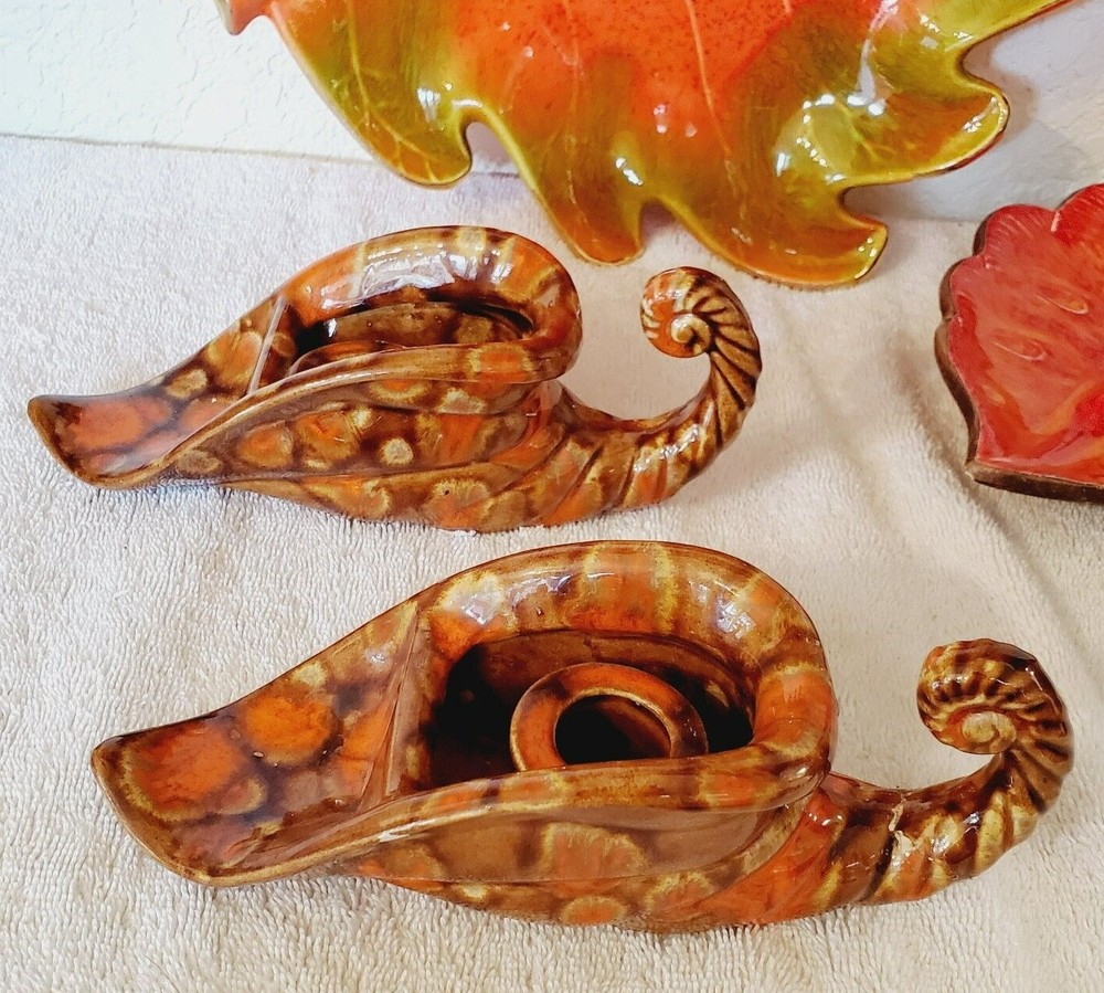 Vintage True Mid-Century Modern Pieces. Huge ceramic Fall / Autumn lot. Included in this lot: Large Leaf Tray / Plate with an opening in the middle. 2 Cornucopias Candle stick holders (Has a small nick to the bottom, please refer to the last picture) Leaf ashtray (nick to the bottom tip) Please refer to the second to last picture. Please refer to the pictures to see exactly what you will receive