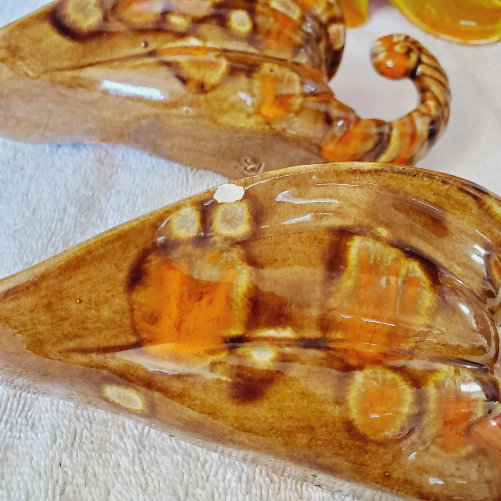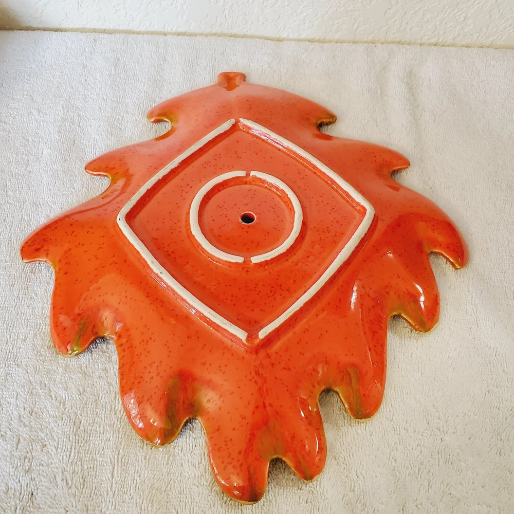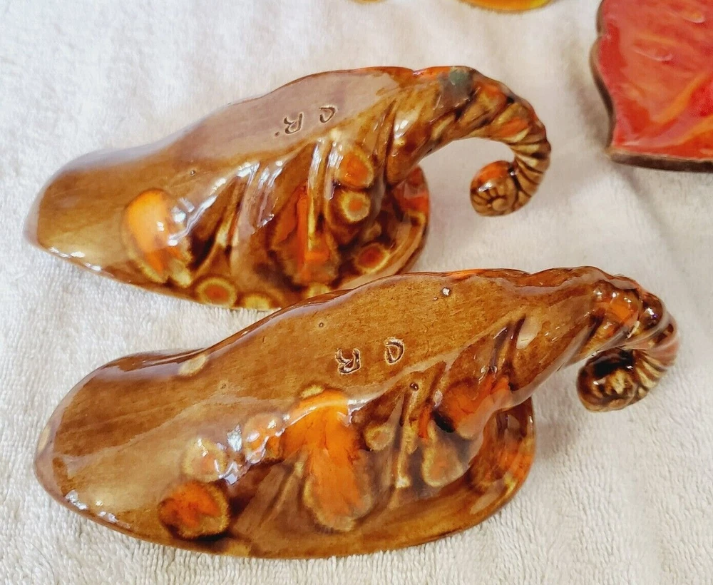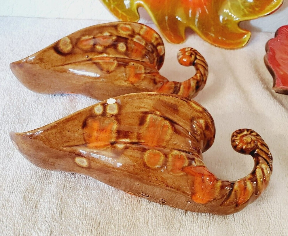Vintage True Mid-Century Modern Pieces. Huge ceramic Fall / Autumn lot. Included in this lot: Large Leaf Tray / Plate with an opening in the middle. 2 Cornucopias Candle stick holders (Has a small nick to the bottom, please refer to the last picture) Leaf ashtray (nick to the bottom tip) Please refer to the second to last picture. Please refer to the pictures to see exactly what you will receive