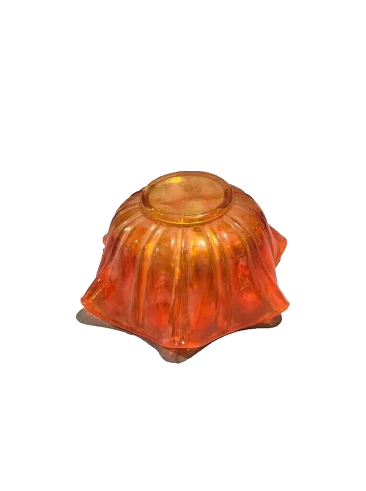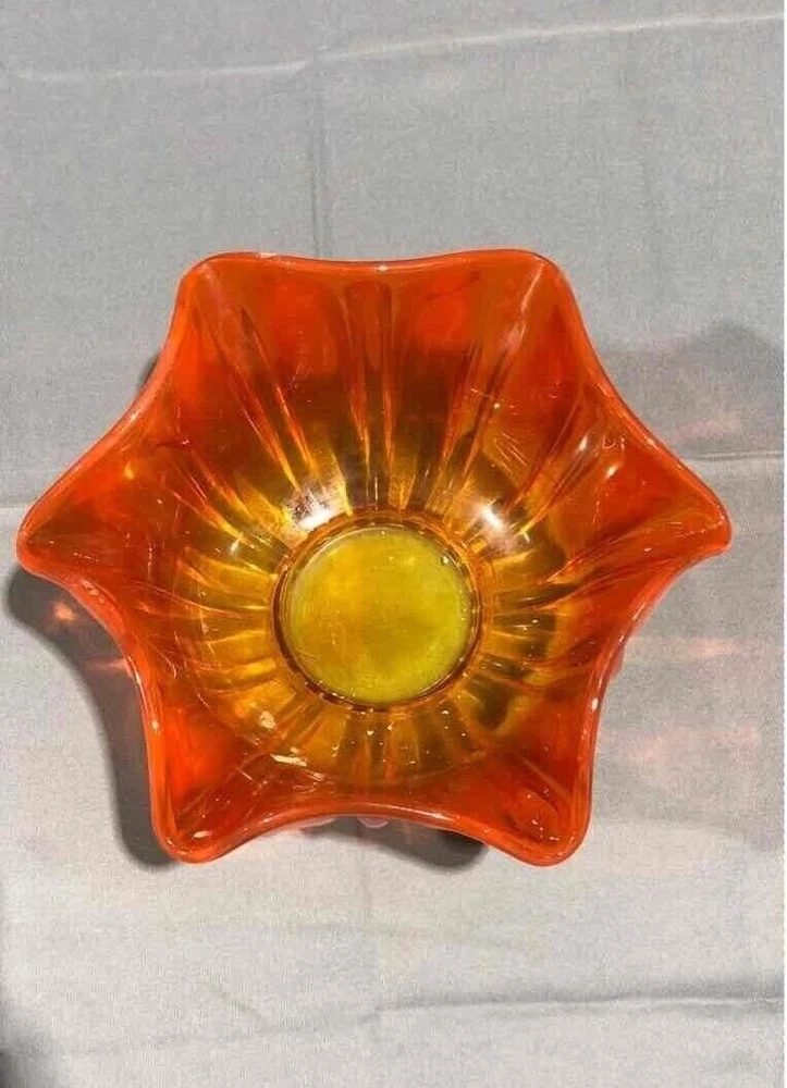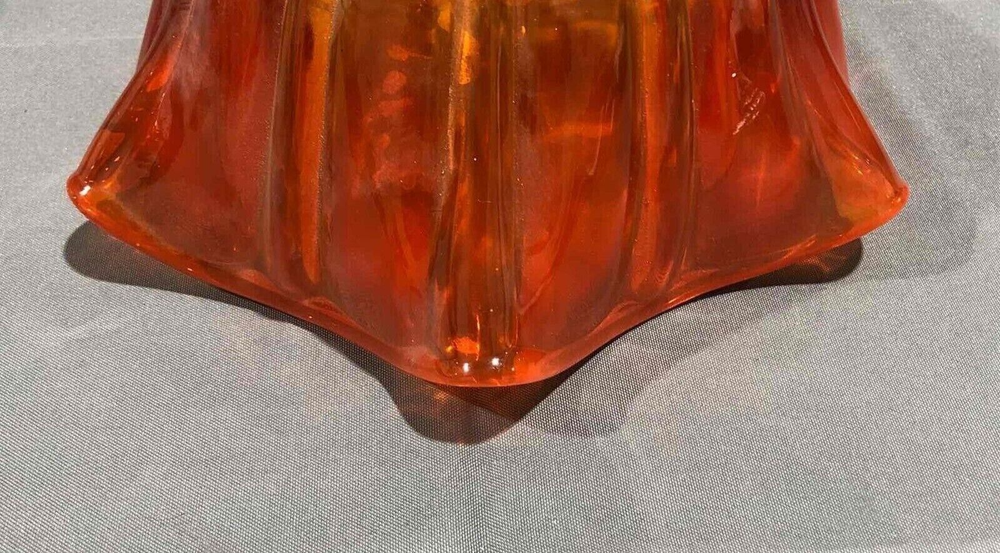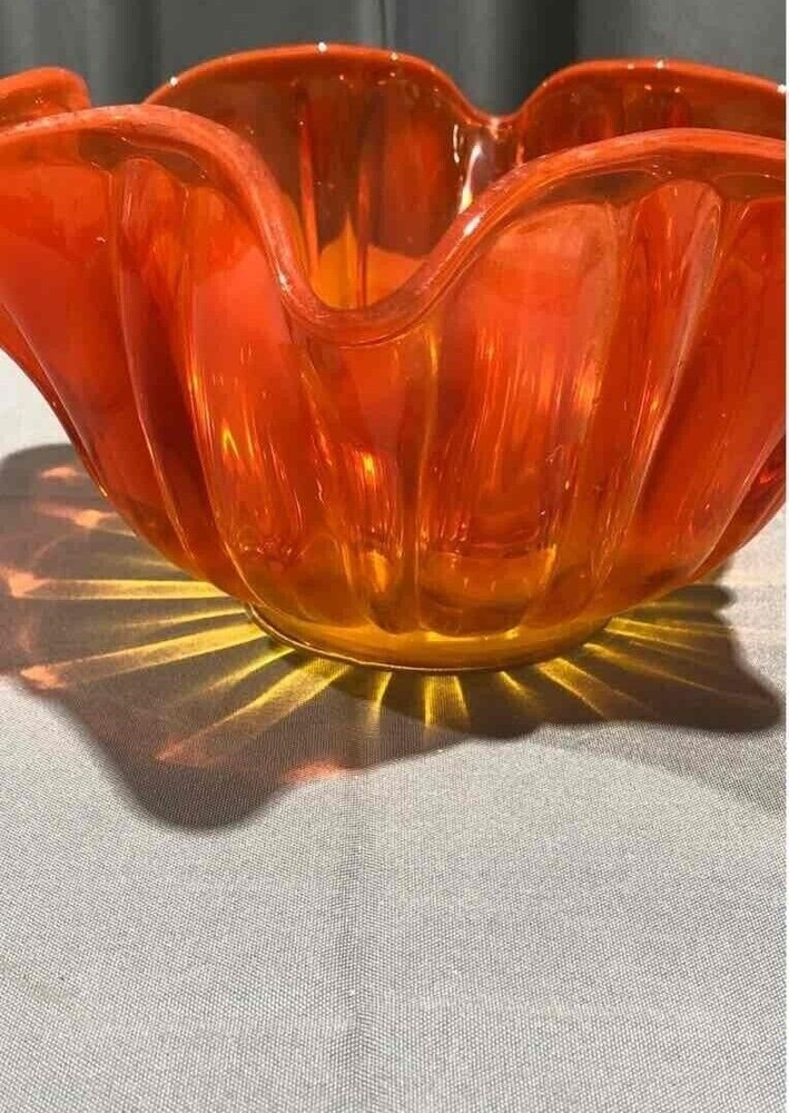 This beautiful mid-century modern art glass bowl features a stunning amberina orange color and a unique ruffled edge design. Crafted from high-quality glass, this bowl is both stylish and durable. With a classic mid-century modern style, this bowl is perfect for adding a touch of vintage charm to any decor. Whether you're using it as a decorative piece or as a functional serving bowl, this amberina orange bowl is sure to impress. About 5.5 inches tall by 11 inches wide