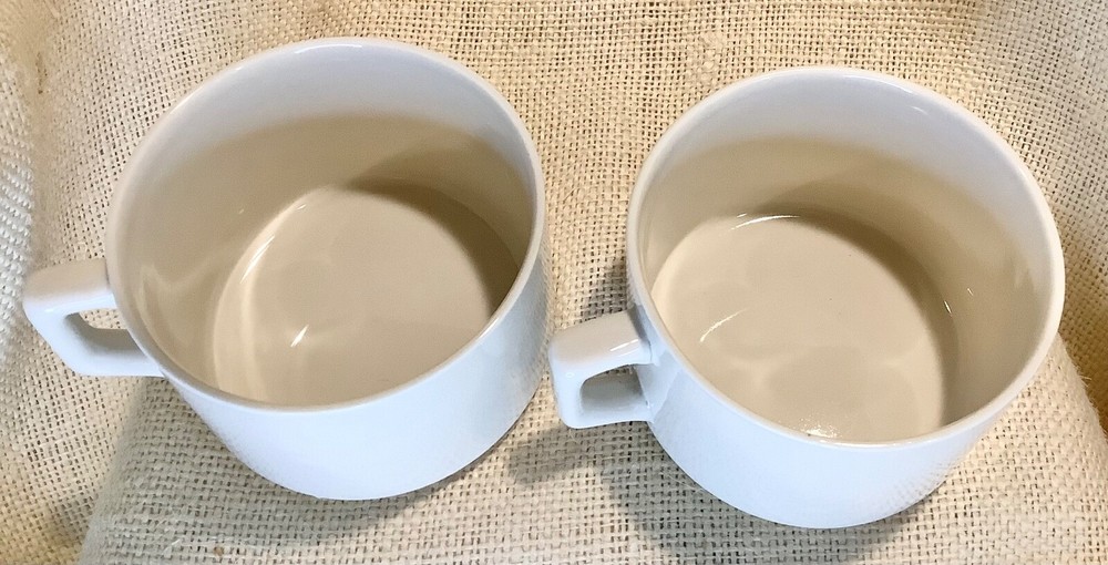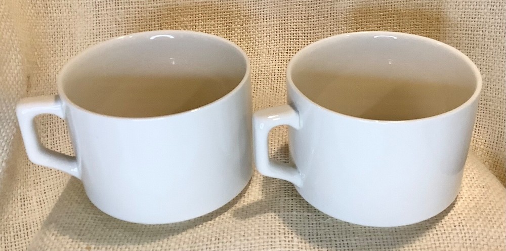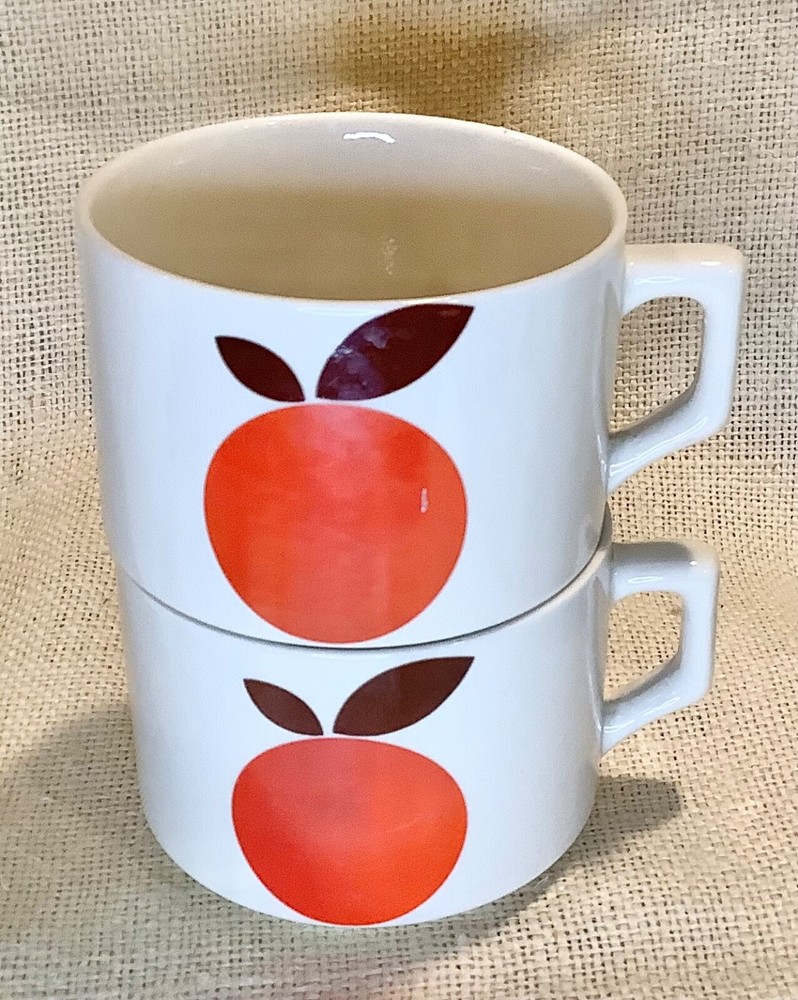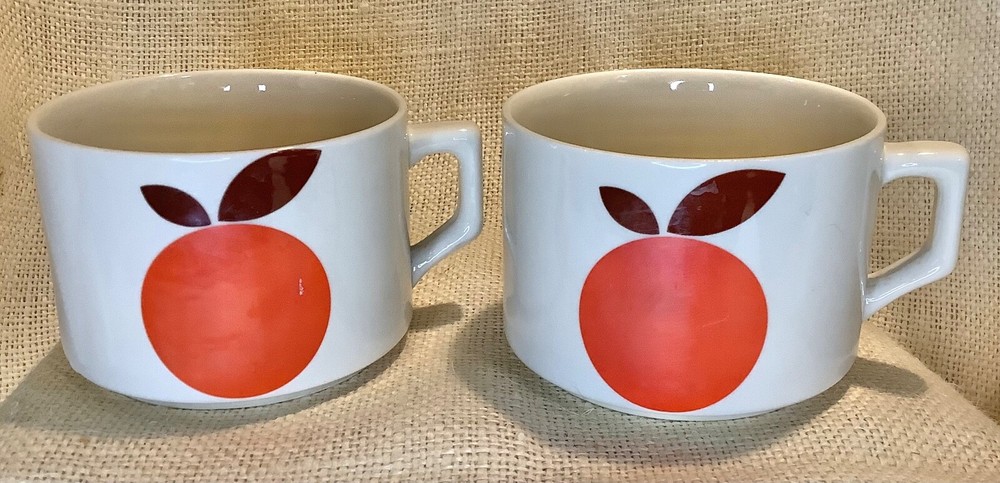 THIS IS A SET OF PORCELAIN MID CENTURY MODERN 1970’s LOOKING STACKABLE COFFEE CUPS—MARKED CF G-72 ON THE BOTTOMS—THE MUGS FOR THE MOST PART ARE IN GOOD CONDITION, THERE IS A SMALL SCRATCH ON ONE ON THE SIDE OF THE ORANGE WHICH I HAVE PICTURED, THE OTHER HAS A ROUGH EDGE ON THE BOTTOM WHICH I HAVE ALSO PICTURED. EACH MUG IS AROUND 2 3/4 INCHES TALL AND AROUND 3 3/4 INCHES WIDE.