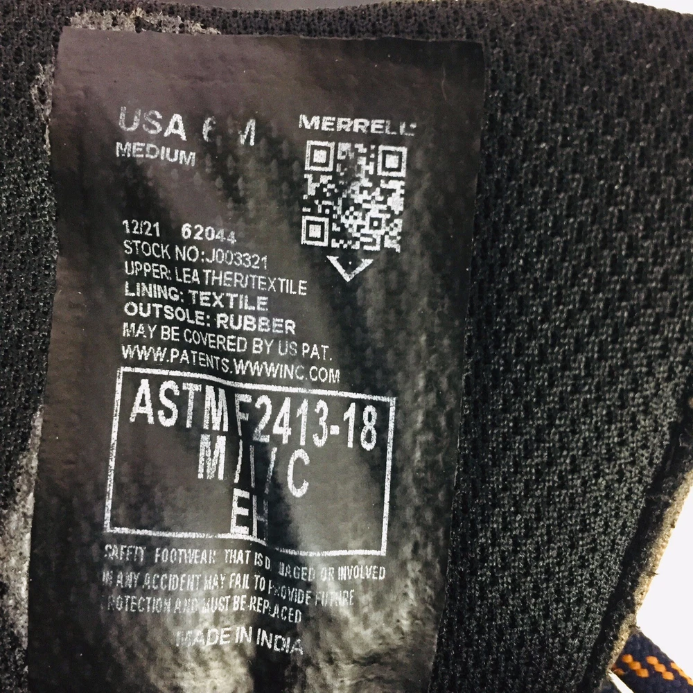 MERRELL Work Men's Boots Features: * Brand: MERRELL * Style: Work Fullbench Speed Mid * Style Code: J003321 * Mid Top * Hard Toe * Color: Black and Safety Orange * Insole: Foam * Lace Up * Size: US 6 M (Men's)