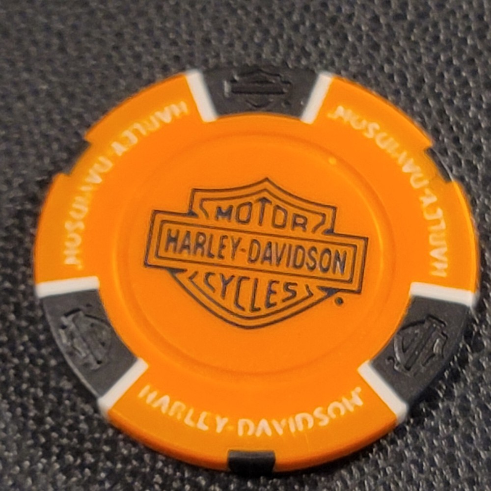 HARLEY DAVIDSON POKER CHIPS/GOLF BALL MARKERS MID AMERICA HARLEY DAVIDSON Columbia, Missouri "Orange/Black" Picture shows the front and back side of the chip! More Harley Davidson Poker Chips/Golf Ball Markers available. See my other auctions in My eBay Store!!!