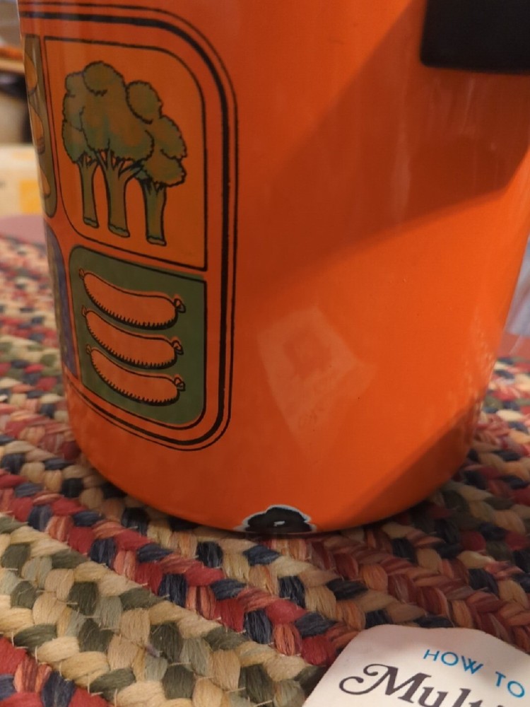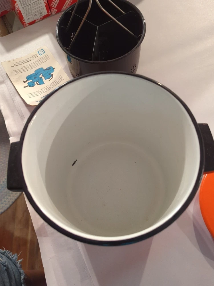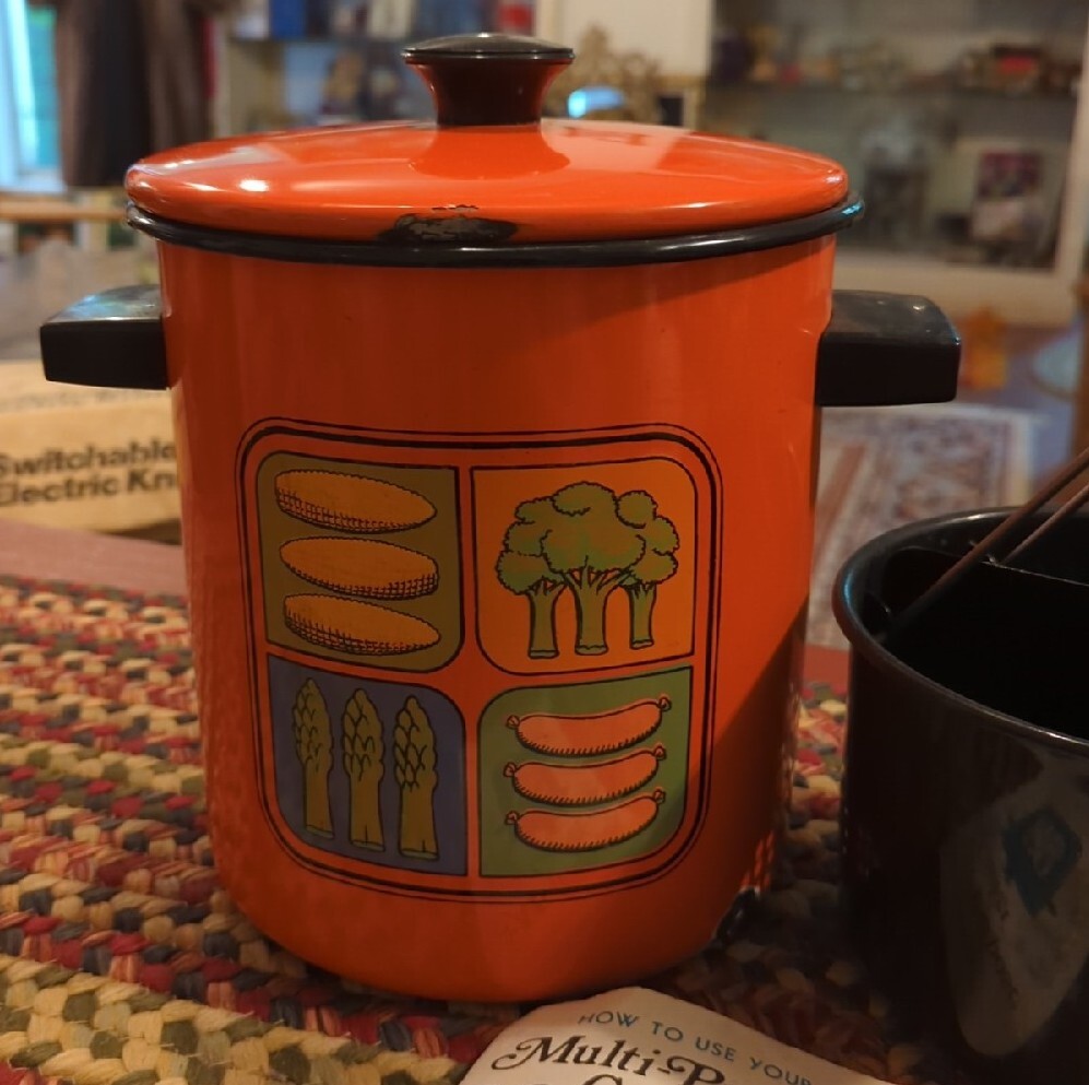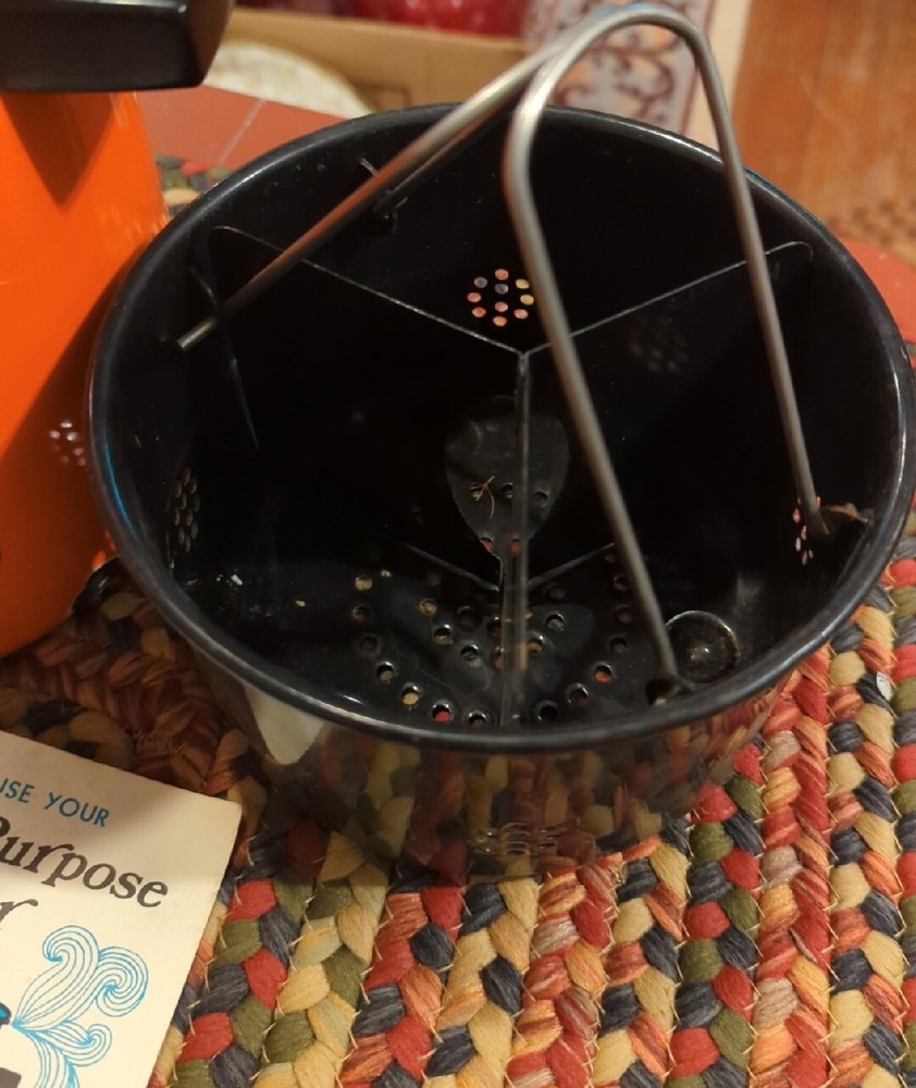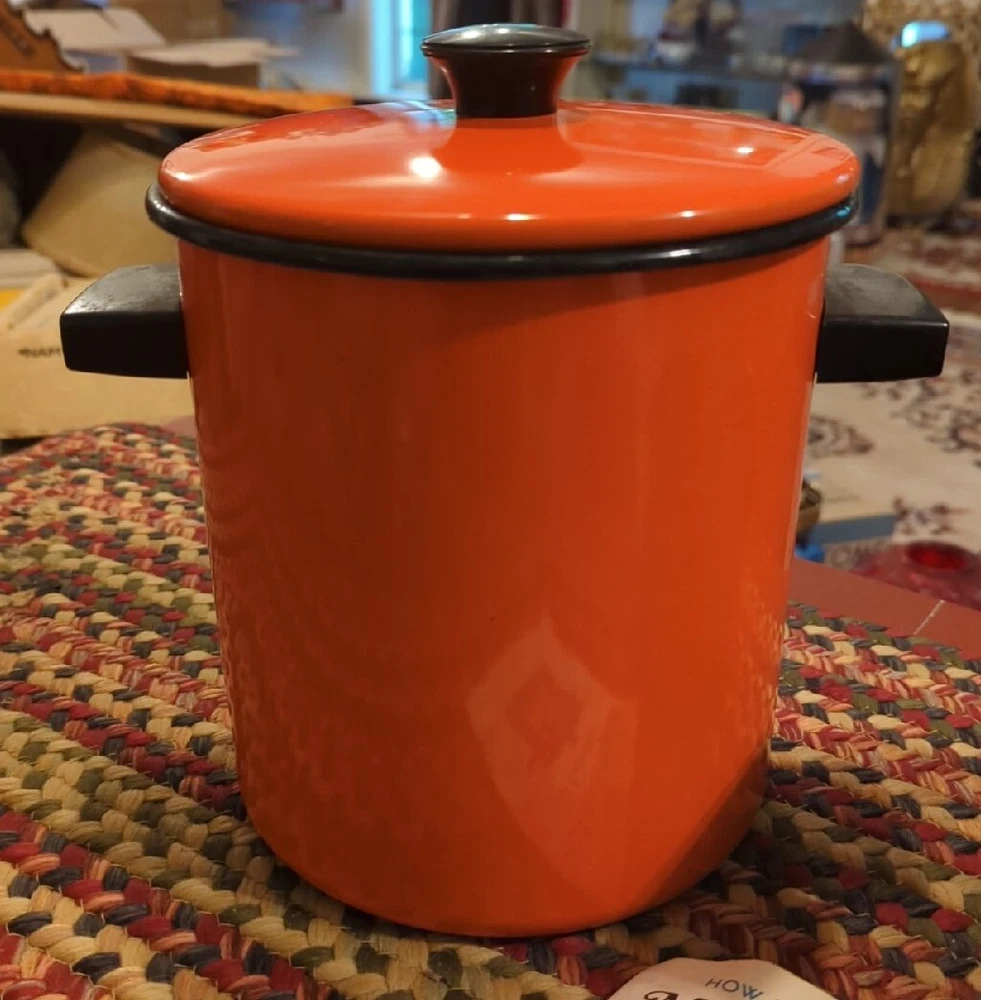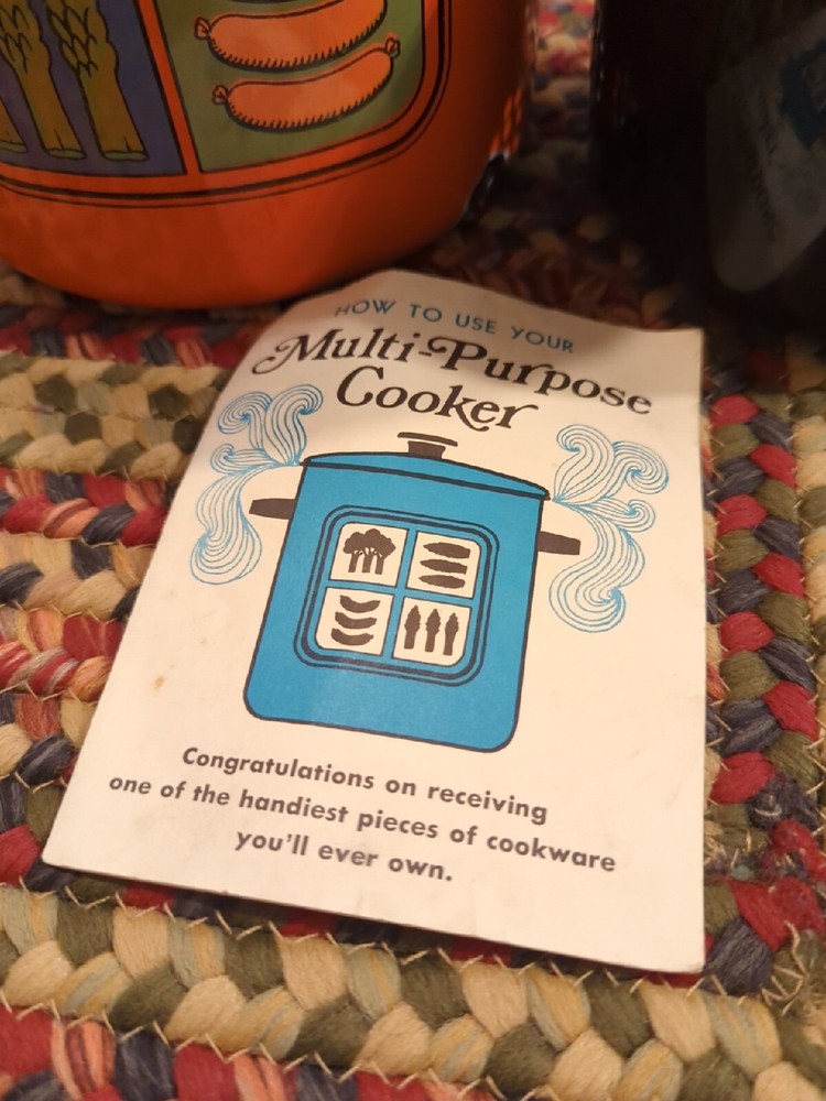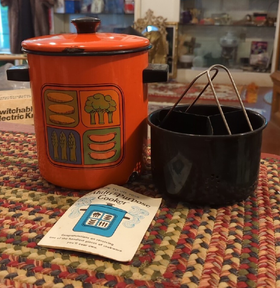MID CENTURY Burnt Orange Multi Purpose Enamel Stovetop Cooker With Insert Basket. This piece is super cool and all original. There is no physical damage except for the normal enamel wear, some light scuffs and scratches but nothing major. Could use a light cleaning upon arrival. The little insert basket on the inside is black with two handles and is enamel as well. Comes with the original instruction booklet. This piece sits on top of a stove. It has no cord, never did and it's not a crock pot. It would be perfect for your vegetables or to cook, pasta, etc. This piece measures 9.75 in tall and without the handles is approximately 6.5 in in diameter and each handle sticks out another inch and a half. Please see all photos, what you see is exactly what you get. This is not brand new but it is in very good. Good vintage mid-century condition. If you have any questions please ask. Happy bidding and good luck!