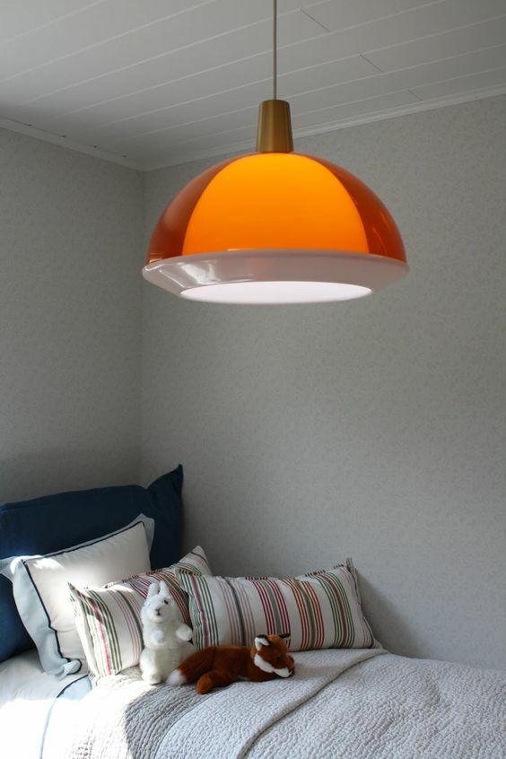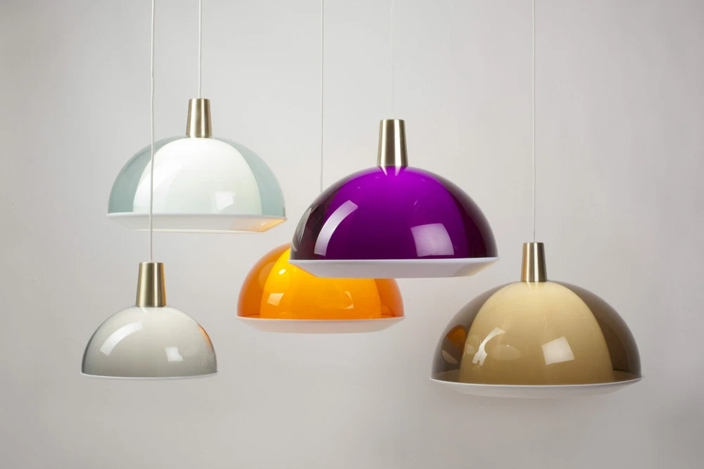 The cheerful "Kuplat" is a timeless classic by Yki Nummi designed in 1959 and still made in Finland. The name "Kuplat" means "bubbles" in Finnish. The lamp consists of two acrylic shades of different colors, one nesting inside the other and is suited for many spaces. The white acrylic inner shade functions as a reflecting surface for the light bulb and brightens the light passing through. The outer transparent acrylic shade comes in choice of colors with brass colored aluminum collar. Available in smoke grey, transparent, purple, sand, red, orange (shown), and aquamarine and in three sizes, 270cm, 400cm, and 480cm. Please see separate listings. Takes standard medium base incandescent bulb, 40W-60W recommended. Comes with ceiling cover and 2m cord for hardwire installation. I have been specialized in retail and interiors of Scandinavian/International modern design for over 50 years and stand behind the authenticity, accuracy, and condition of all my products. Please message me with any questions, comments, or requests. I am always happy to hear from fellow modernists. Good luck and thanks for visiting the Suburbs!