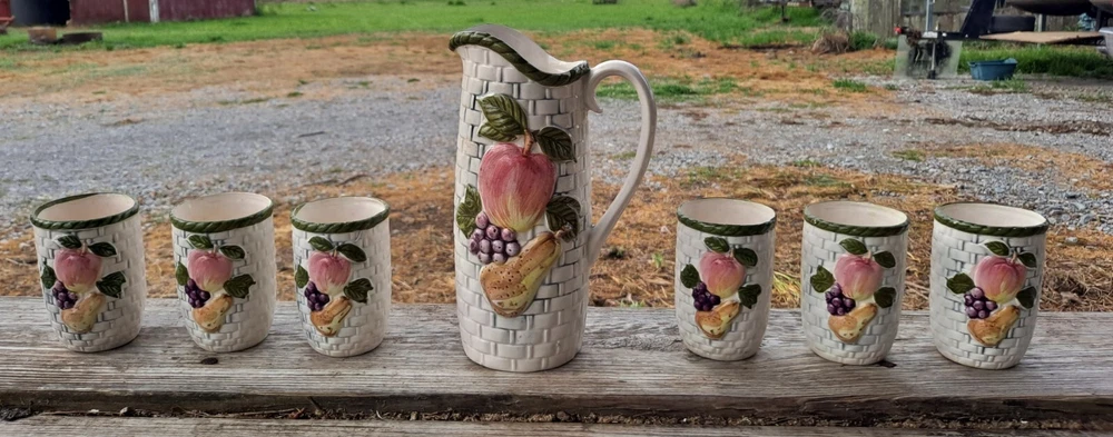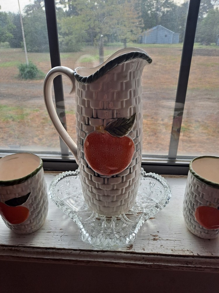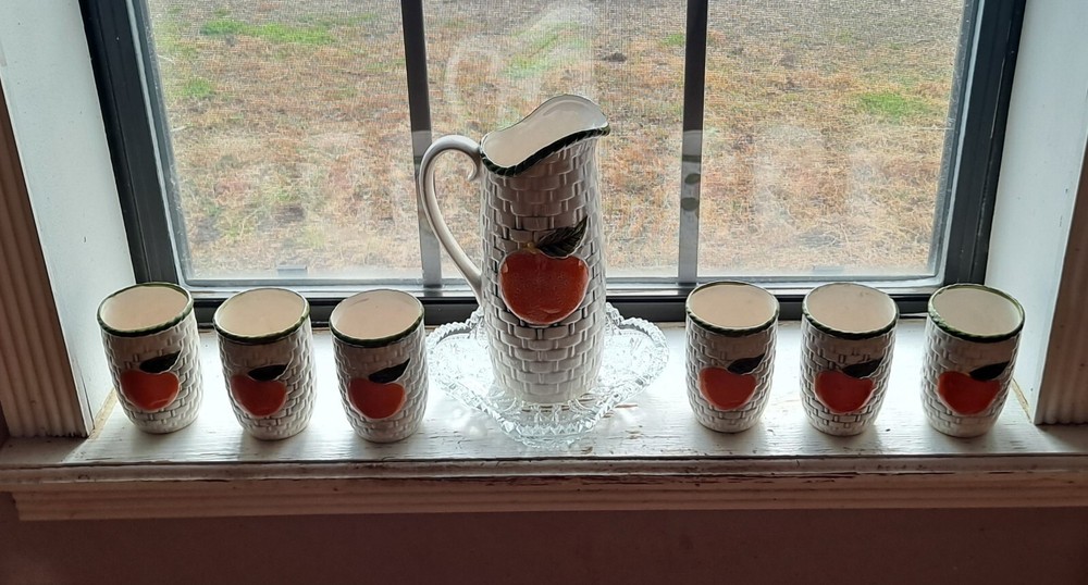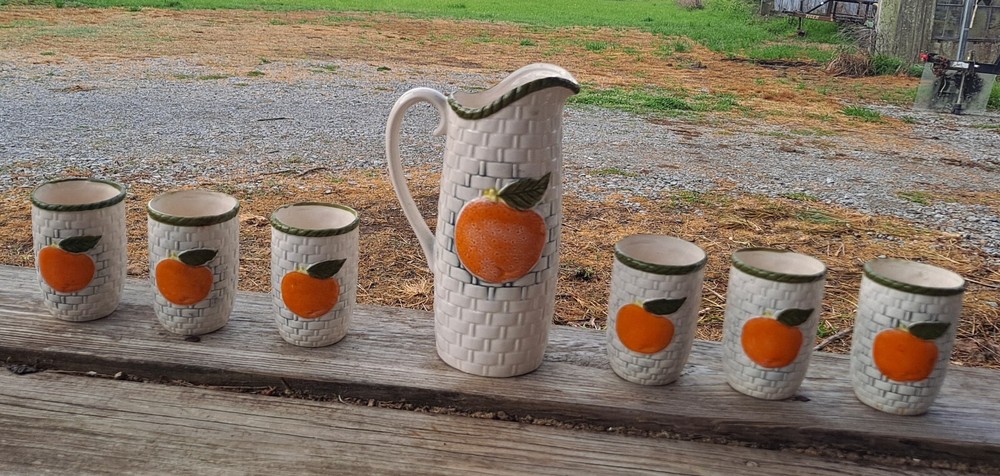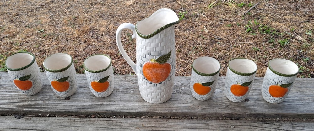MID CENTURY MODERN MADE IN JAPAN CERAMIC BASKET WEAVE 7 PIECE ORANGE JUICE FRUIT VINTAGE BEVERAGE SET. ALL OF THE PIECES REMAIN IN VERY GOOD CONDITION WITH NO CHIPS, CRACKS OR REPAIRS. THE ORIGINAL CHADWICK JAPAN FOIL LABELS REMAIN INTACT.