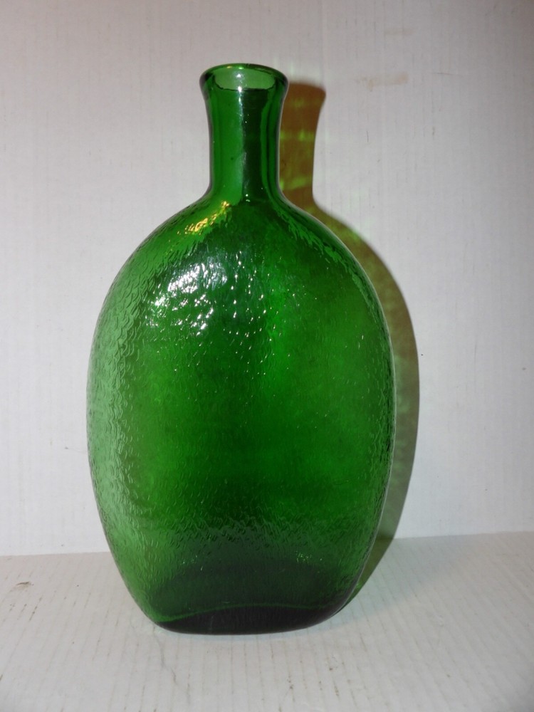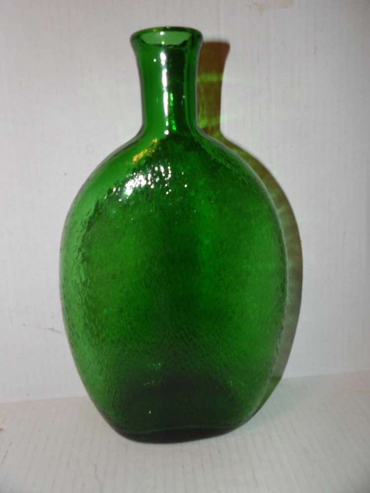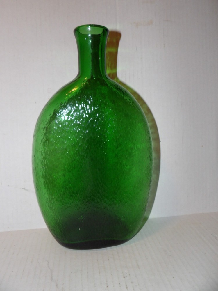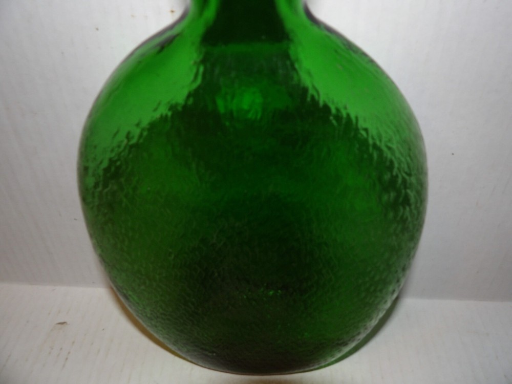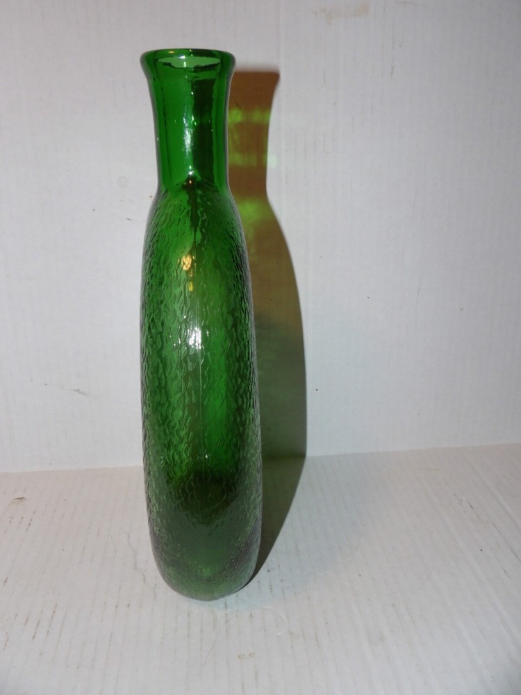 Add a touch of vintage charm to your barware collection with this beautiful Pumpkin Seed shaped Bottle with an orange peel surface of the glass adds a unique texture that is both stylish and eye-catching. This piece stands at 13 inches tall and measures 7.25" inches in width, making it the perfect size for displaying on your shelf or using for storage. The green bottle design is a beautiful addition to any mid-century modern decor. The art glass production style and original/licensed reproduction of this decanter make it a one-of-a-kind piece. Whether you're a collector or simply looking for a unique drinkware item, this unmarked brand decanter is sure to impress.Its in excellent Condition with no chips cracks or damage