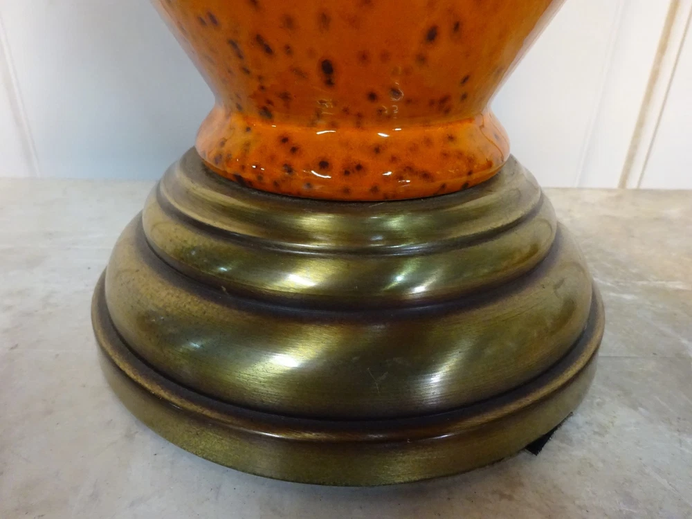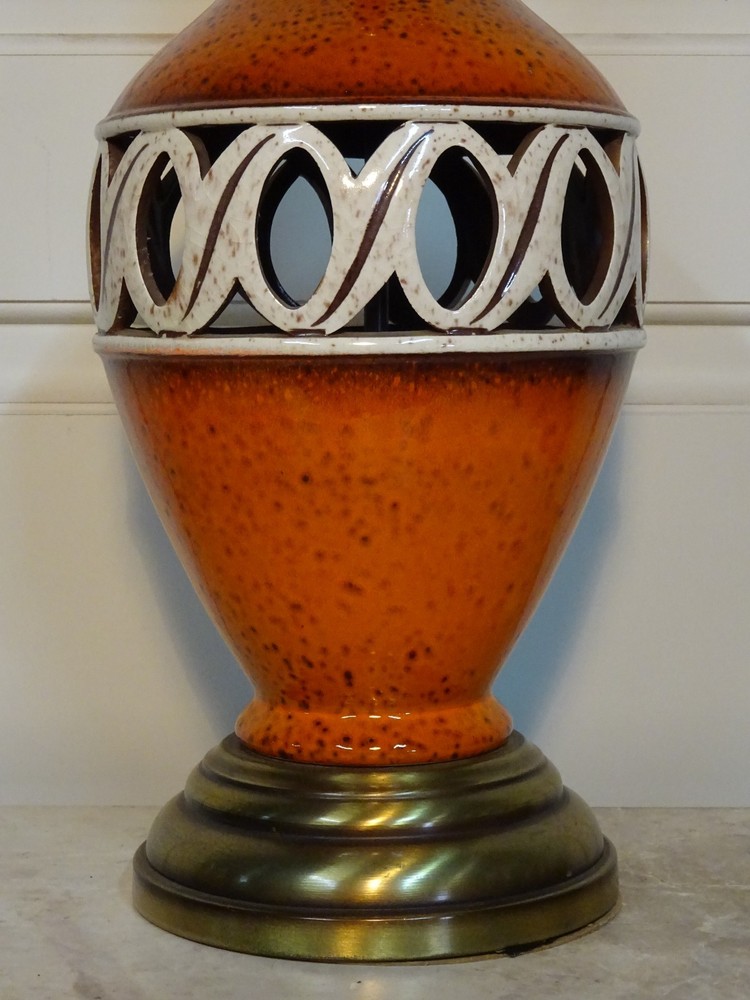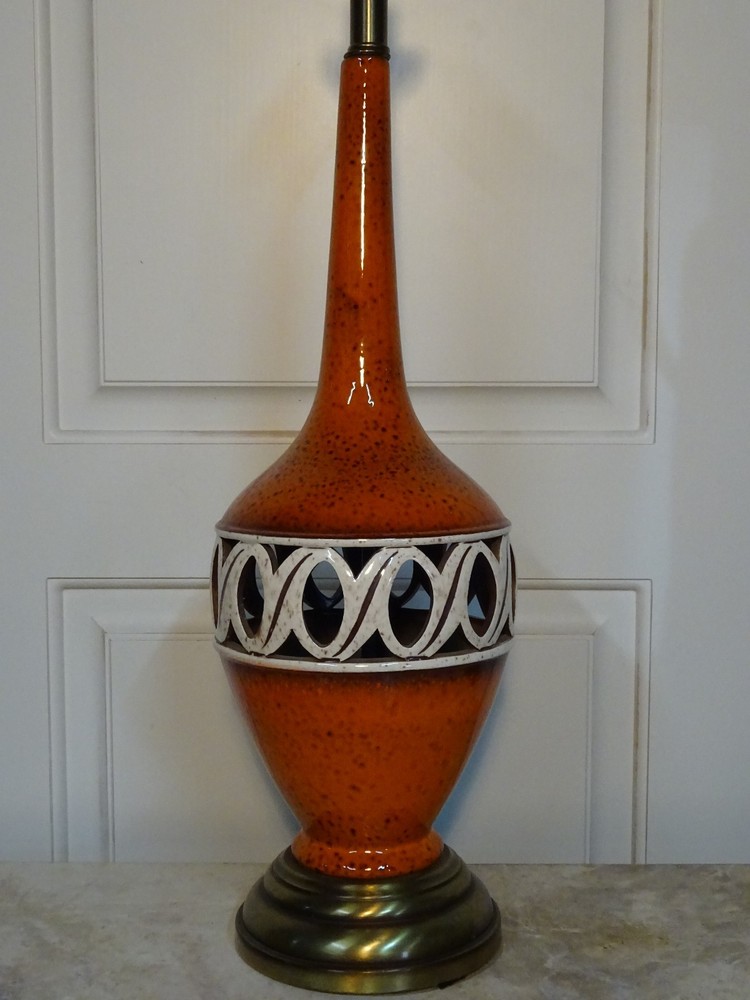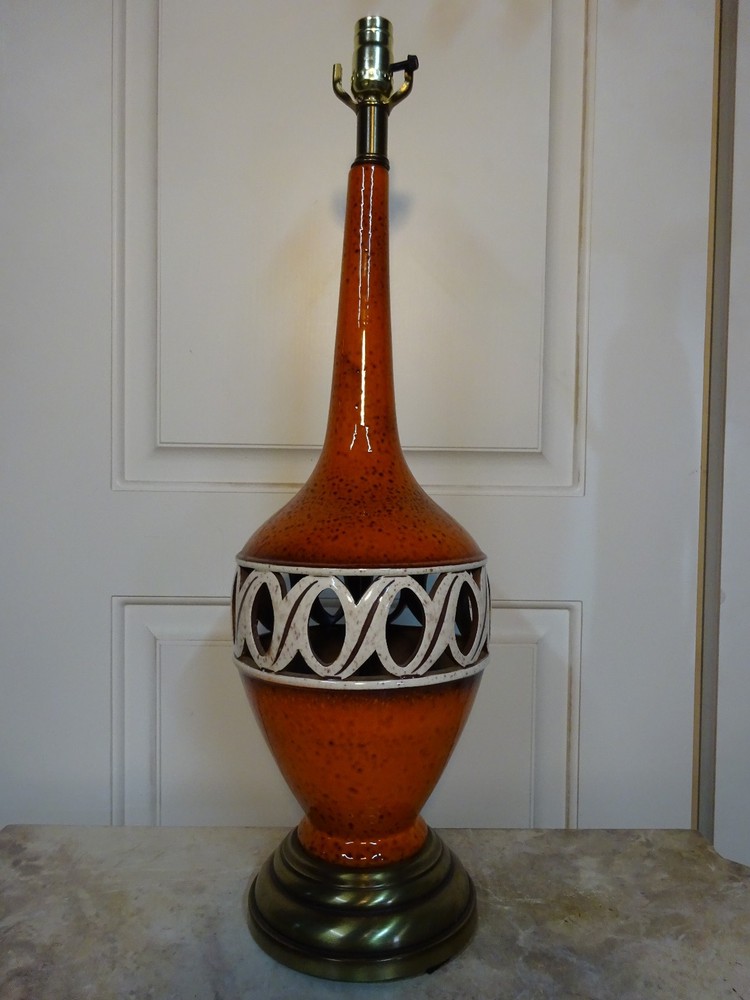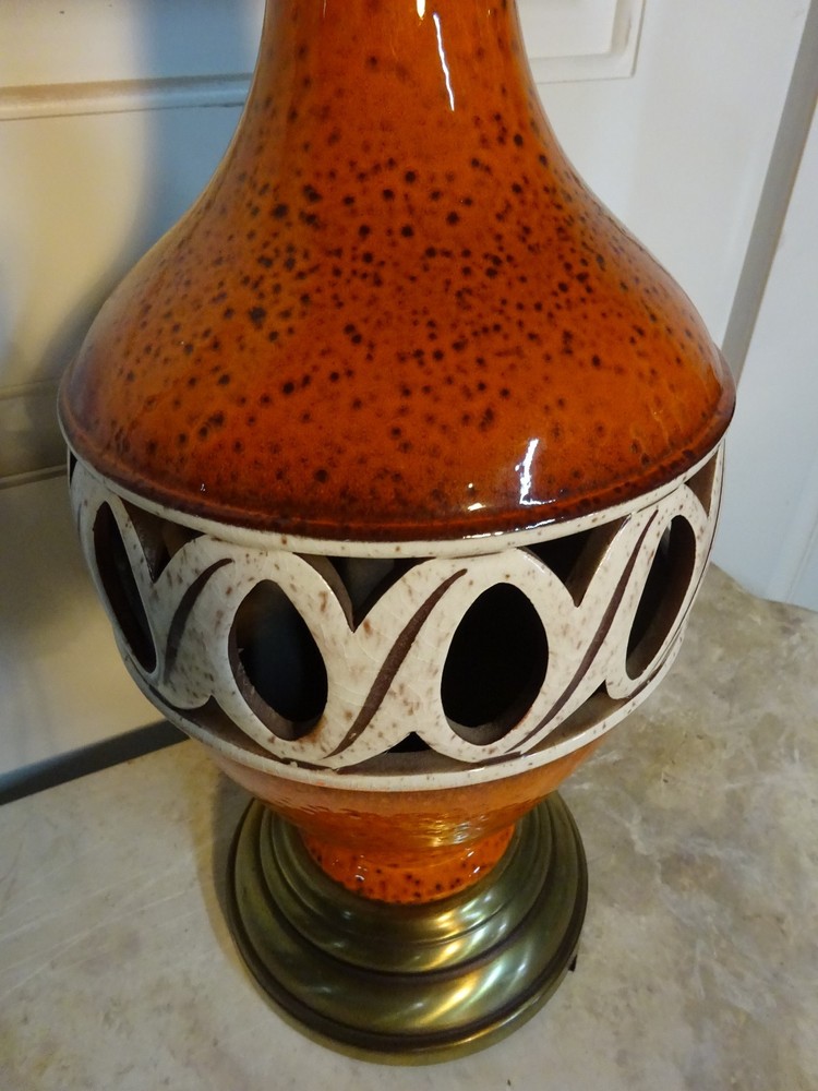 Mid Century Modern Ceramic Lamp. Bittersweet orange speckled glaze. Pierced, openwork center band. Brass base. 8.5" D at bowl x 29" H at top of socket x 7" D at base. Minor crazing on band. See pic. Lamp works however we always recommend rewiring vintage & antique lighting. CHECK OUT MY OTHER EBAY TREASURES & FEEDBACK! ADD ME TO YOUR FAVORITE SELLERS LIST! *By their very nature furnishings & folks of a certain age have time honored wear commensurate with their use. These blemishes & flaws are what give them history & character. Soulful treasures that unlock memories and move effortlessly through the generations, ECHOing the past. This is our collection. An artful mix of the romantic, the unruly, the timeless... the lost and found. Old is Gold.* Please ask questions if you don't see the information you need. WE ARE A COMPLETE ESTATE LIQUIDATION SERVICE. Local delivery available. Personal, white glove delivery within 100 miles of Santa Cruz available for reasonable fee. PICK UP SANTA CRUZ, CA, ALWAYS AN OPTION. ECHO 2544 Soquel Ave., Santa Cruz, CA 95062 Warehouse open to the public Sat 10-4ish