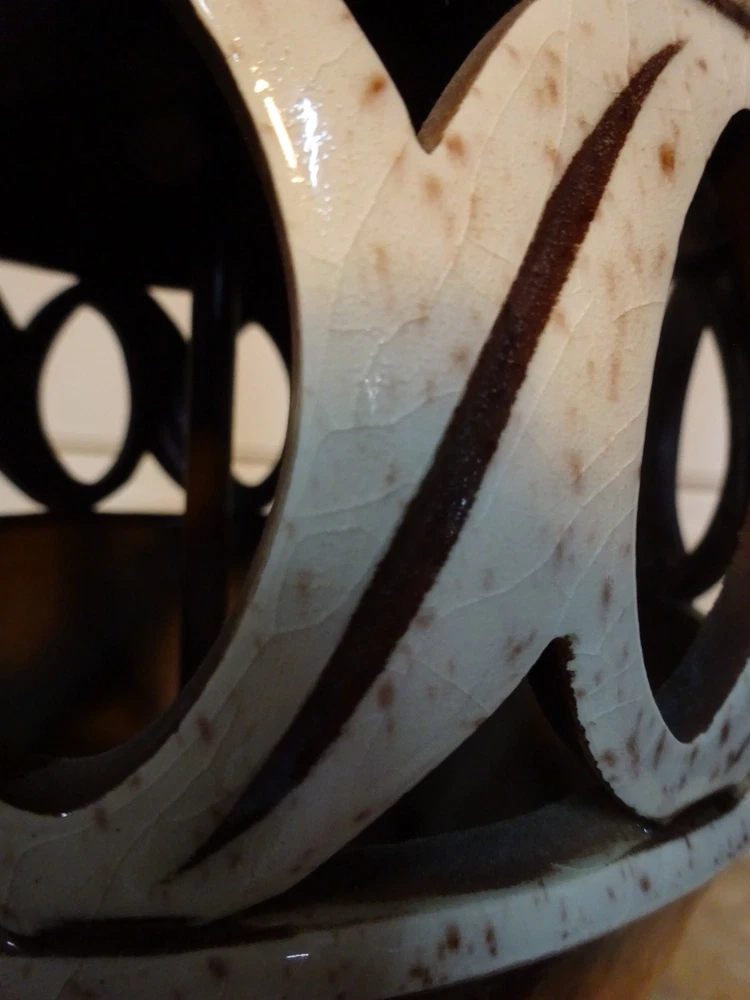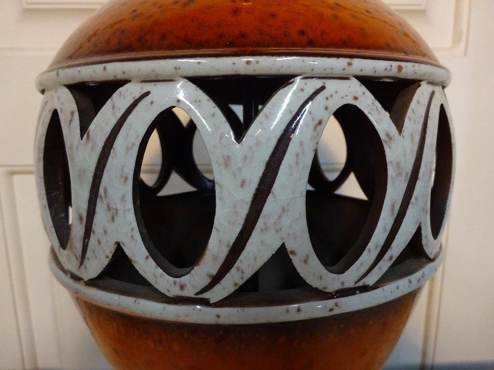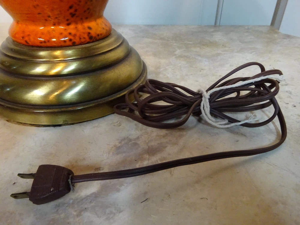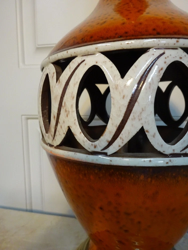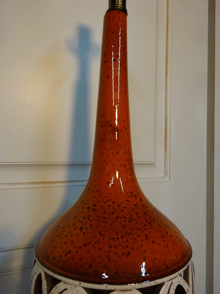 Mid Century Modern Ceramic Lamp. Bittersweet orange speckled glaze. Pierced, openwork center band. Brass base. 8.5" D at bowl x 29" H at top of socket x 7" D at base. Minor crazing on band. See pic. Lamp works however we always recommend rewiring vintage & antique lighting. CHECK OUT MY OTHER EBAY TREASURES & FEEDBACK! ADD ME TO YOUR FAVORITE SELLERS LIST! *By their very nature furnishings & folks of a certain age have time honored wear commensurate with their use. These blemishes & flaws are what give them history & character. Soulful treasures that unlock memories and move effortlessly through the generations, ECHOing the past. This is our collection. An artful mix of the romantic, the unruly, the timeless... the lost and found. Old is Gold.* Please ask questions if you don't see the information you need. WE ARE A COMPLETE ESTATE LIQUIDATION SERVICE. Local delivery available. Personal, white glove delivery within 100 miles of Santa Cruz available for reasonable fee. PICK UP SANTA CRUZ, CA, ALWAYS AN OPTION. ECHO 2544 Soquel Ave., Santa Cruz, CA 95062 Warehouse open to the public Sat 10-4ish