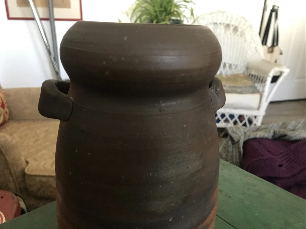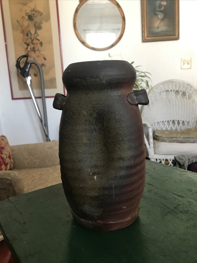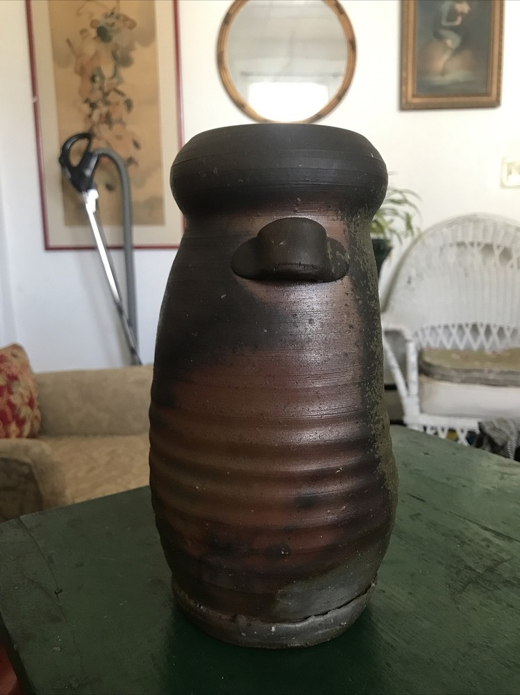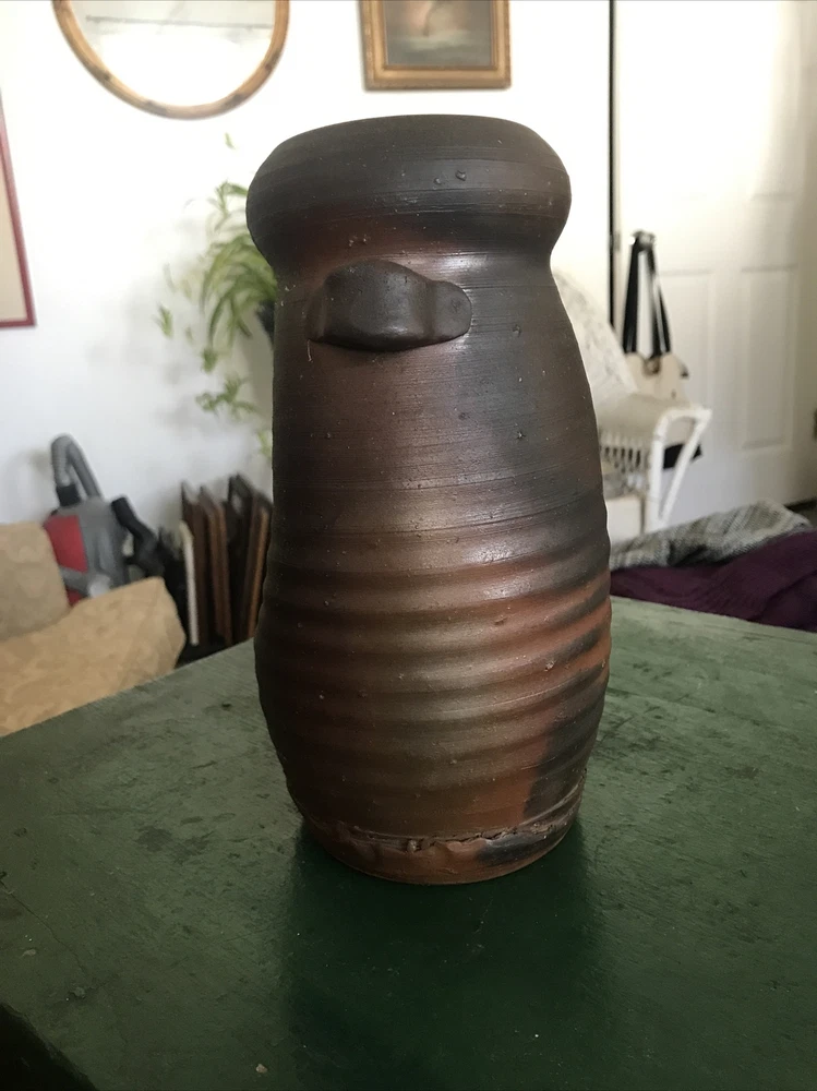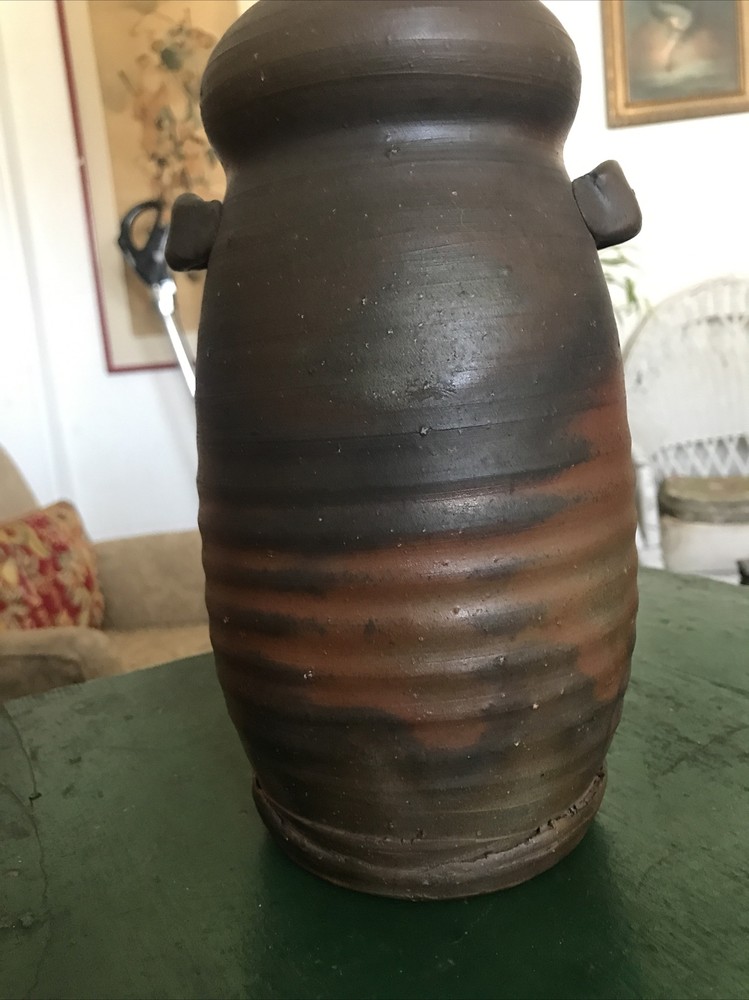 OFFERED HERE IS THIS RICH POTTERY CROCK...OR PERHAPS A VASE,,,CERTAINLY A BEAUTIFUL DISPLAY PIECE. FUNCTION IS CERTAINLY A MID CENTURY PART OF THE ART AND THIS ONE CAN BE ALL THREE. IT IS SIGNED BUT ALWAYS DIFICULT TO IDENTIFY POTTER MARKS. THE COLORS RANGE FROM BURNT ORANGE TO CHOCOLATE BROWN. THE BODY IS RIBBED. THE FEEL IS ROUGH TO THE TOUCH LIKE A SALT GLAZE FINISH. THERE ARE 2 SMALL URN LIKE HANDLES NEAR THE TOP. ONE SIDE OF THE BODY IS HOLLOWED OUT TO A NICE INDENTED CURVE. IT IS QUITE HEAVY WEIGHING IN AT JUST UNDER 3 LBS. THE HEIGHT IS 9 INCHES. CENTER BODY MEASURES 5 BY 5 INCHES FOR SPACE DISPLACEMENT. DIAMETER OF THE BASE IS 4 INCHES AND OF THE MOUTH 3 INCHES. HAPPY BIDDING!