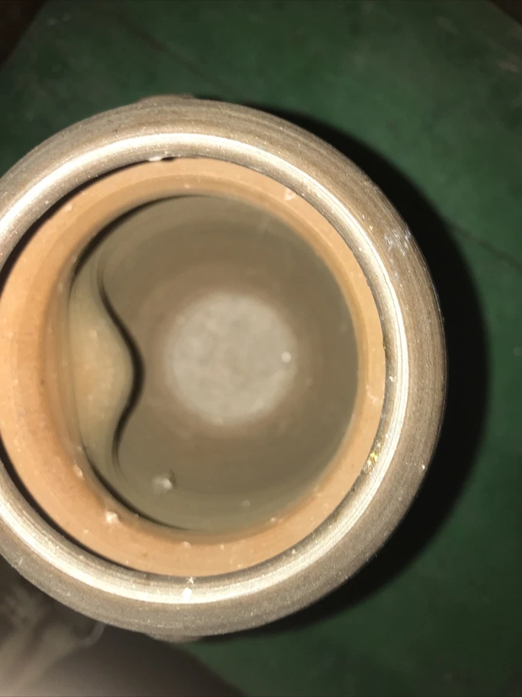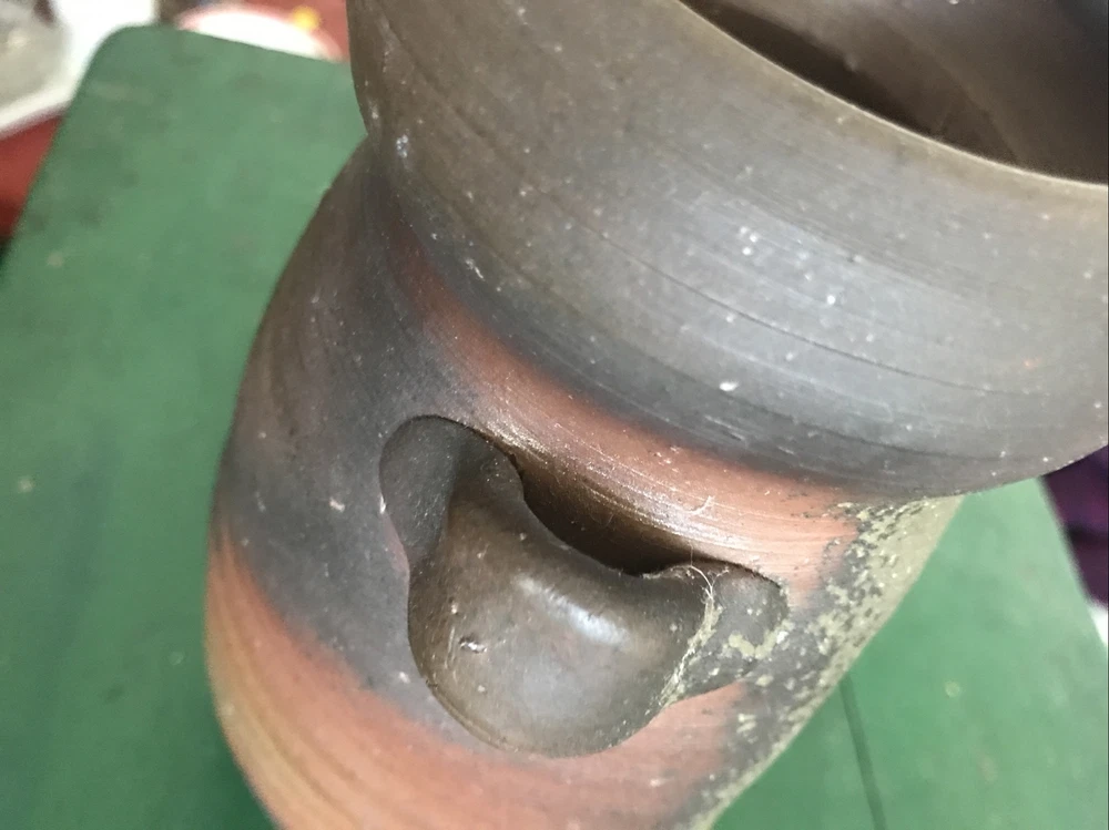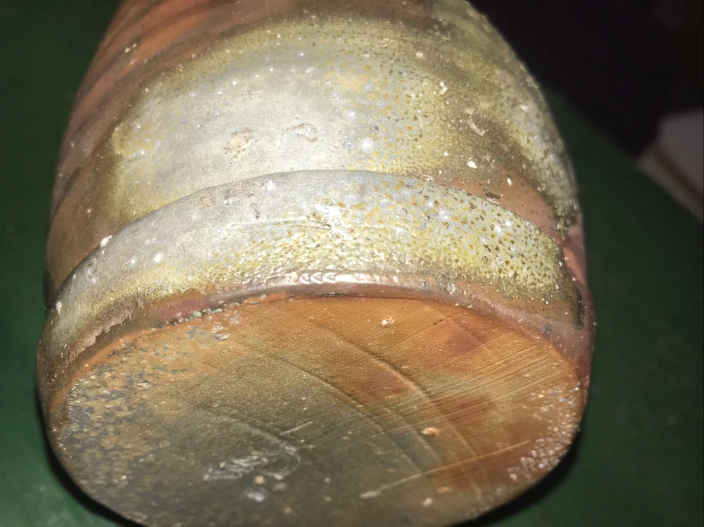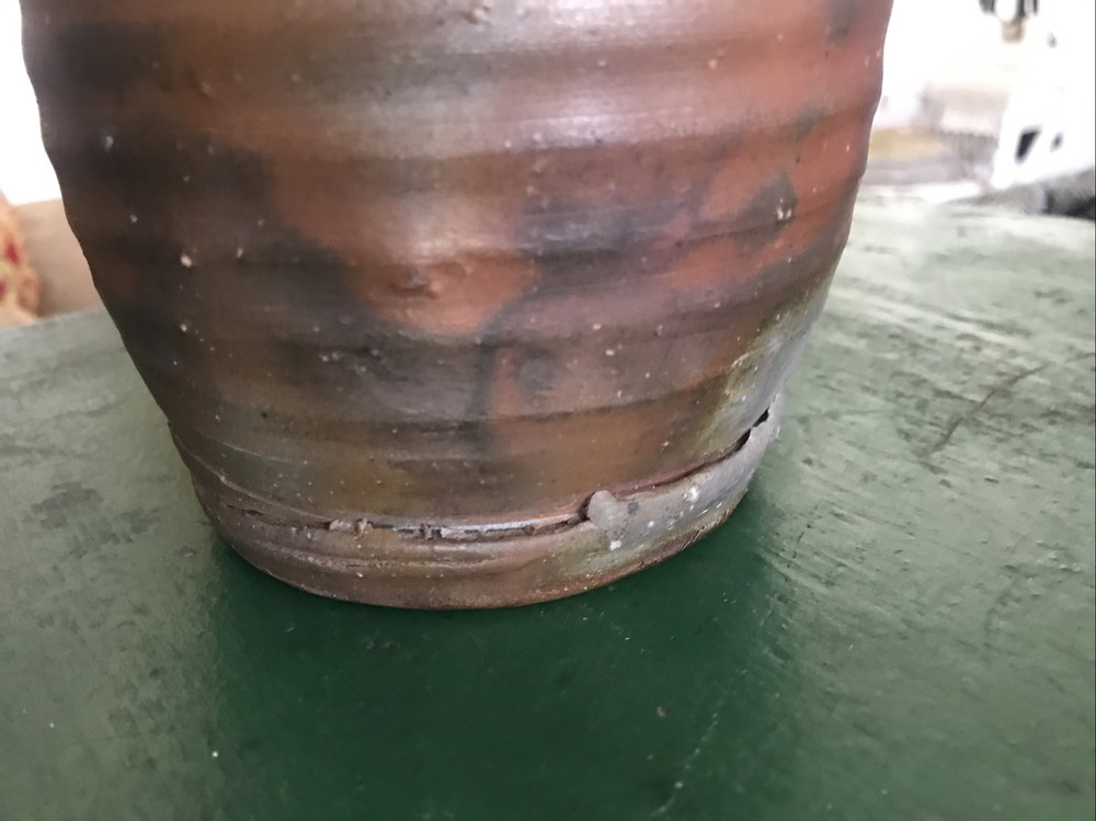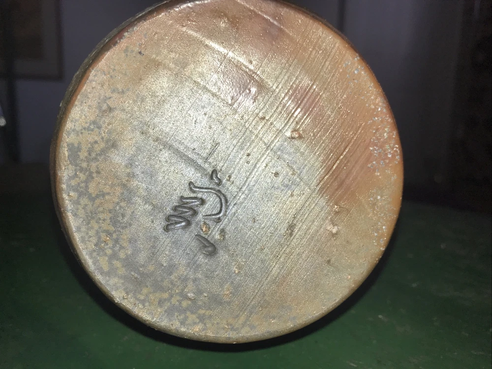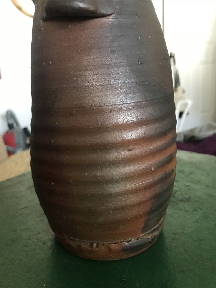 OFFERED HERE IS THIS RICH POTTERY CROCK...OR PERHAPS A VASE,,,CERTAINLY A BEAUTIFUL DISPLAY PIECE. FUNCTION IS CERTAINLY A MID CENTURY PART OF THE ART AND THIS ONE CAN BE ALL THREE. IT IS SIGNED BUT ALWAYS DIFICULT TO IDENTIFY POTTER MARKS. THE COLORS RANGE FROM BURNT ORANGE TO CHOCOLATE BROWN. THE BODY IS RIBBED. THE FEEL IS ROUGH TO THE TOUCH LIKE A SALT GLAZE FINISH. THERE ARE 2 SMALL URN LIKE HANDLES NEAR THE TOP. ONE SIDE OF THE BODY IS HOLLOWED OUT TO A NICE INDENTED CURVE. IT IS QUITE HEAVY WEIGHING IN AT JUST UNDER 3 LBS. THE HEIGHT IS 9 INCHES. CENTER BODY MEASURES 5 BY 5 INCHES FOR SPACE DISPLACEMENT. DIAMETER OF THE BASE IS 4 INCHES AND OF THE MOUTH 3 INCHES. HAPPY BIDDING!