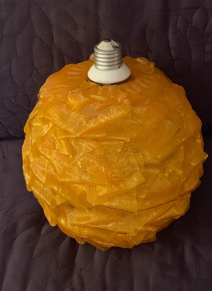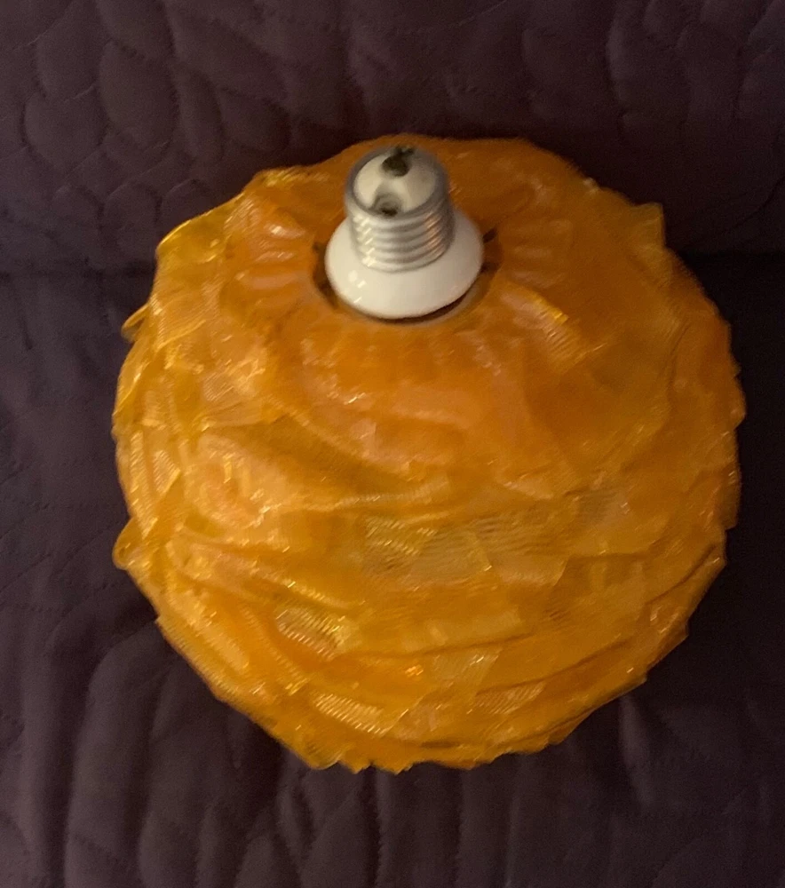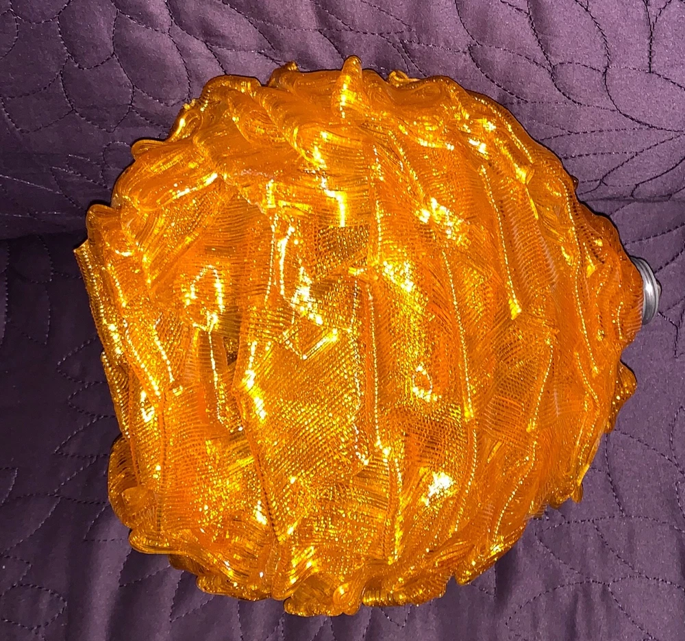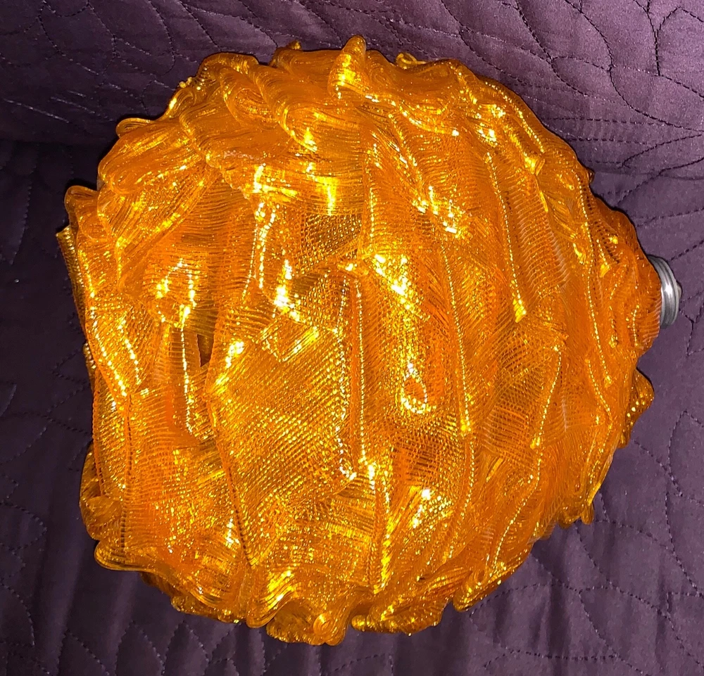 MID CENTURY MODERN RIBBON SHADE WITH FIXTURE ORANGE VINTAGE CHUNKY GLOBE 7 INCH GLOBE (approx) WITH WORKING FIXTURE Vintage mid century orange acrylic. Very good condition with some nicks and chips to ribbon edges and ends from handling. Typical of these shades. They can be hard to see so look closely and use the zoom tool. Looks great when lit. Nice to find one with a socket fixture mounted into the shade.