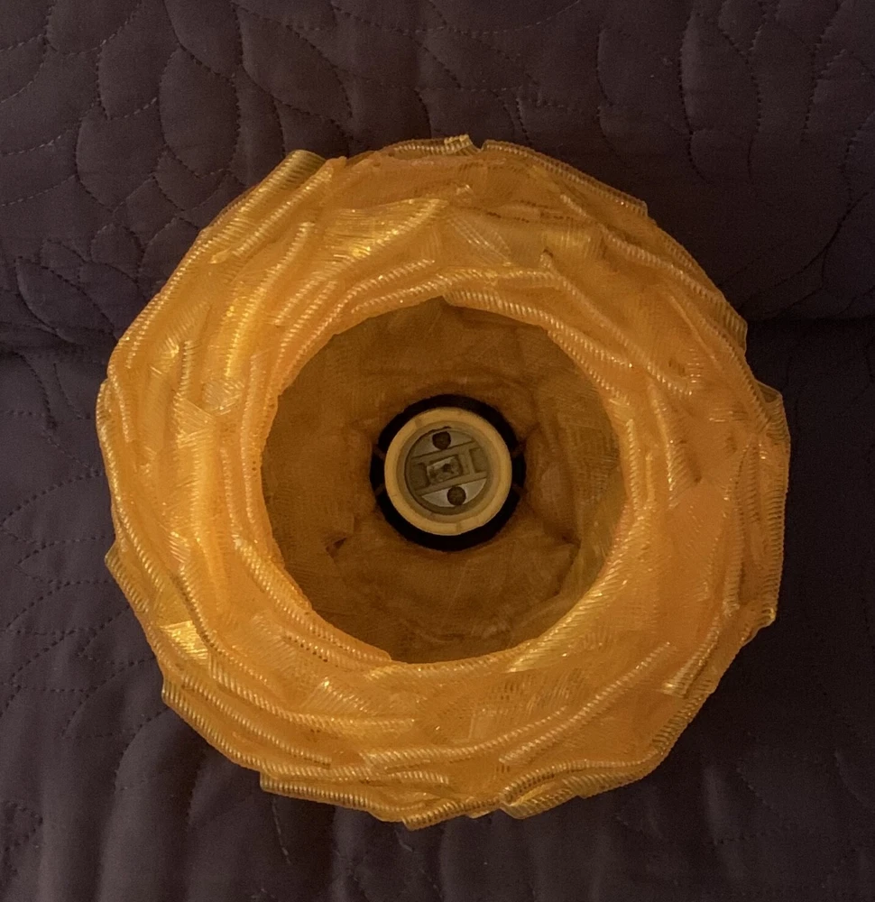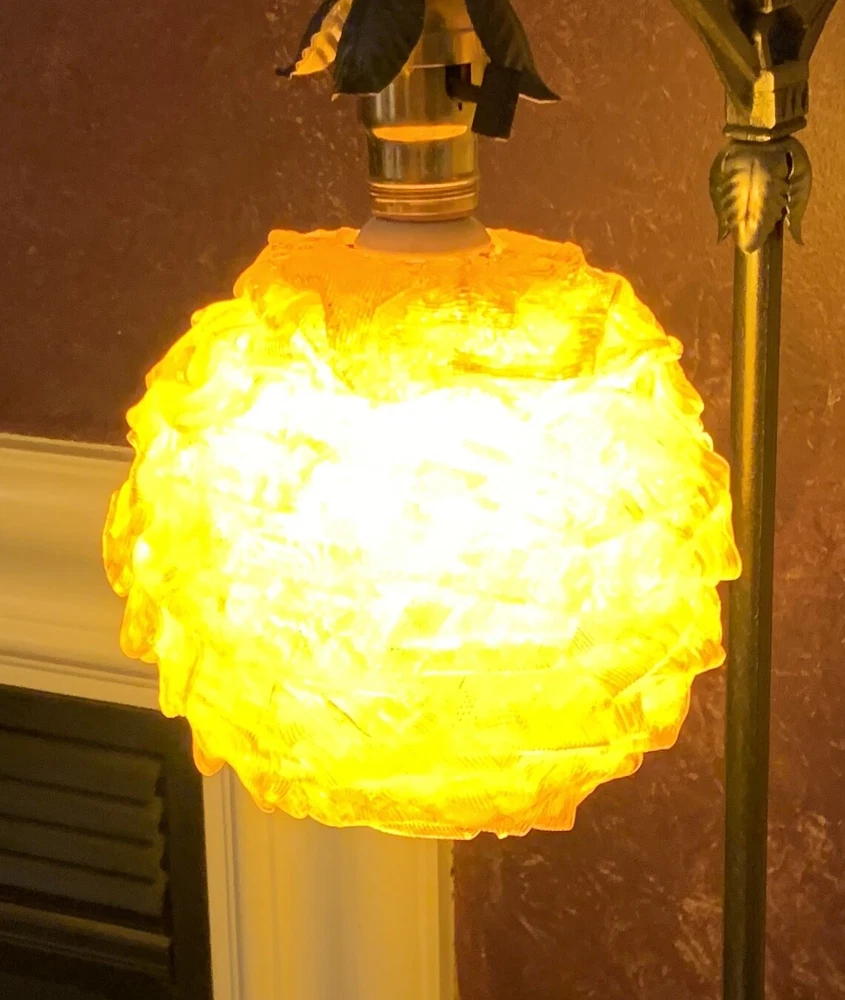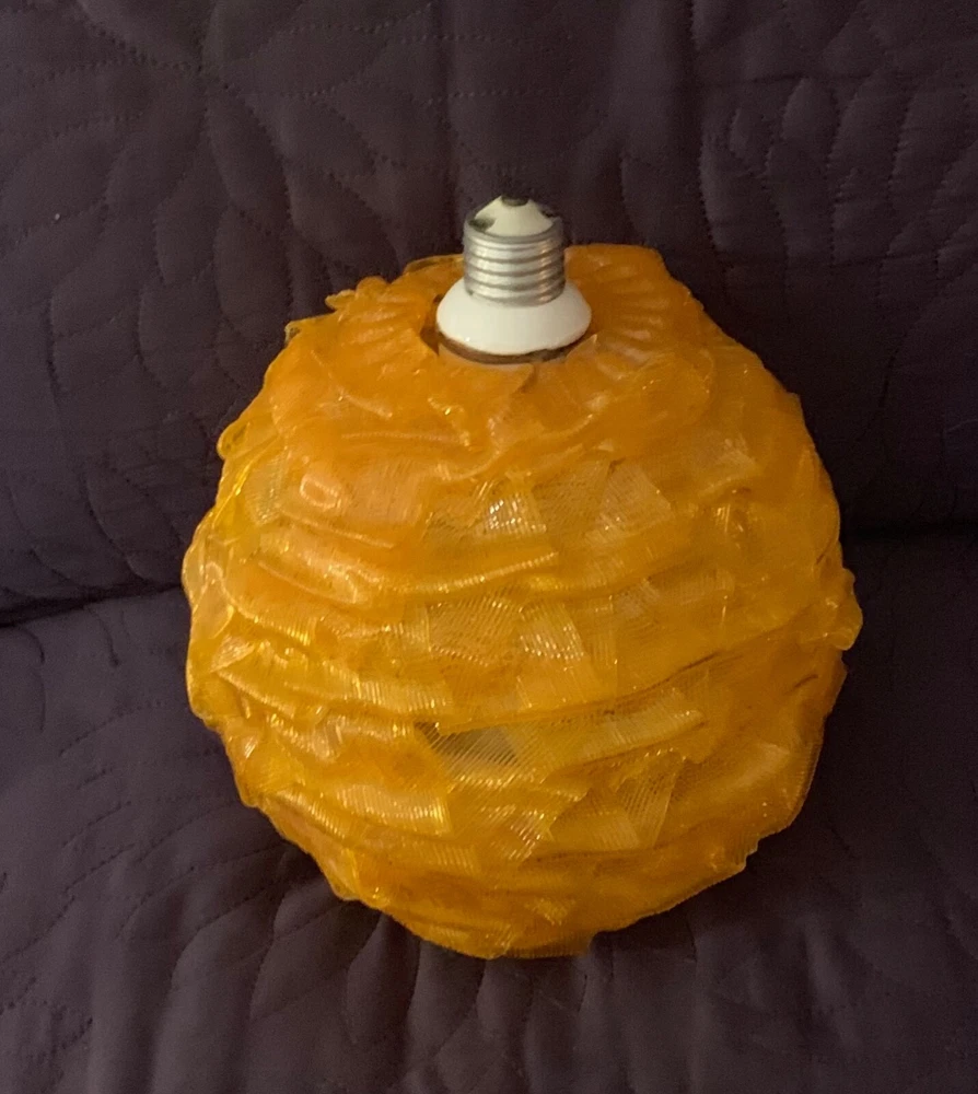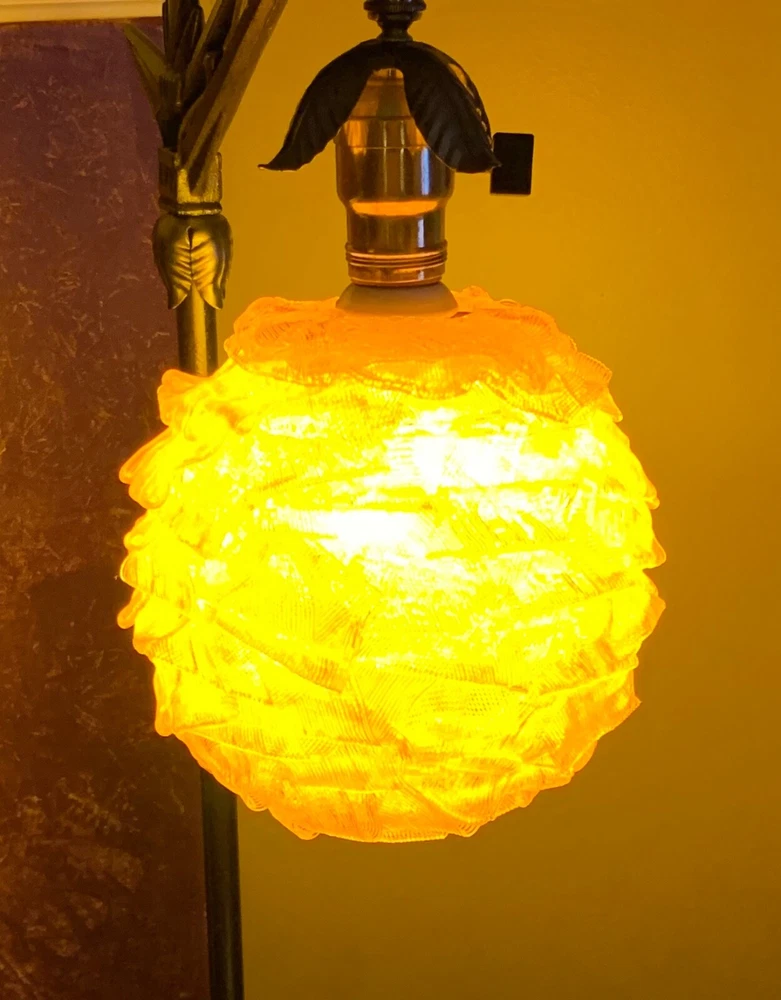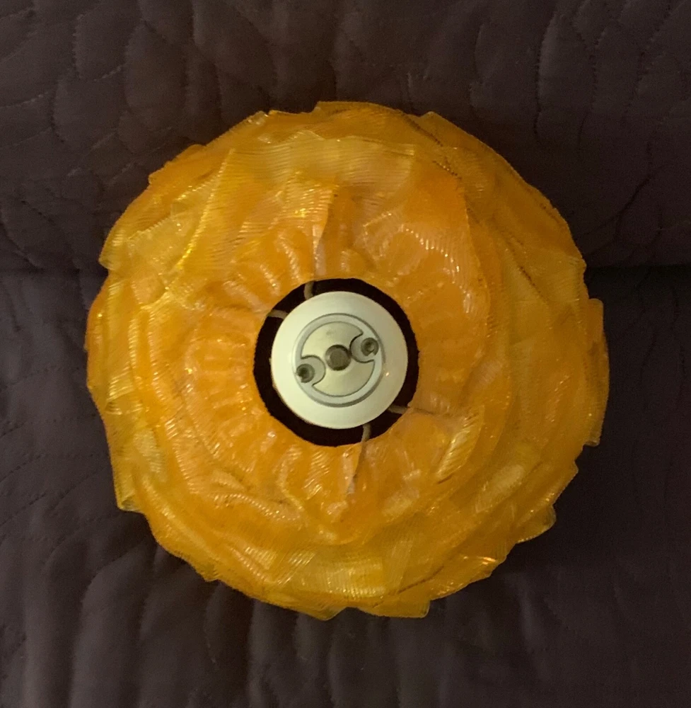 MID CENTURY MODERN RIBBON SHADE WITH FIXTURE ORANGE VINTAGE CHUNKY GLOBE 7 INCH GLOBE (approx) WITH WORKING FIXTURE Vintage mid century orange acrylic. Very good condition with some nicks and chips to ribbon edges and ends from handling. Typical of these shades. They can be hard to see so look closely and use the zoom tool. Looks great when lit. Nice to find one with a socket fixture mounted into the shade.