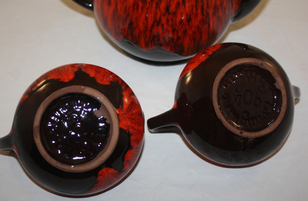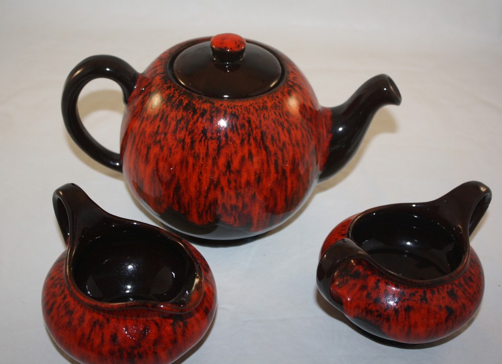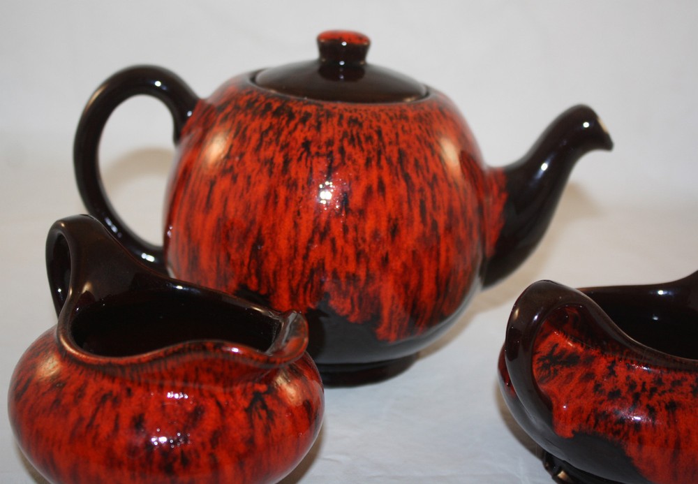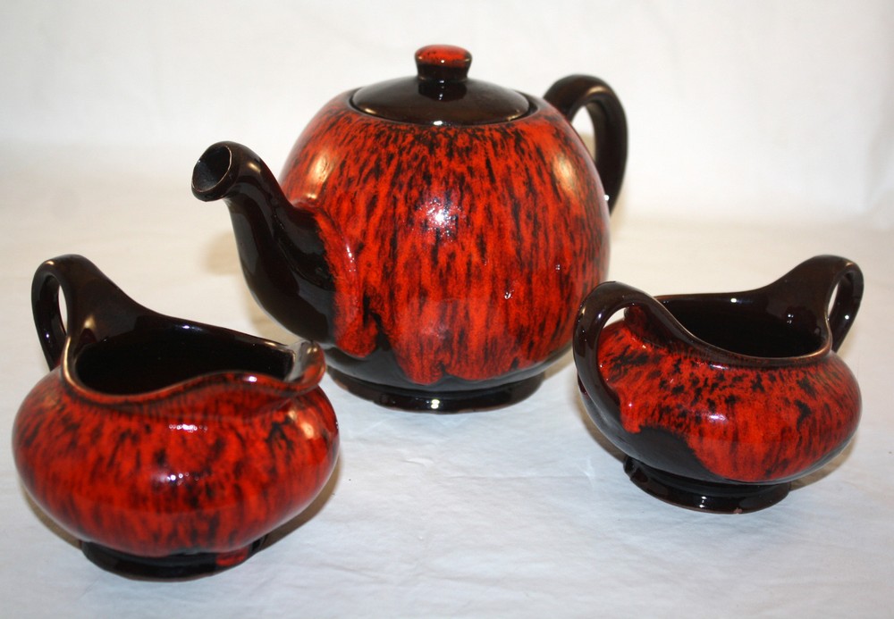 HELLO AND WELCOME TO MY STORE FOR SALE VINTAGE CANUCK POTTERY, CANADA EVANGELINE ORANGE DRIP MID CENTURY c.1960 TEA SET, TEAPOT, CREAMER AND SUGAR MINT CONDITION THANK YOU FOR LOOKING I am HONEST, I ship quickly, wrap my items carefully. I guarantee authenticity of my items. Please leave feedback and I will do the same. thank You