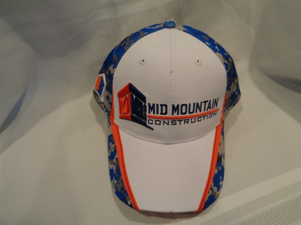 Mid Mountain Construction Men's baseball hat! Brand new. Features the Mid Mountain Construction logo embroidered in blue and orange thread on white cap. A great new hat for anyone! One size fits all. ...