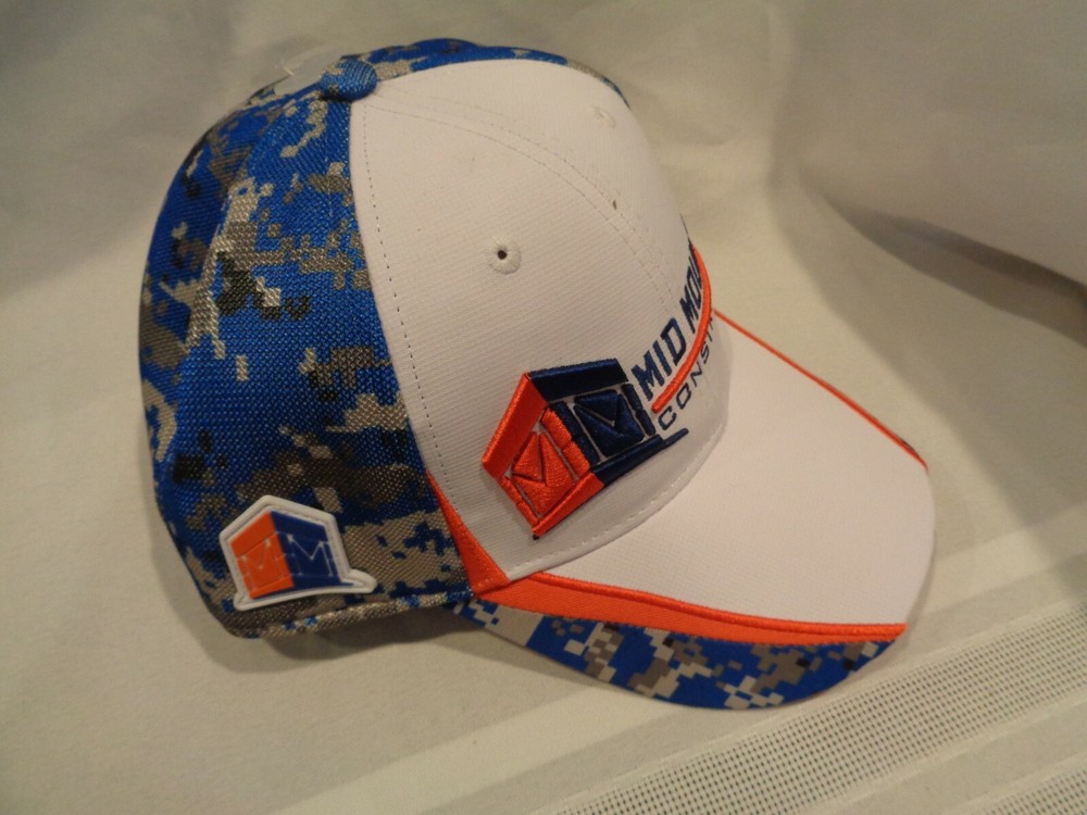Mid Mountain Construction Men's baseball hat! Brand new. Features the Mid Mountain Construction logo embroidered in blue and orange thread on white cap. A great new hat for anyone! One size fits all. Made in China.