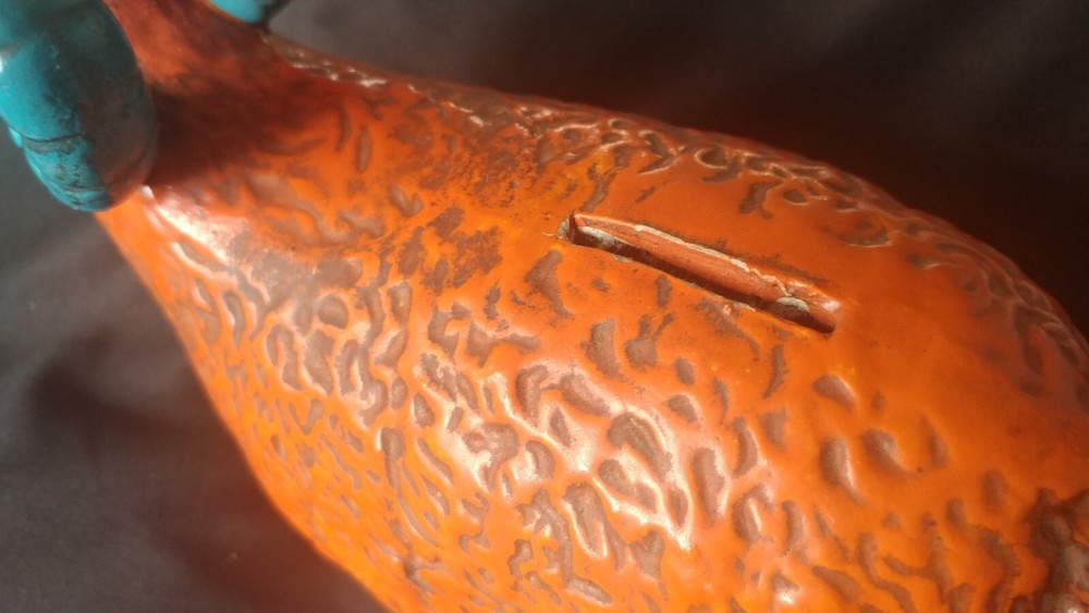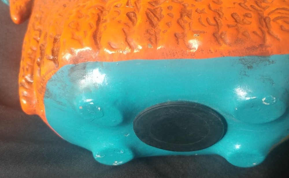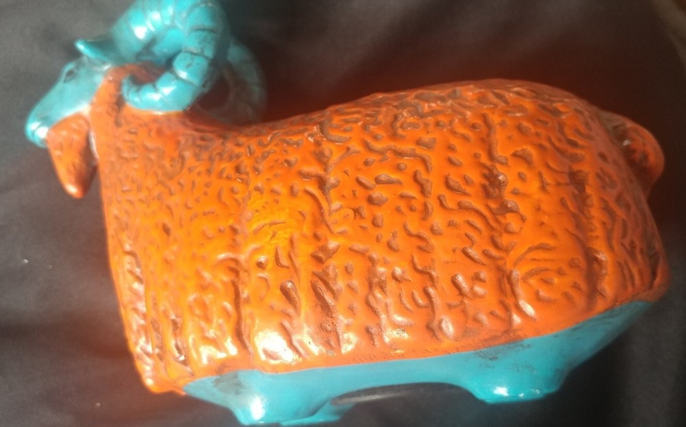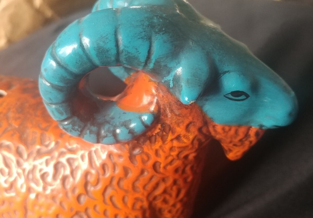 MID-CENTURY MODERN Blue and Orange Ram bank. Bank has a great look and is in excellent condition. It measures 8" long by 5 1/2" tall....